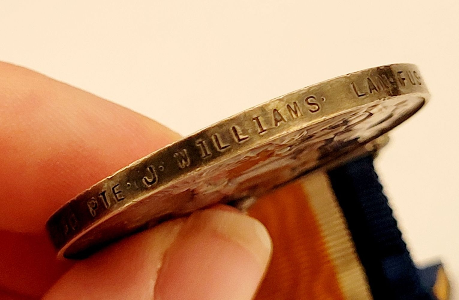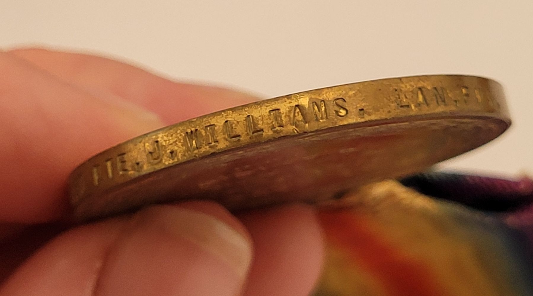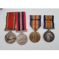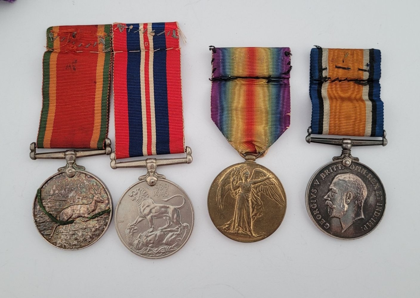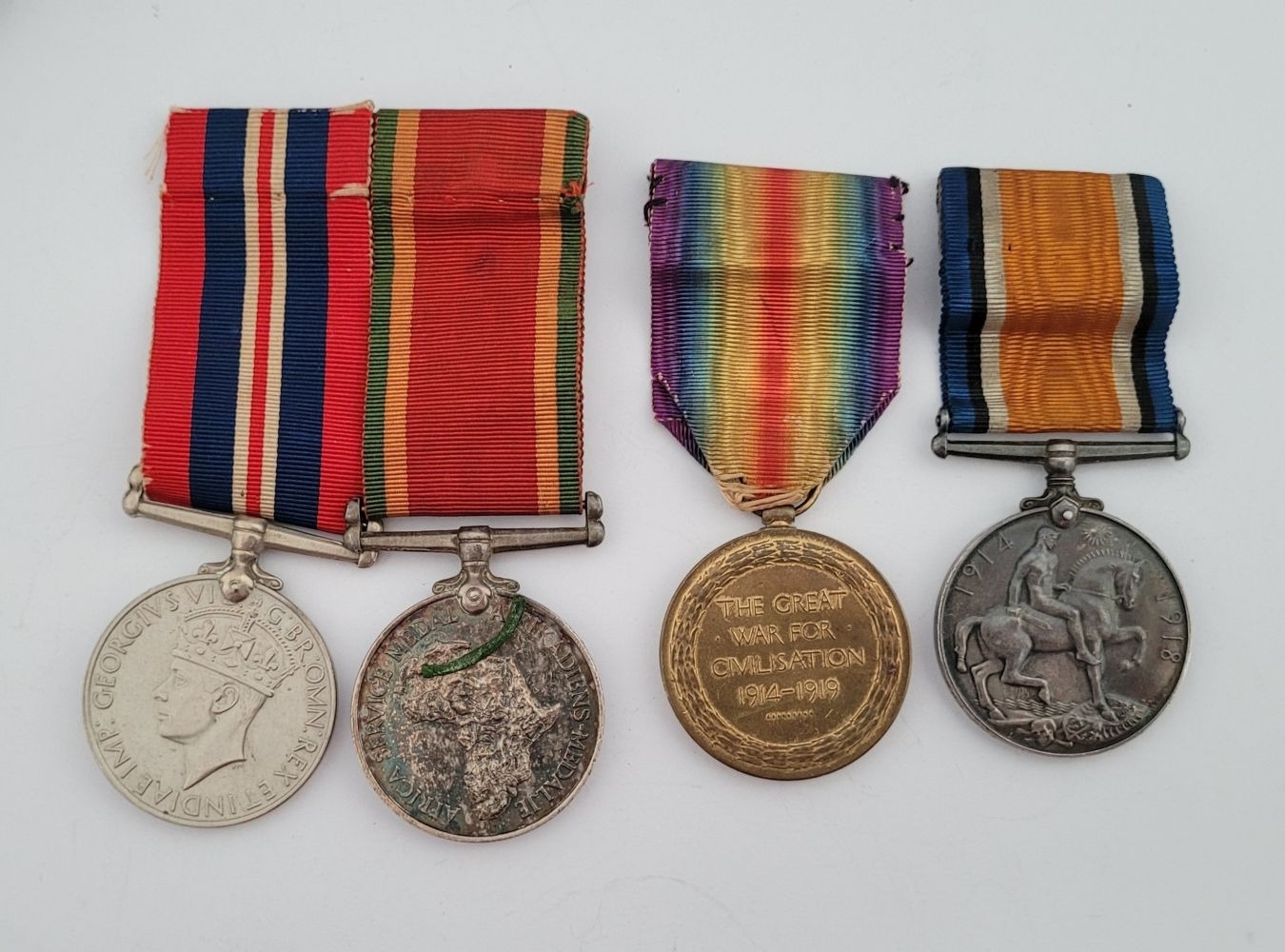 A COLLECTION OF WAR MEDALS, including: (i) A 1939 – 1945 War Medal, with blue, white & red ribbon. (ii) An African WW2 service medal, with green, gold & Red ribbon, (iii) The Great War for Civilisation 1914-1919, Victory Medal, with rainbow coloured ribbon. (iv) A British War Medal 1914-1918, Grenadier Guards, with blue, black, white and gold ribbon (4)