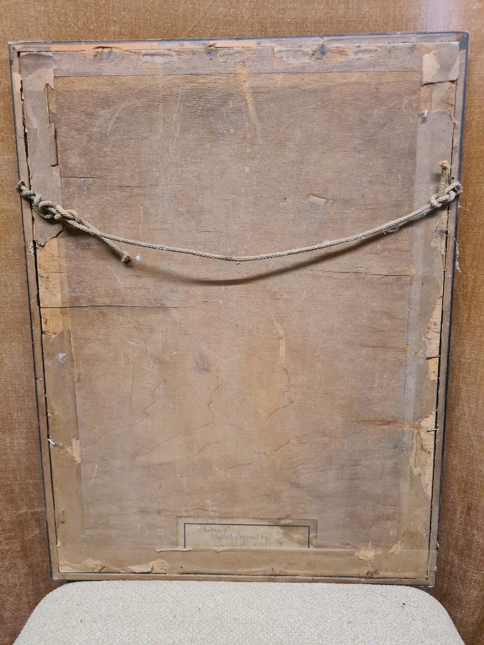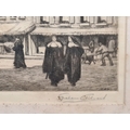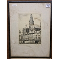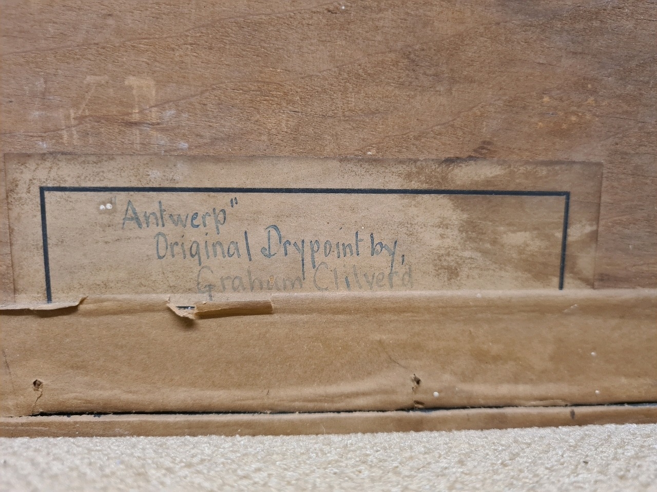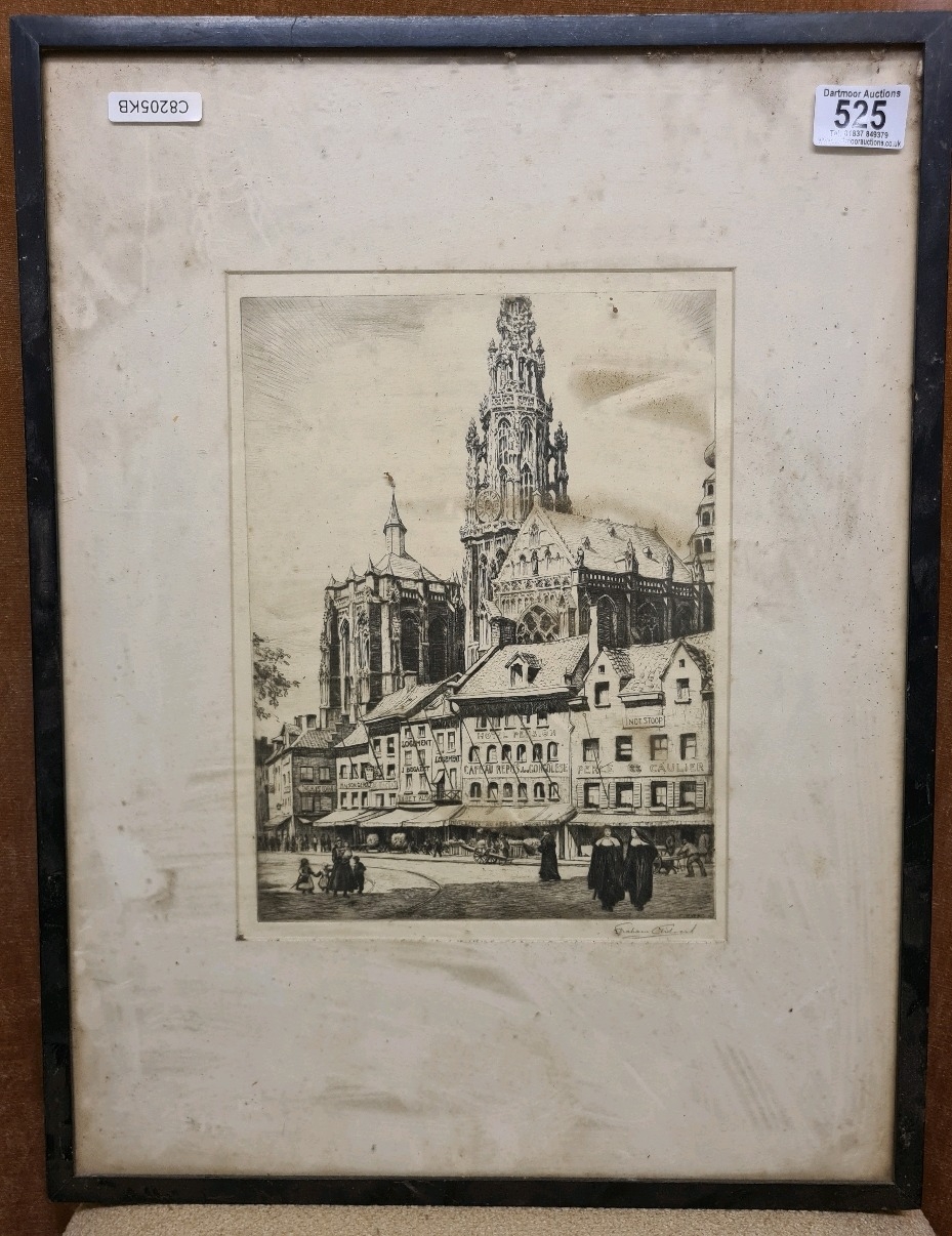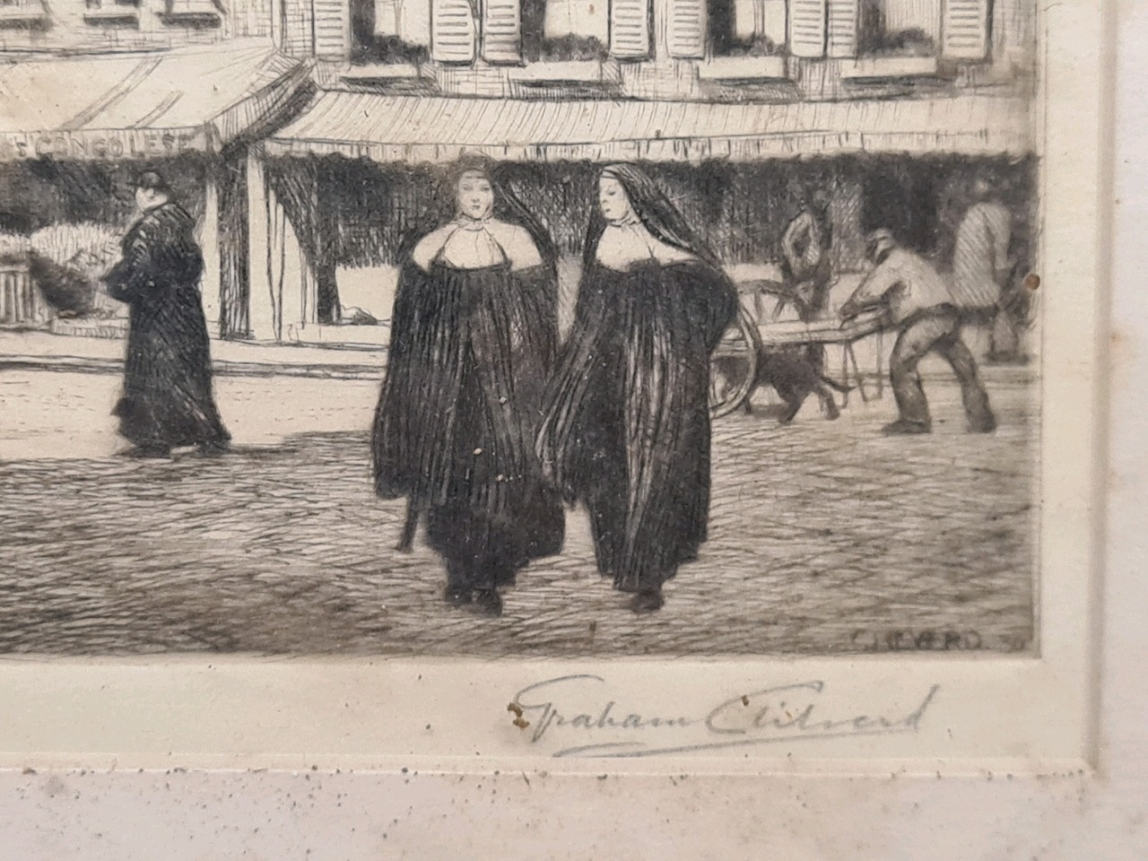 Framed drypoint ink picture by Graham Clilverd of an Antwerp city scene with nuns in the foreground. Frame measures 32cm x 40cm