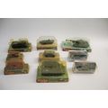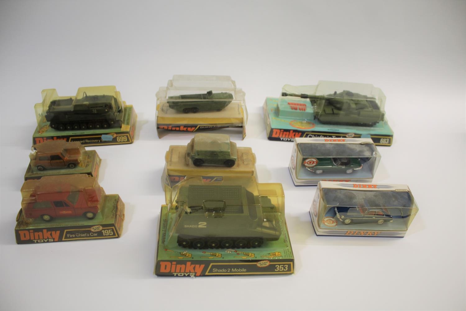 DINKY TOYS various boxed models including 353 Shado 2 Mobile (green body and silver tracks), 699 Leopard Recovery Truck, 680 Ferret Armoured Car, 683 Chieftain Tank, 681 DUKW Amphibian, 195 Fire Chief Car, 178 Mini Clubman, DY-3 M G B, and DY-1 1968 Jaguar. (9)
