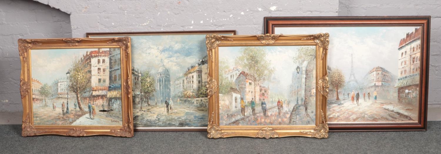 Burnett, Four framed oil on canvas street scenes.