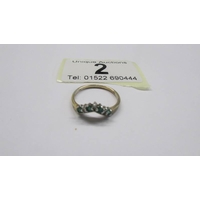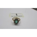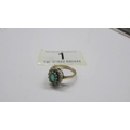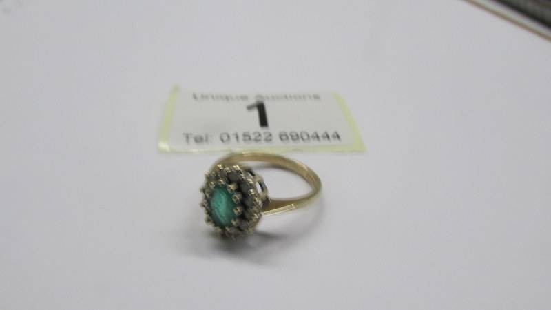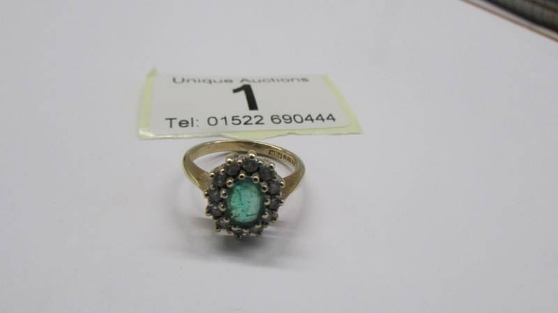 A 9ct gold oval emerald ring surrounded by diamonds, size J. 2.7 grams.