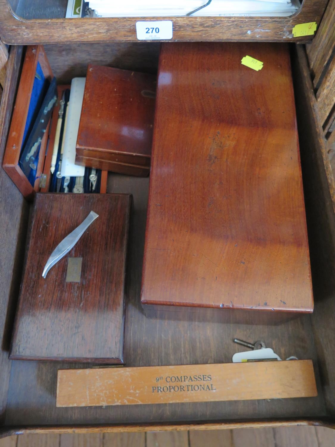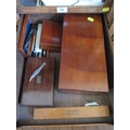 Various drawing instruments, cased and a microscope (case locked, key broken)