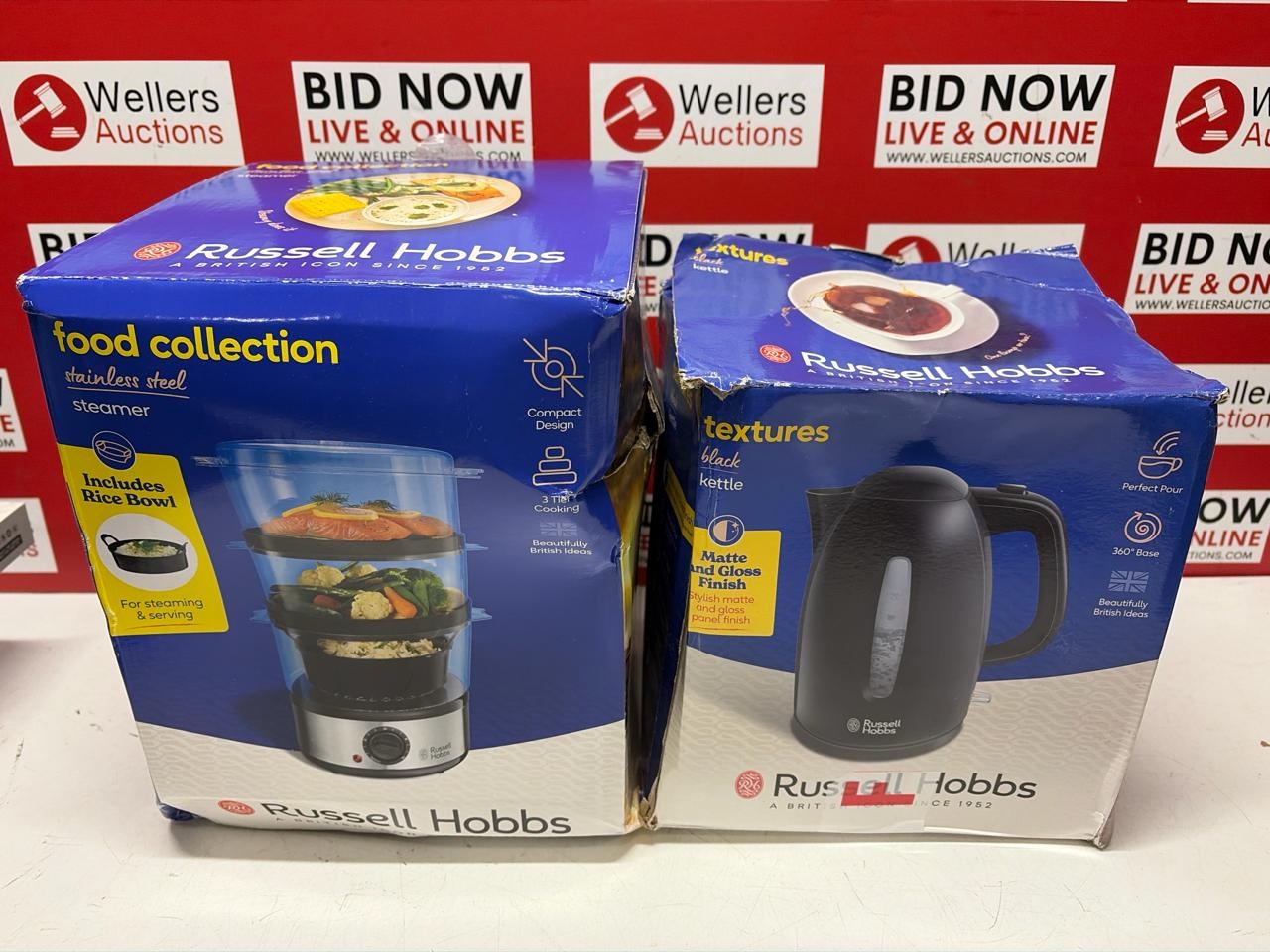 X2 NEW RUSSELL HOBBS INC. STAINLESS STEEL STEAMER AND BLACK KETTLE