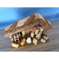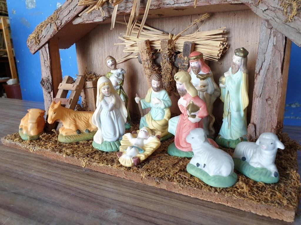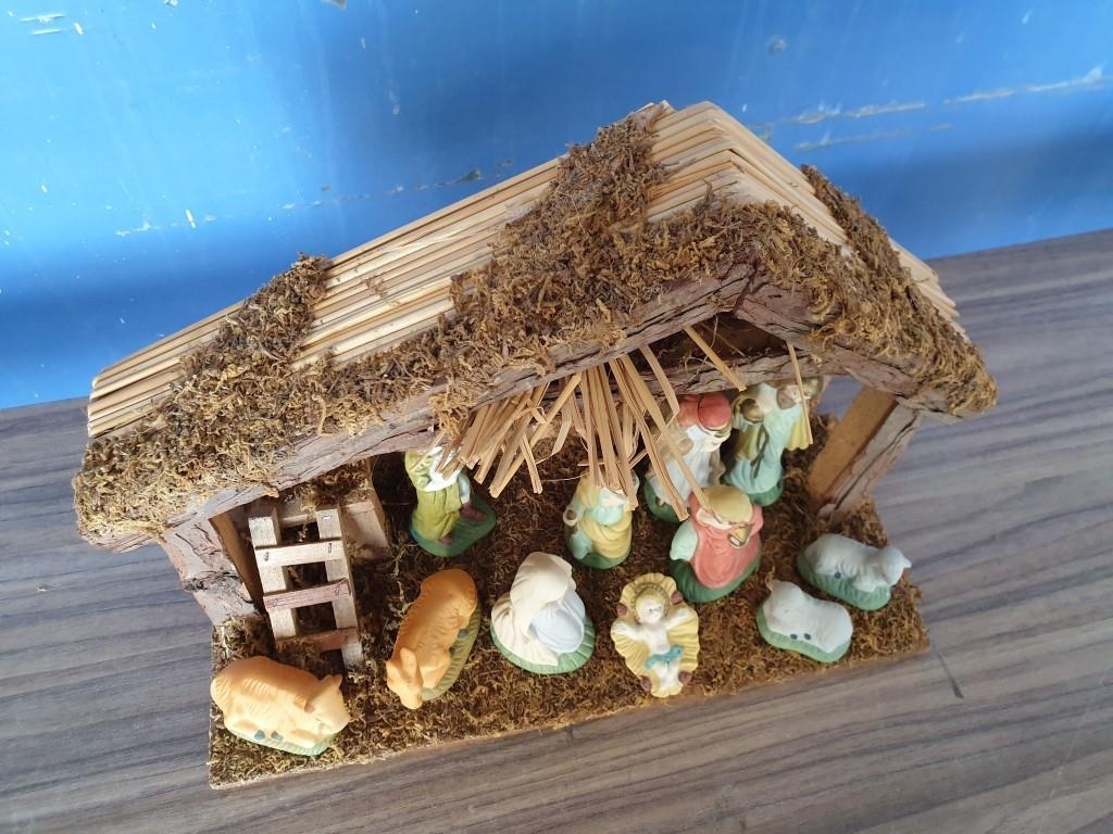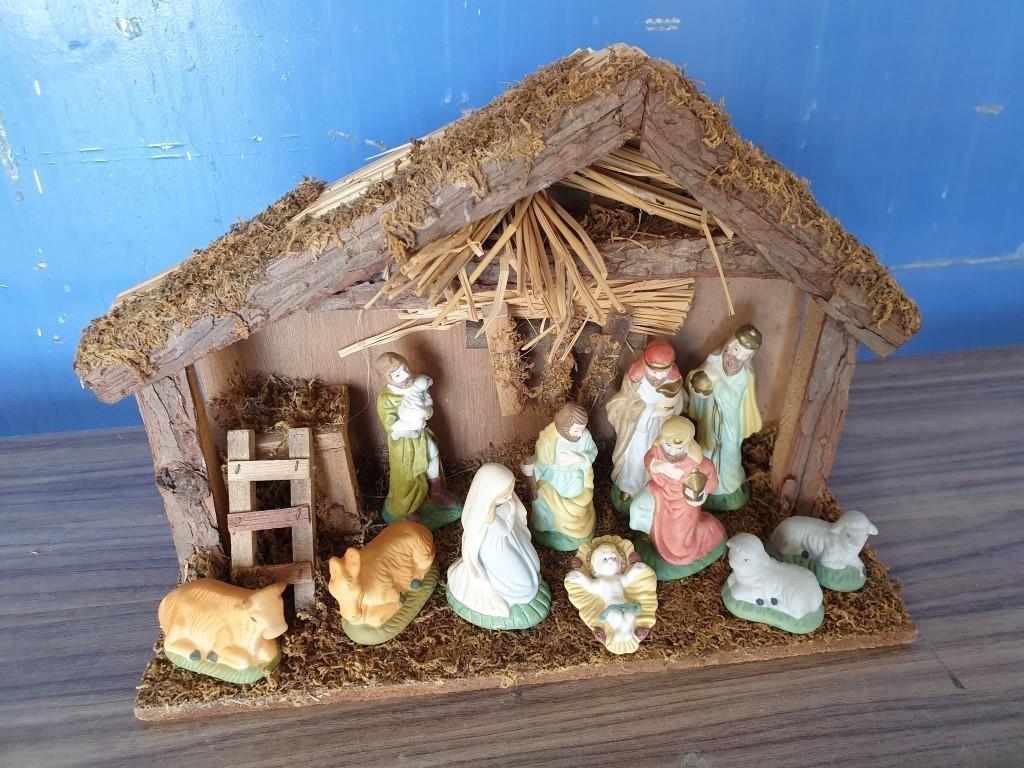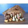 Nativity Set with Wood and Straw Stable (L:35cm H:29cm) and Porcelain Figures (4cm-13cm)