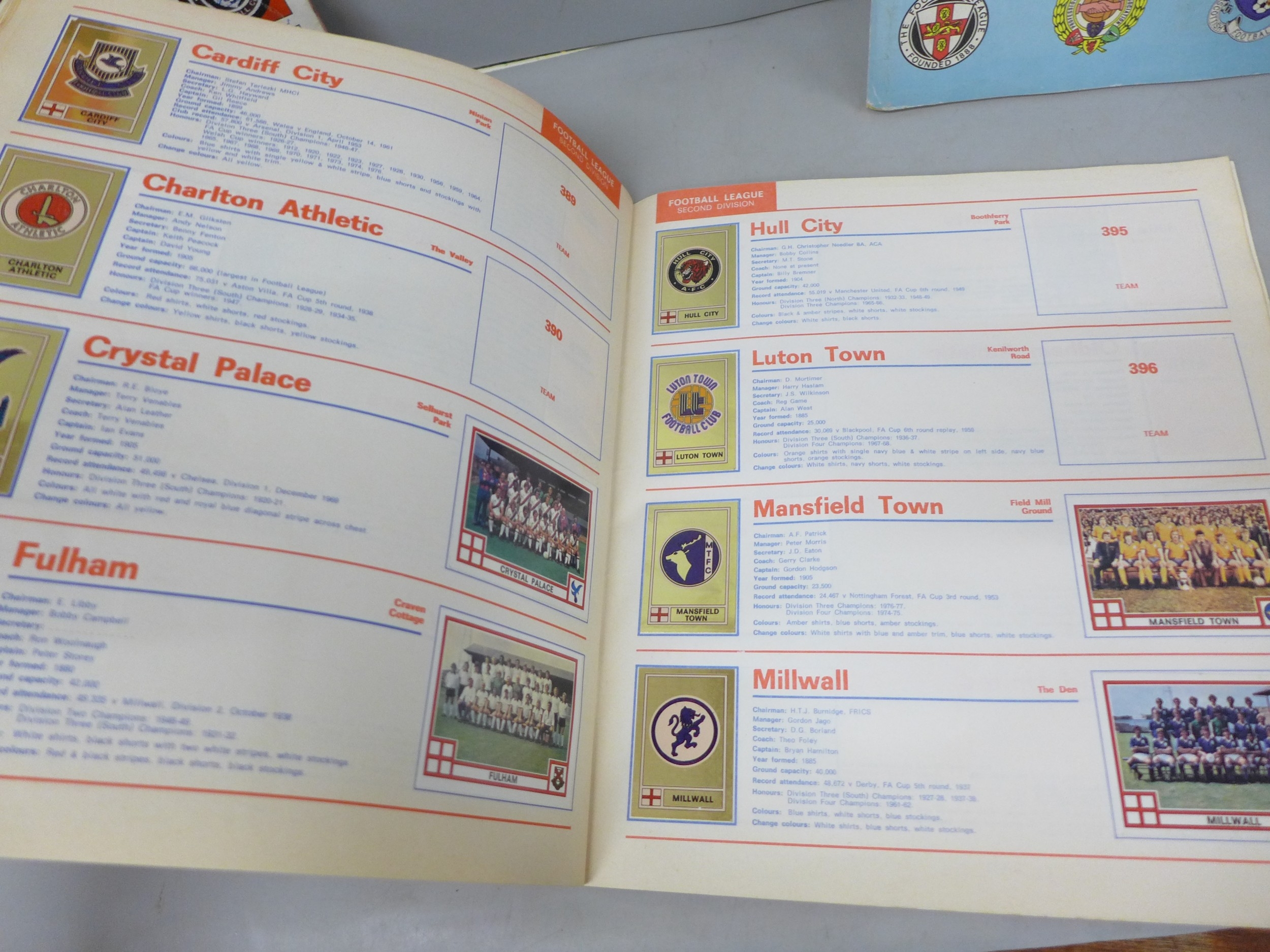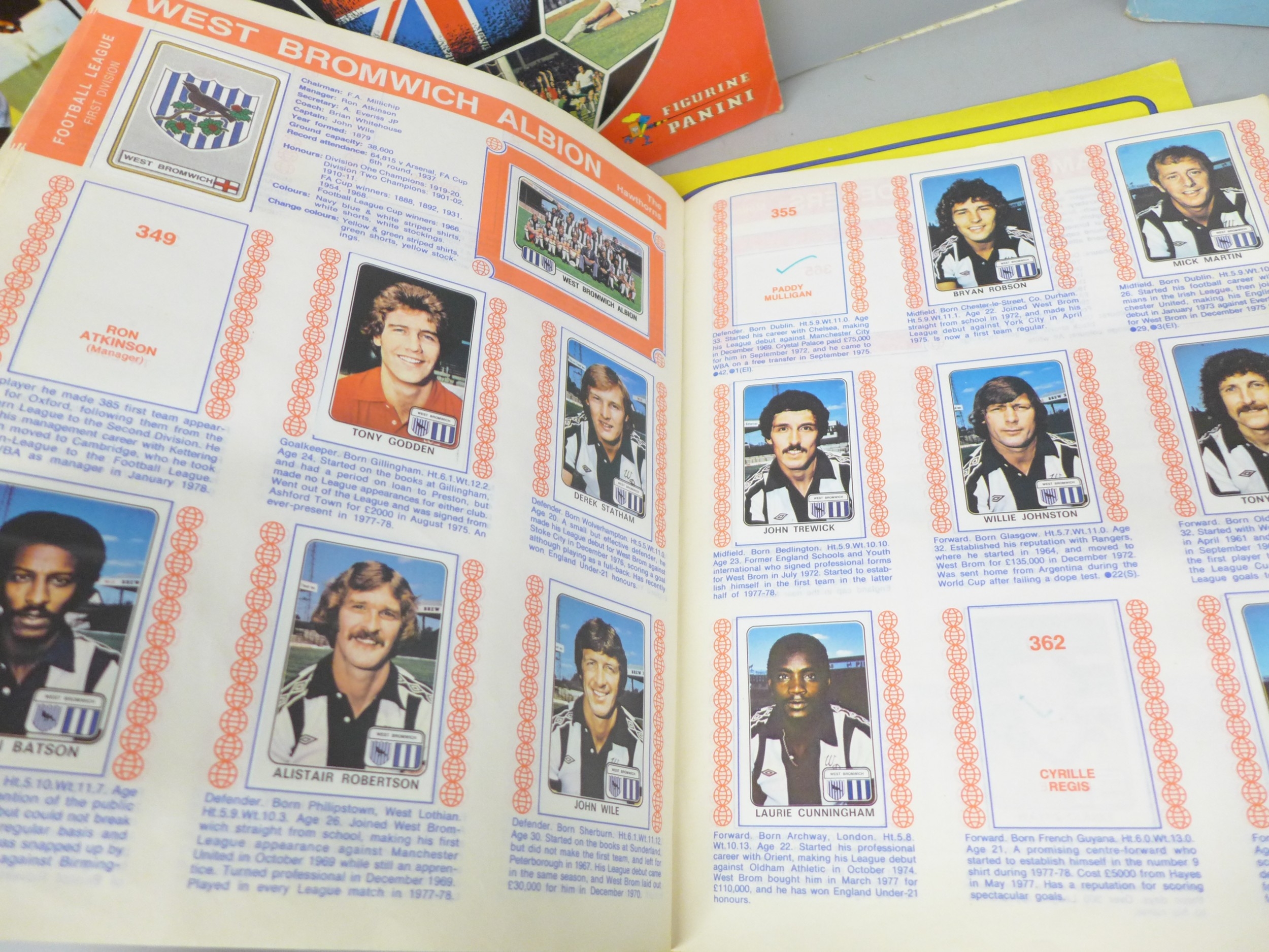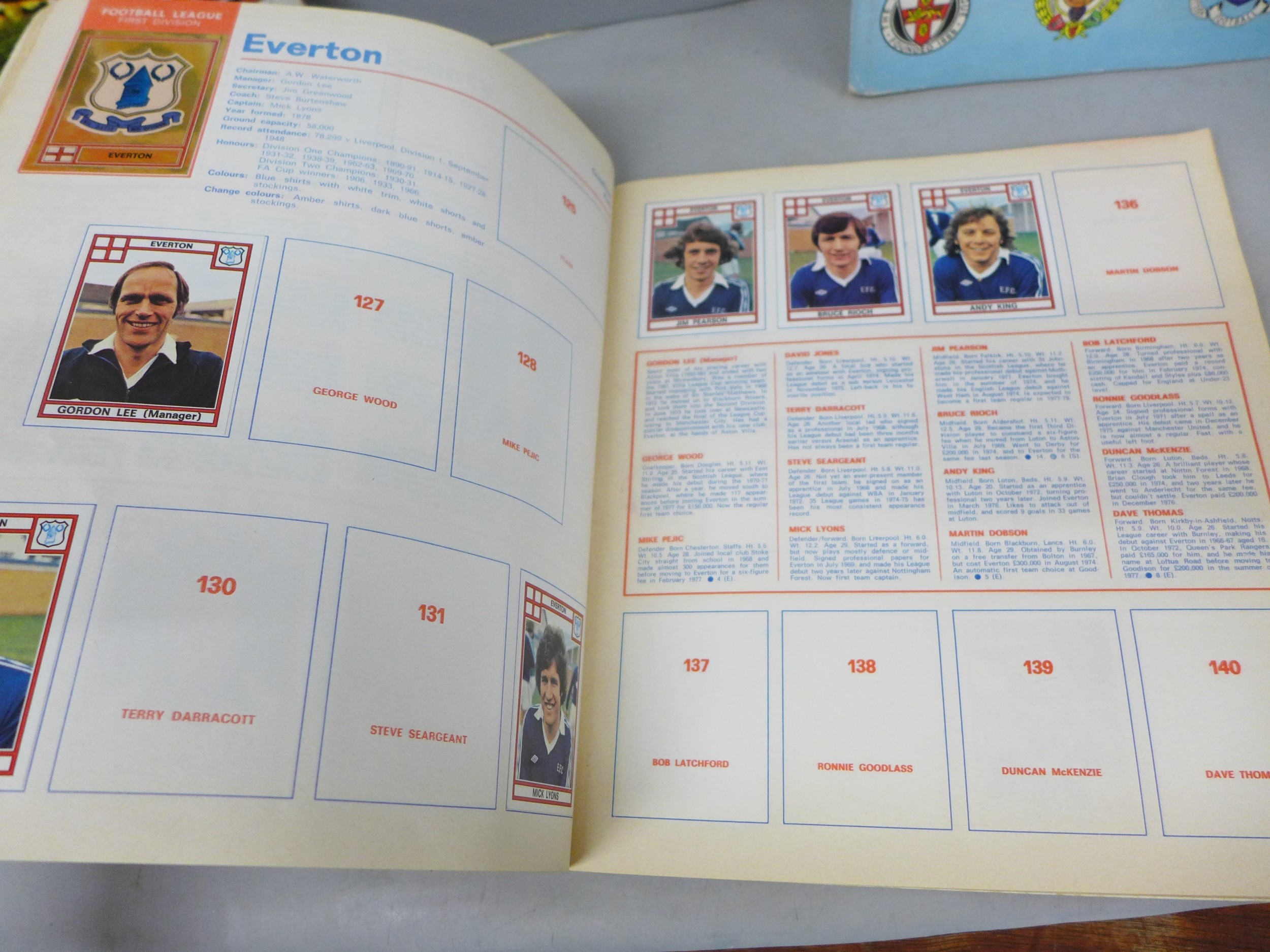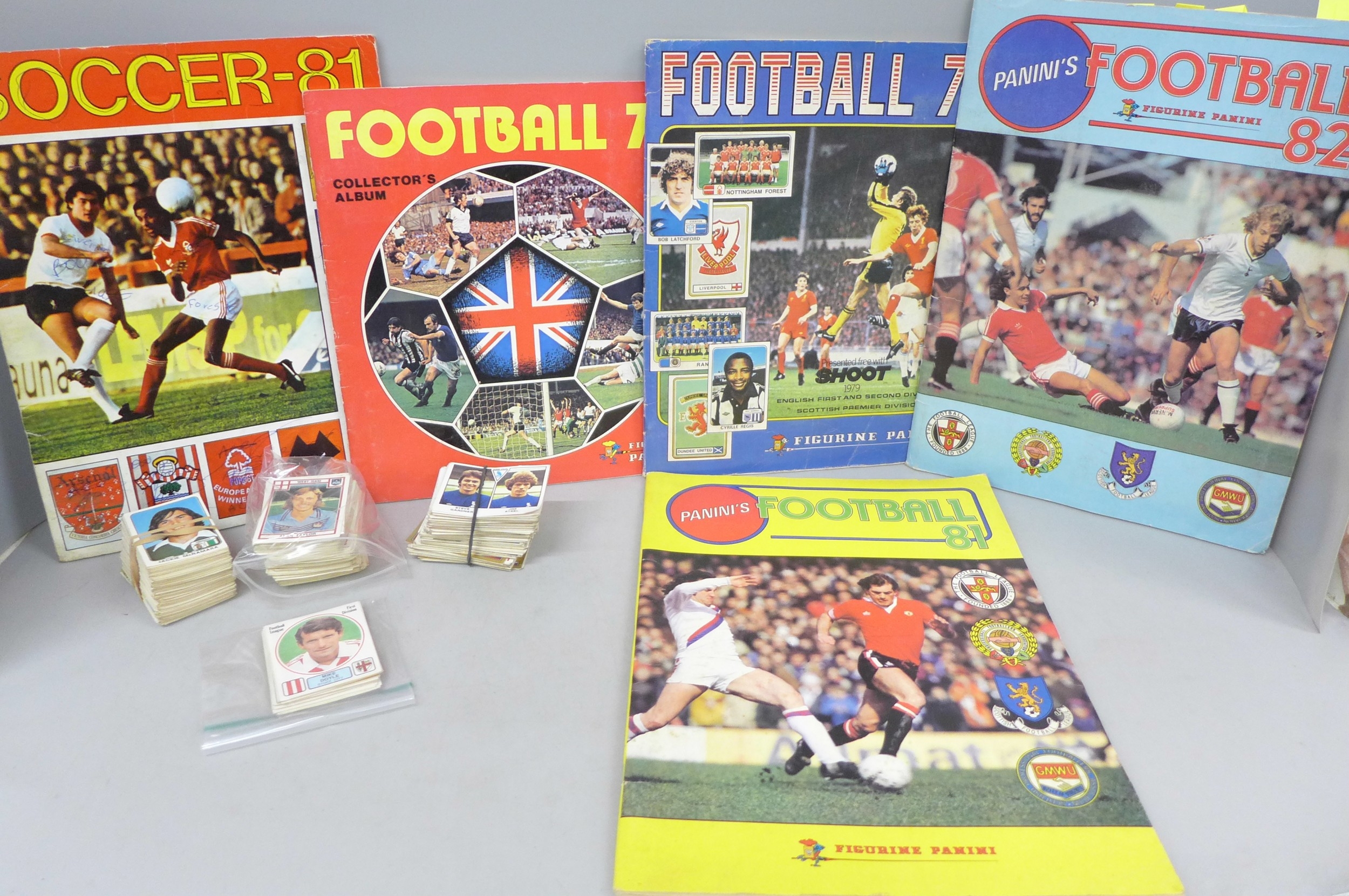 English football collectors sticker albums and stickers, Panini Football 1978, 1979, 1981 and 1982 each with some unused stickers, also a Soccer 81 album
