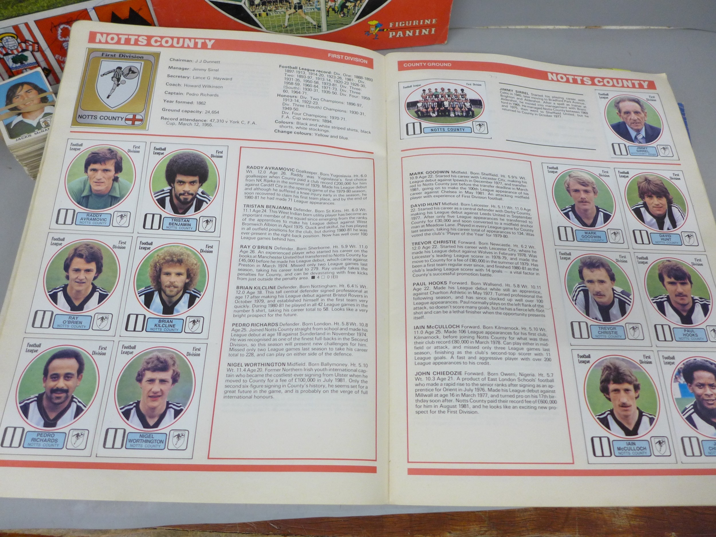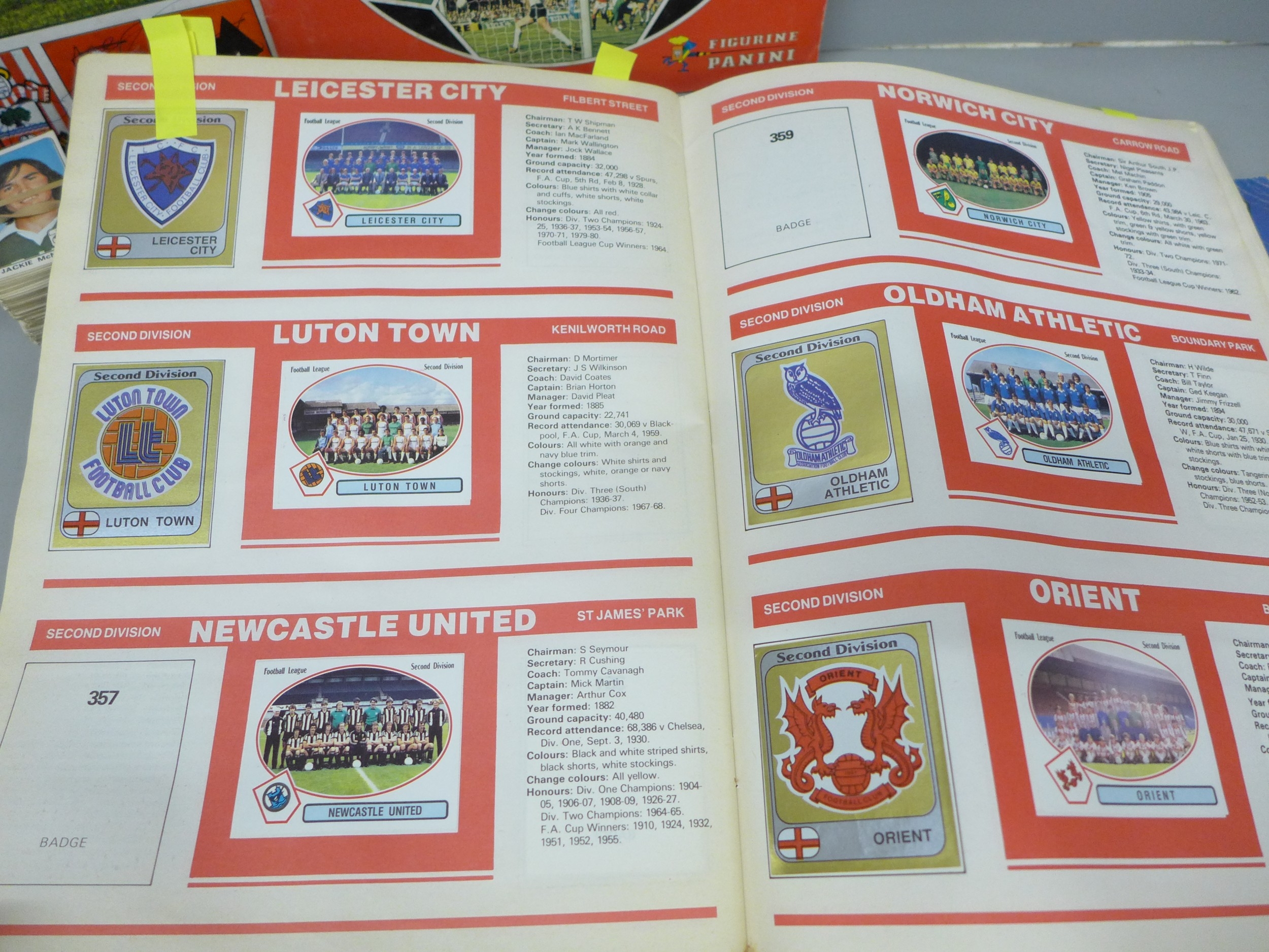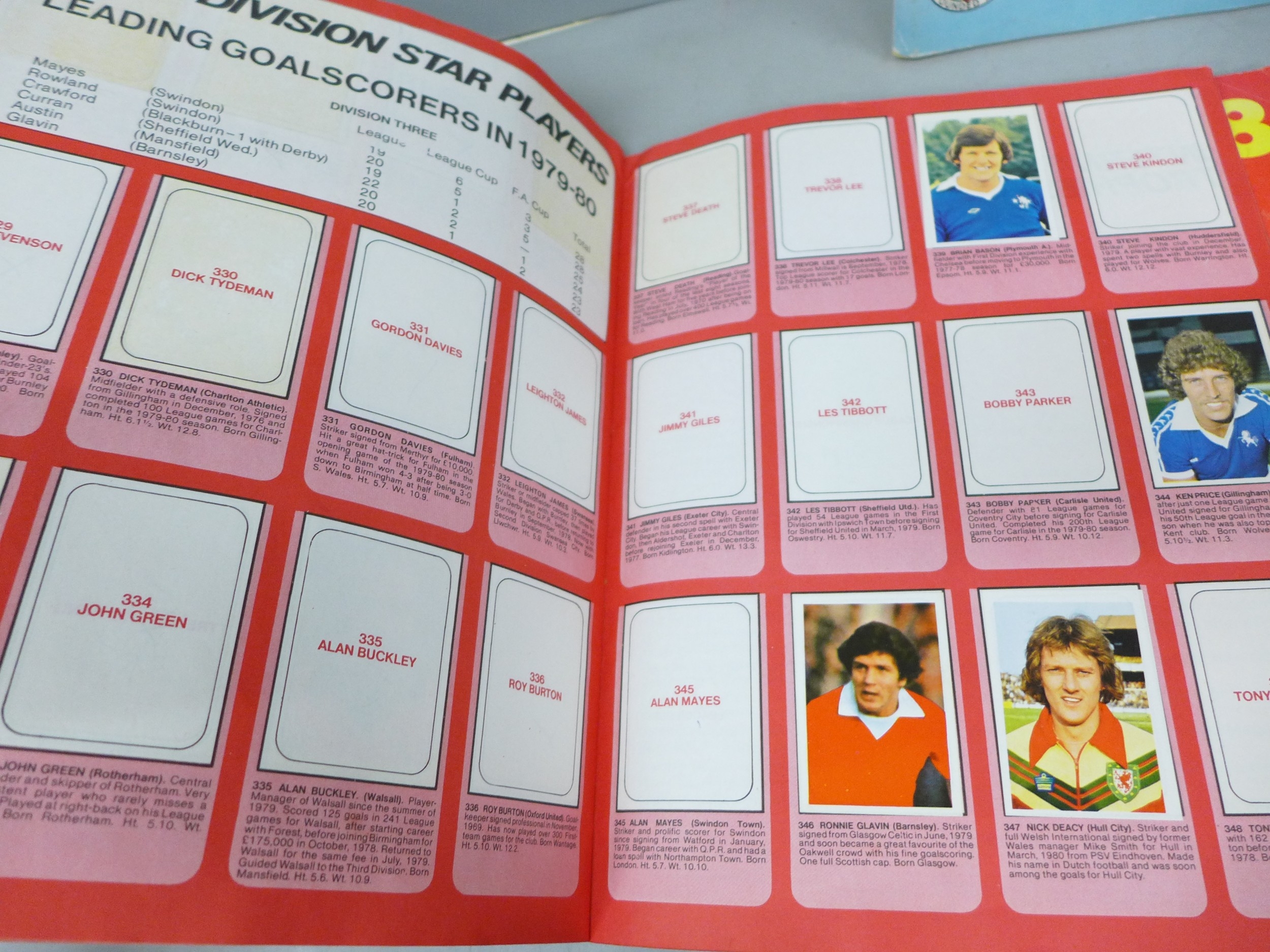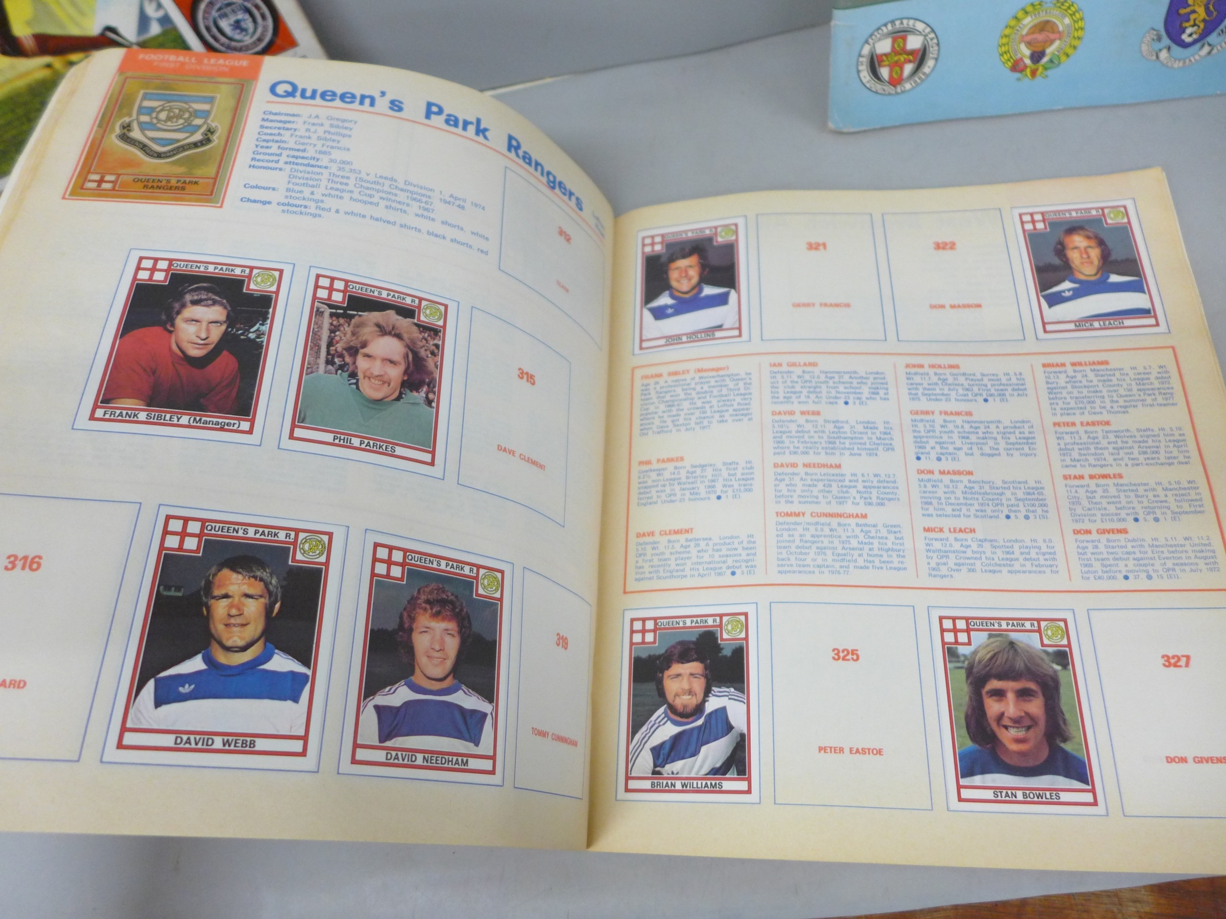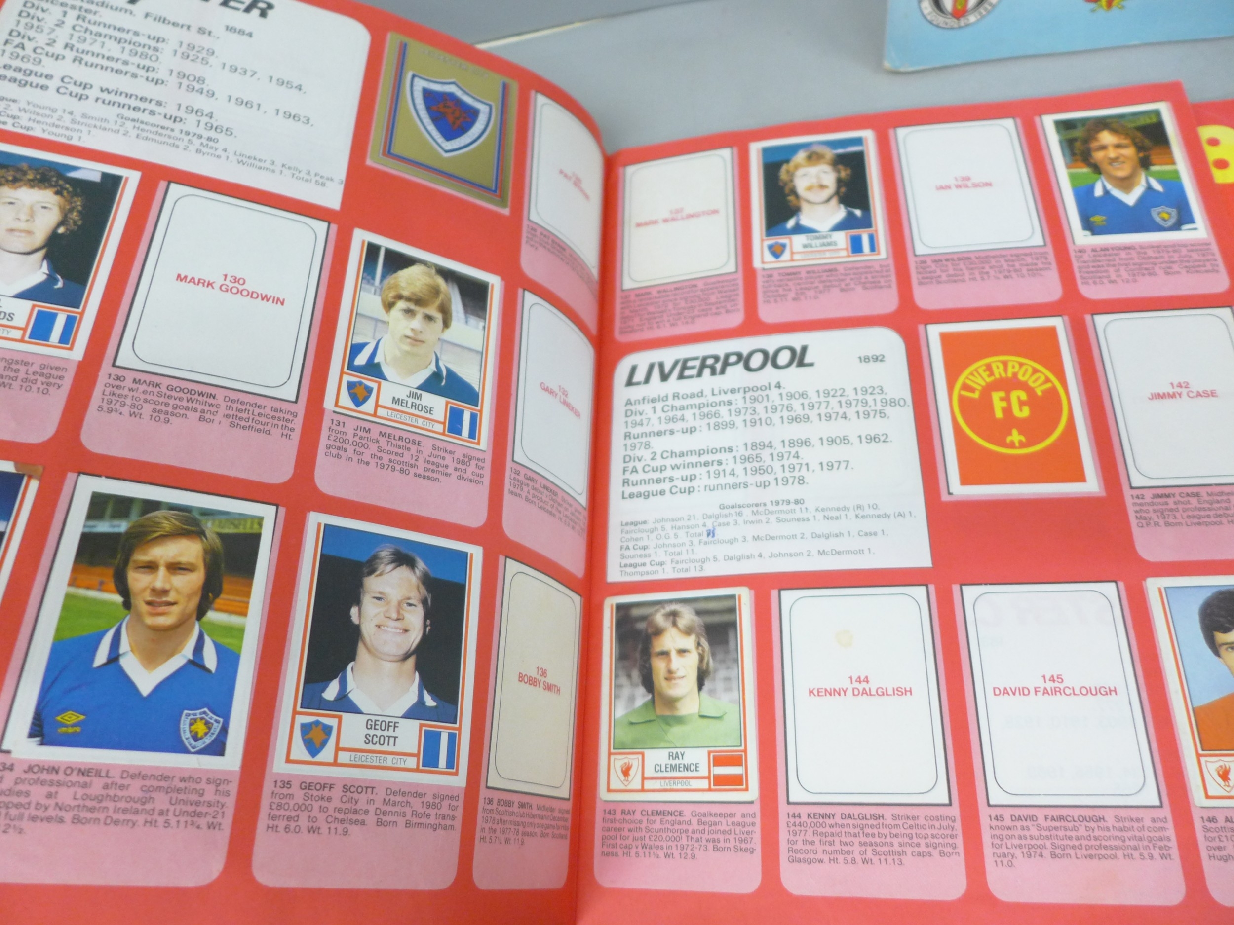 English football collectors sticker albums and stickers, Panini Football 1978, 1979, 1981 and 1982 each with some unused stickers, also a Soccer 81 album
