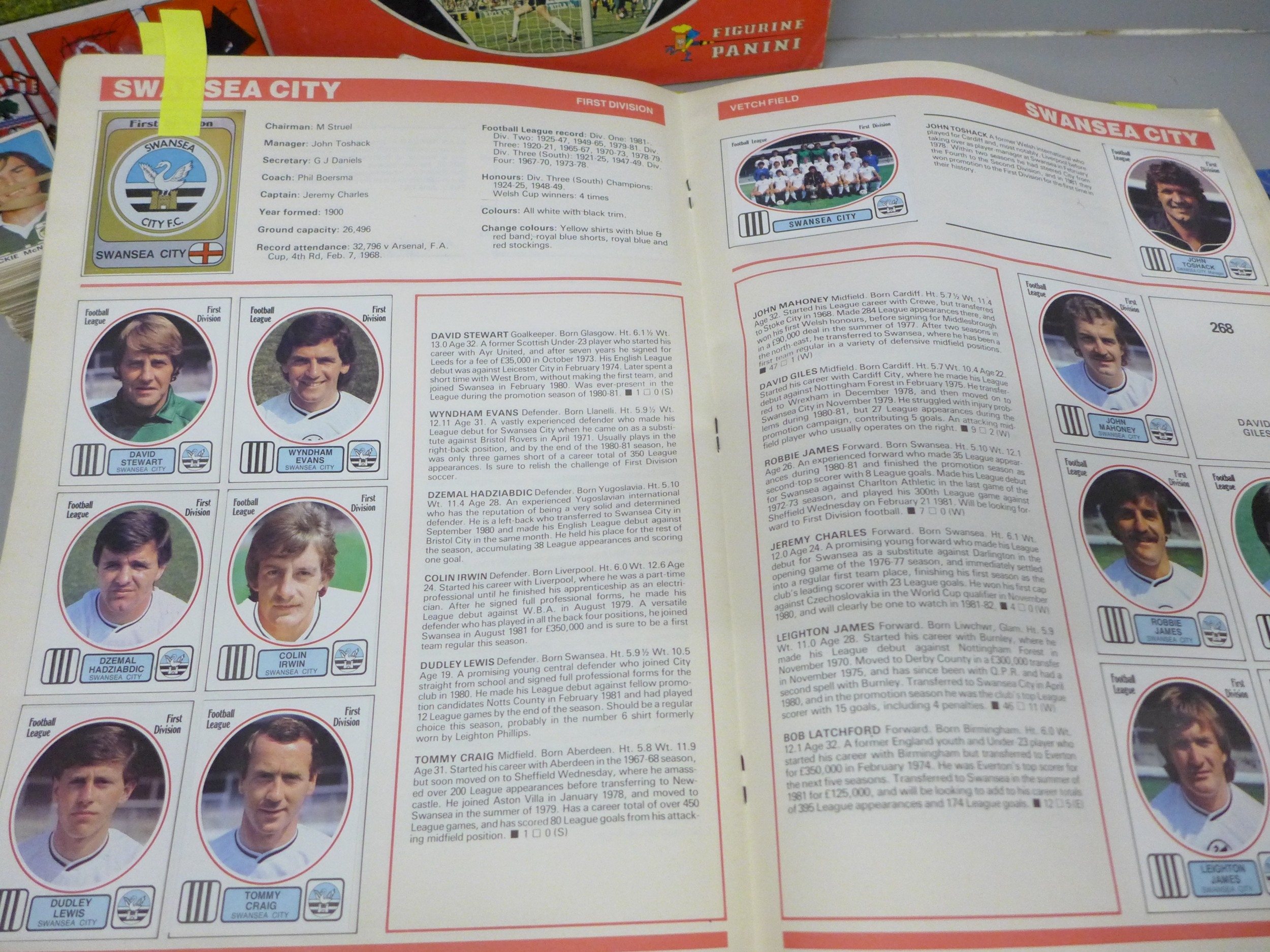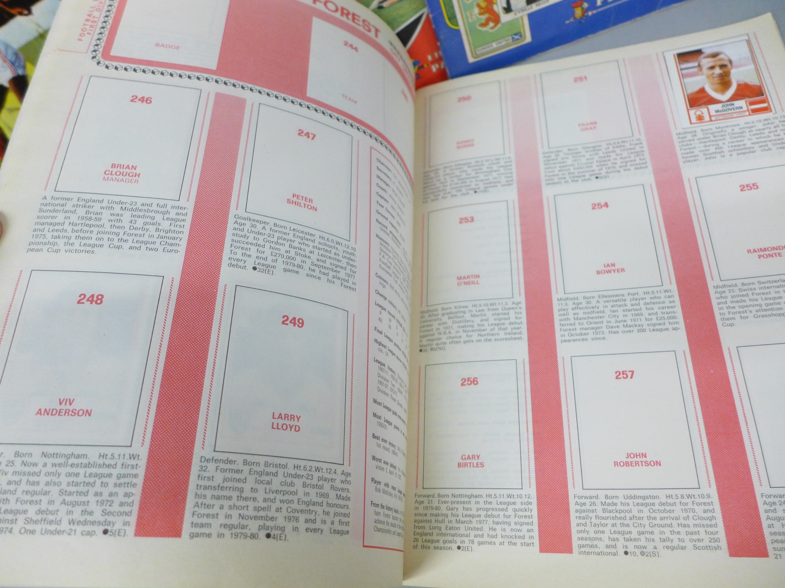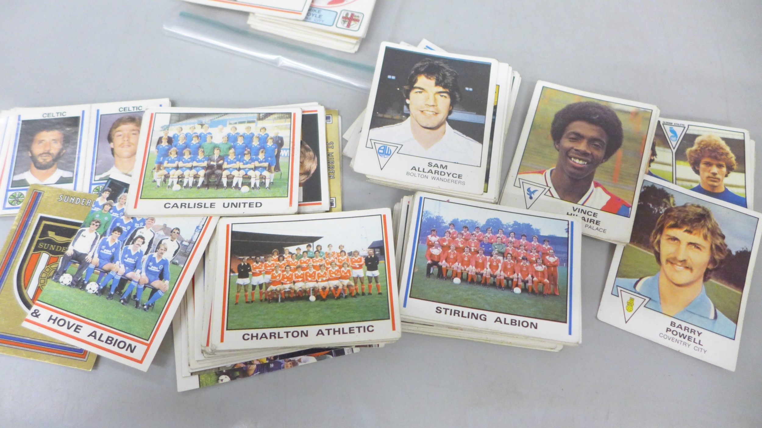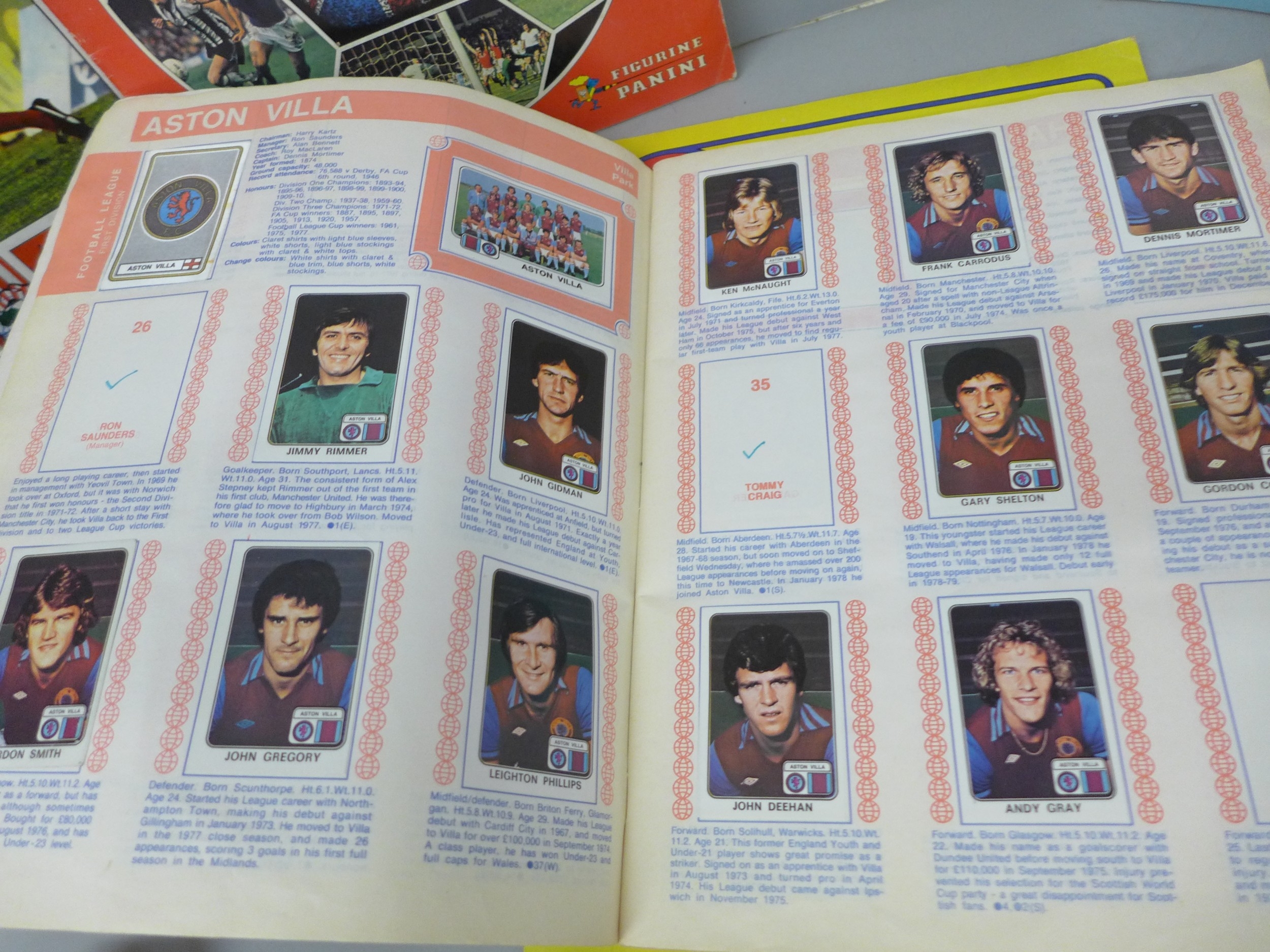 English football collectors sticker albums and stickers, Panini Football 1978, 1979, 1981 and 1982 each with some unused stickers, also a Soccer 81 album