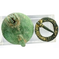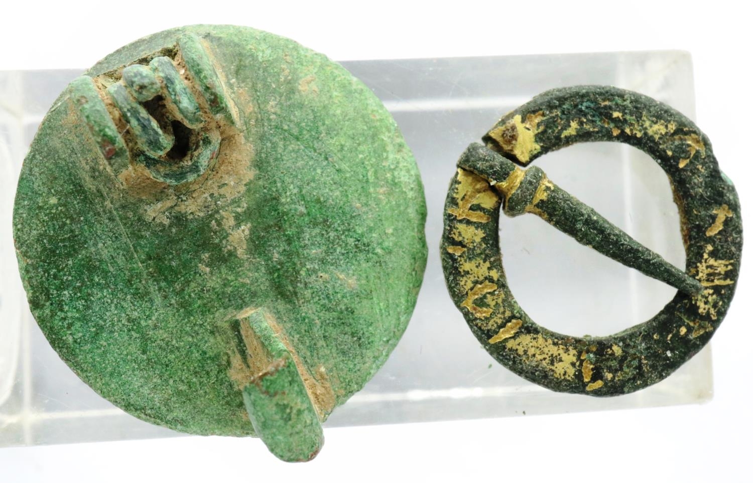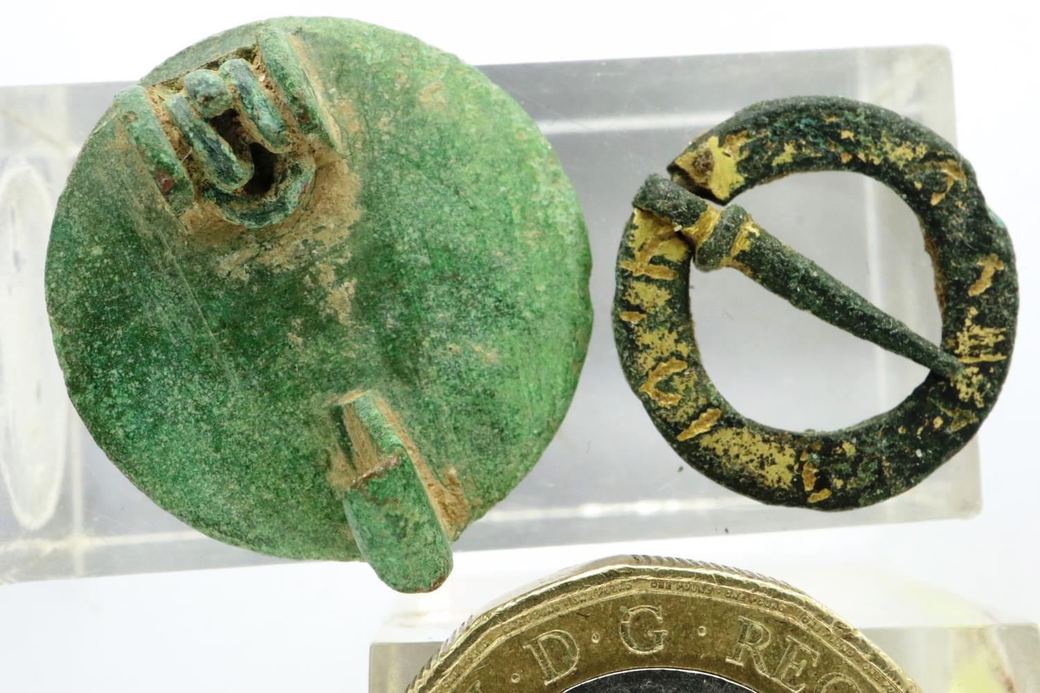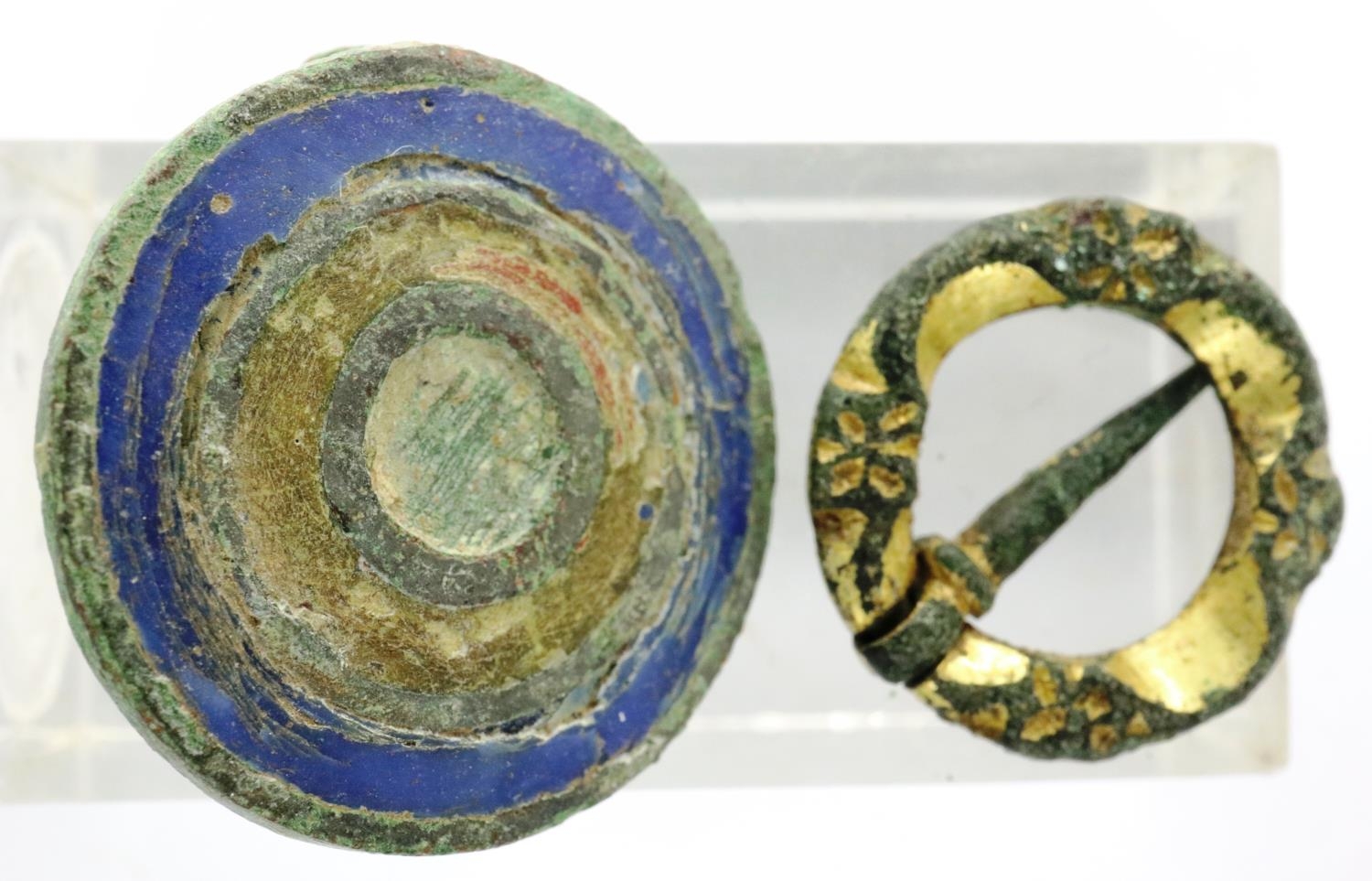 Roman enamelled roundel brooch with a medieval gilt buckle. P&P Group 1 (£14+VAT for the first lot and £1+VAT for subsequent lots)