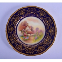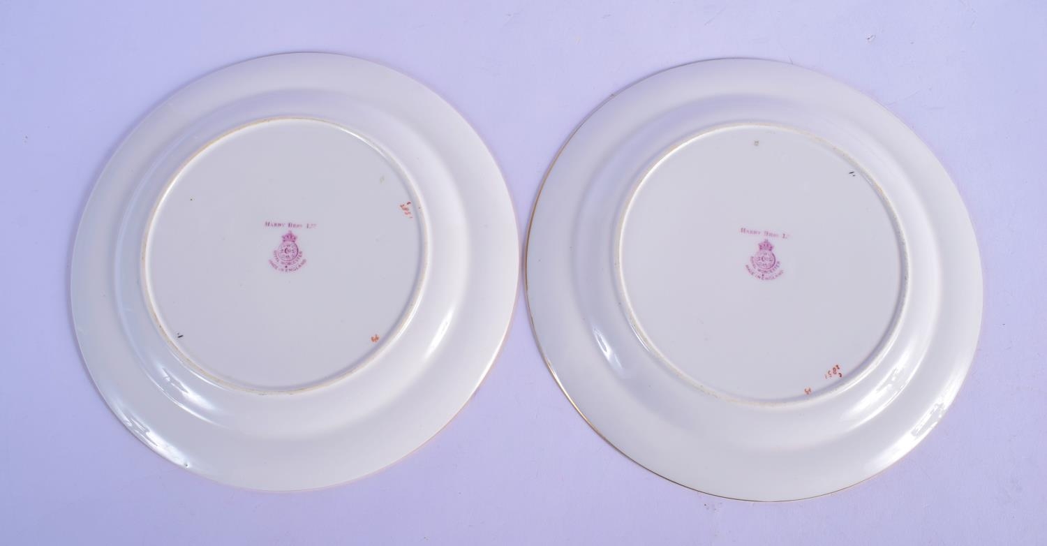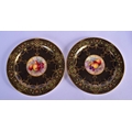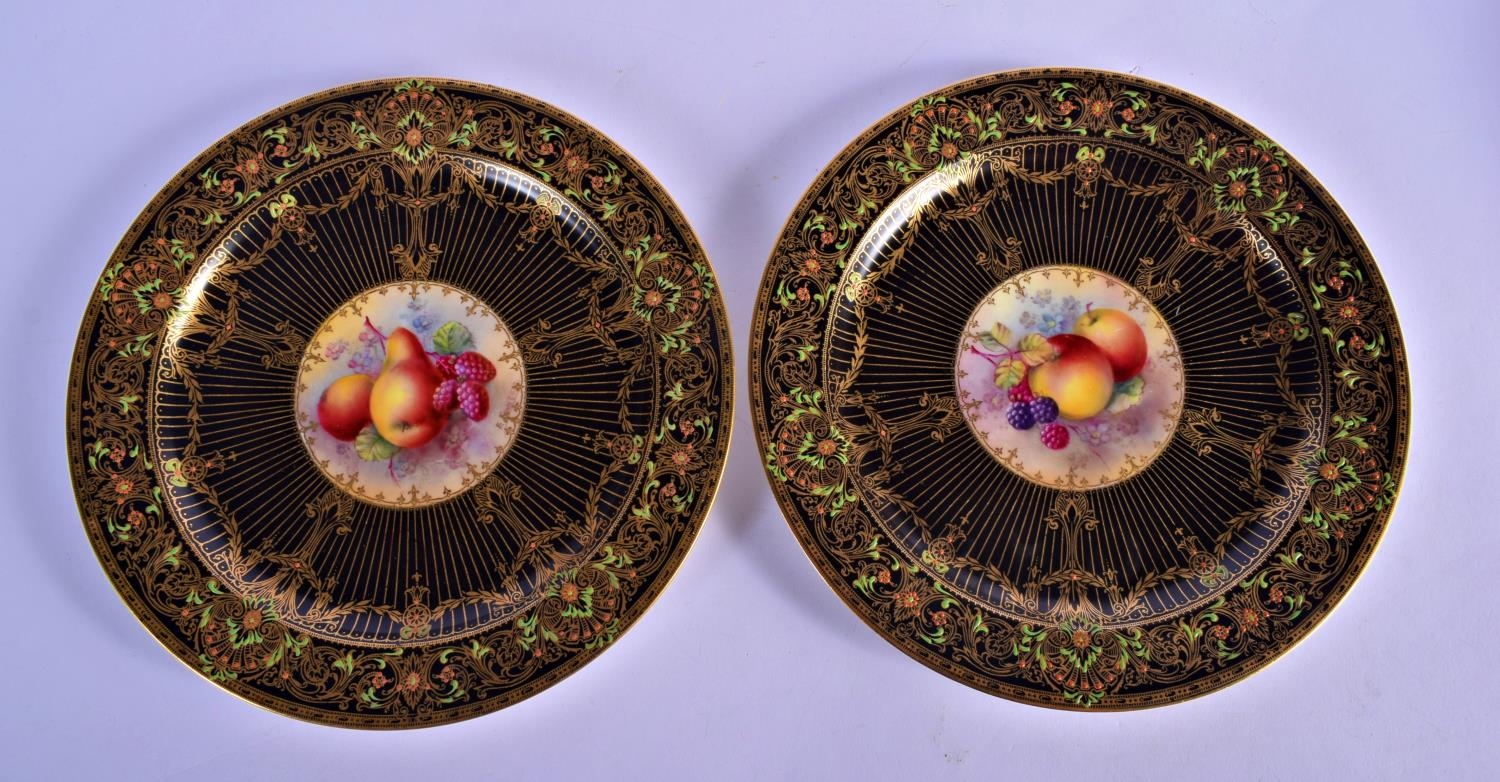 Royal Worcester rare pair of art deco style plates painted with fruit by E. Townsend, one signed, on an unusual black and gilt ground with orange and green raised enamel date code for 1926. 22cm Diameter (2)
