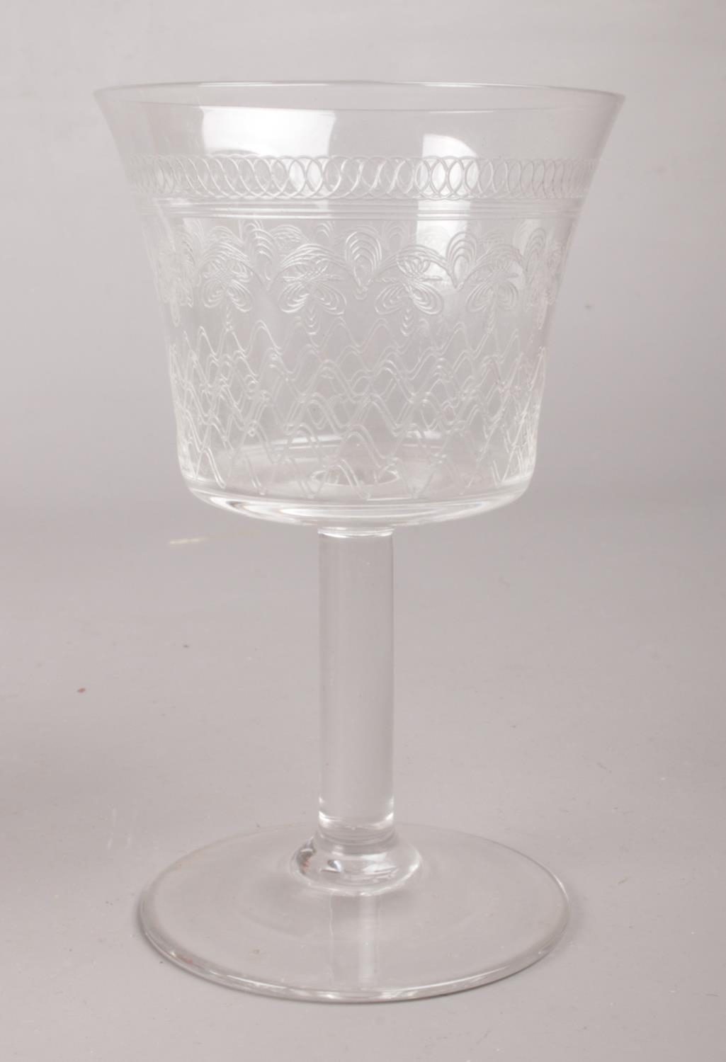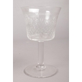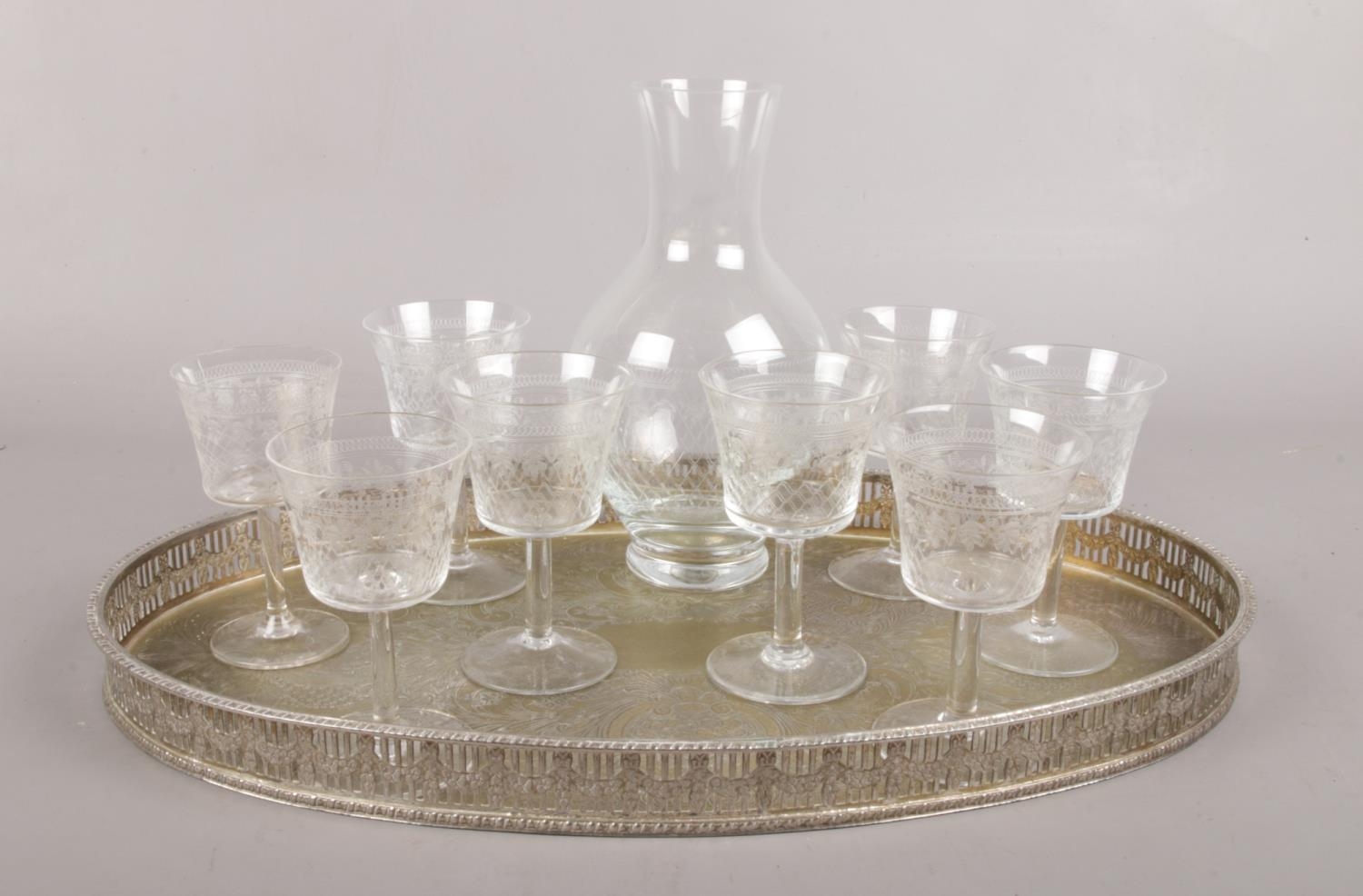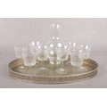 A Silver plated butler tray with small etched decanter and eight matching Pall Mall liqueur glasses.