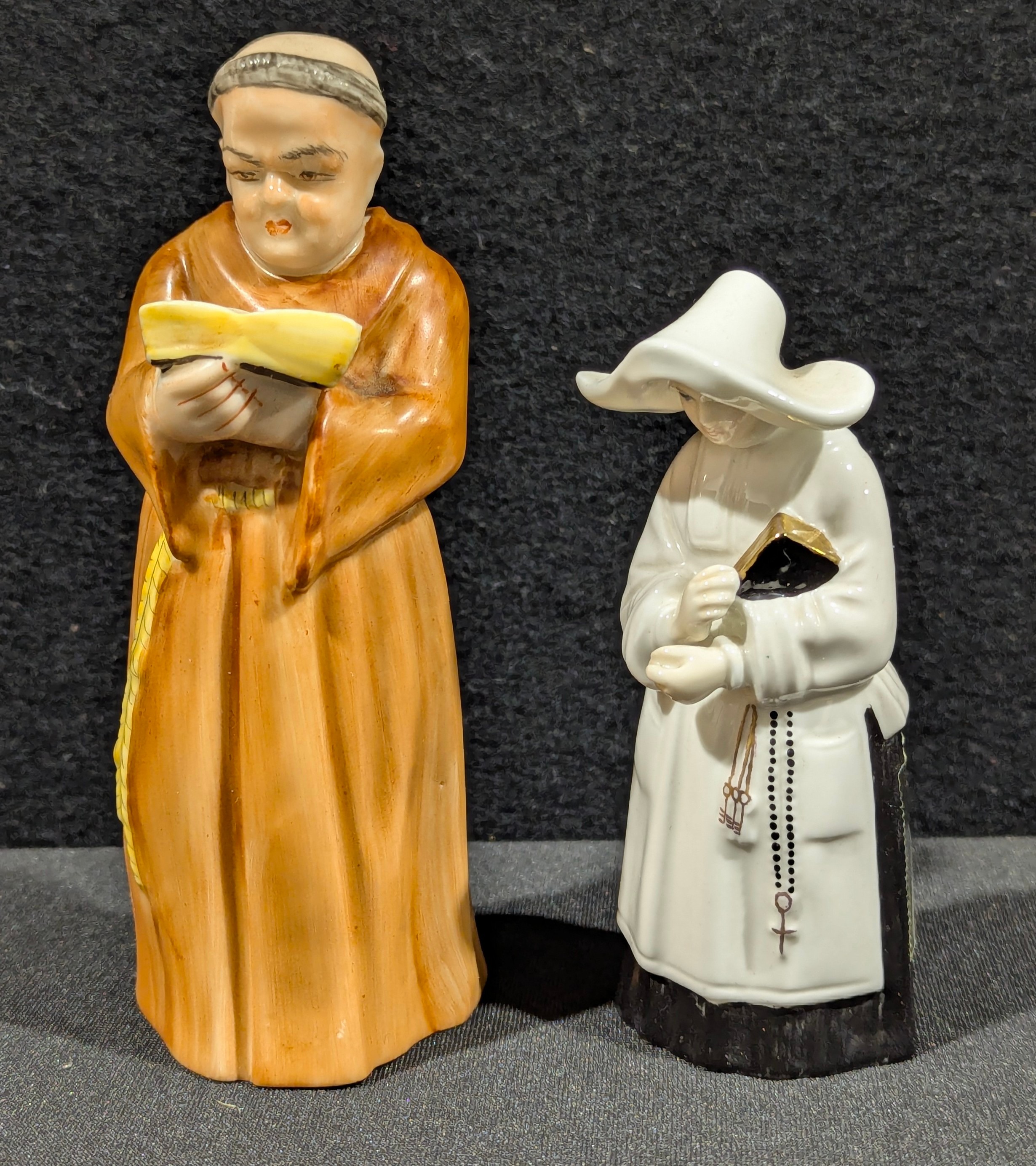 A Royal Worcester figural candle snuffer as a monk, 12cm, printed mark in puce; another as a nun, 9.5cm, printed mark in black (2)