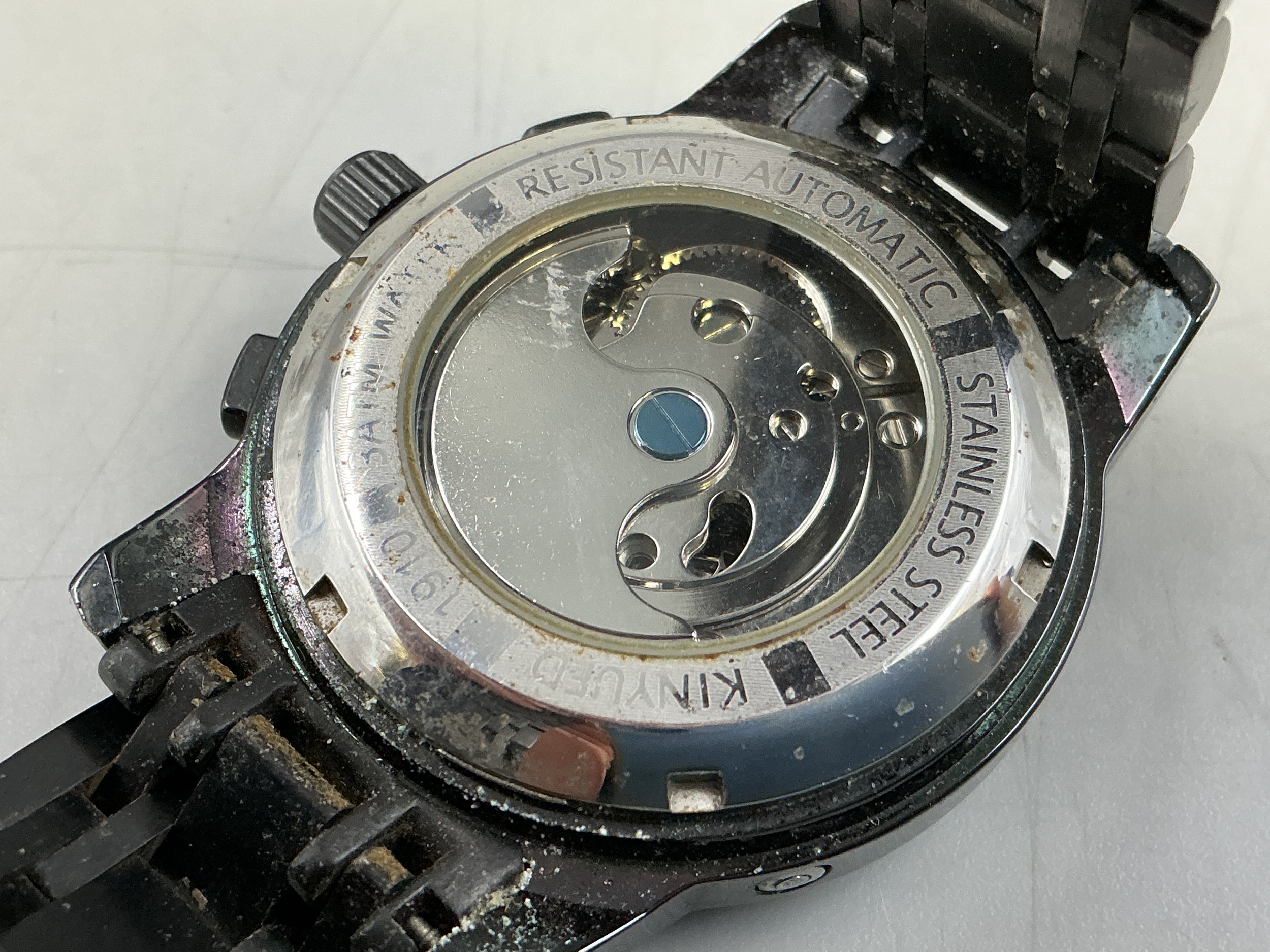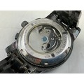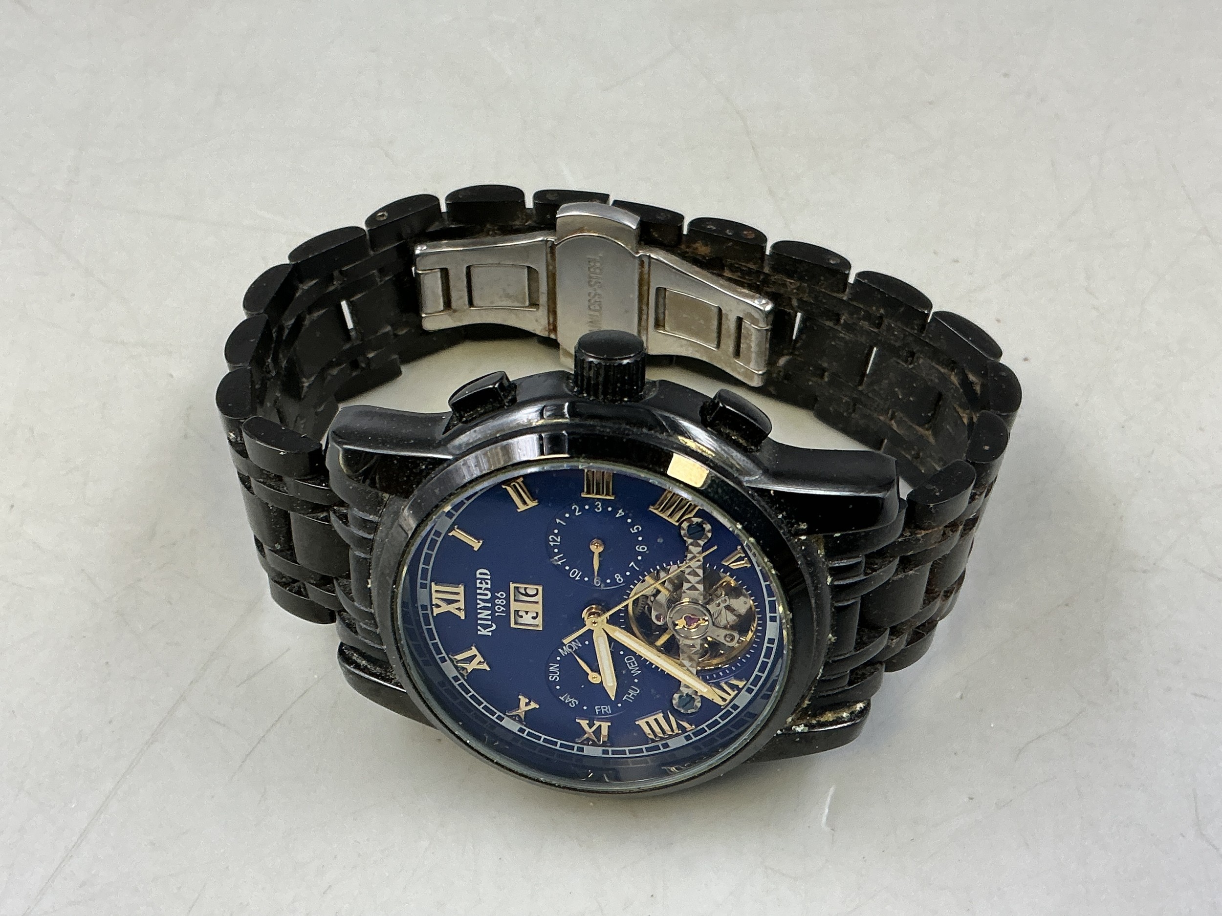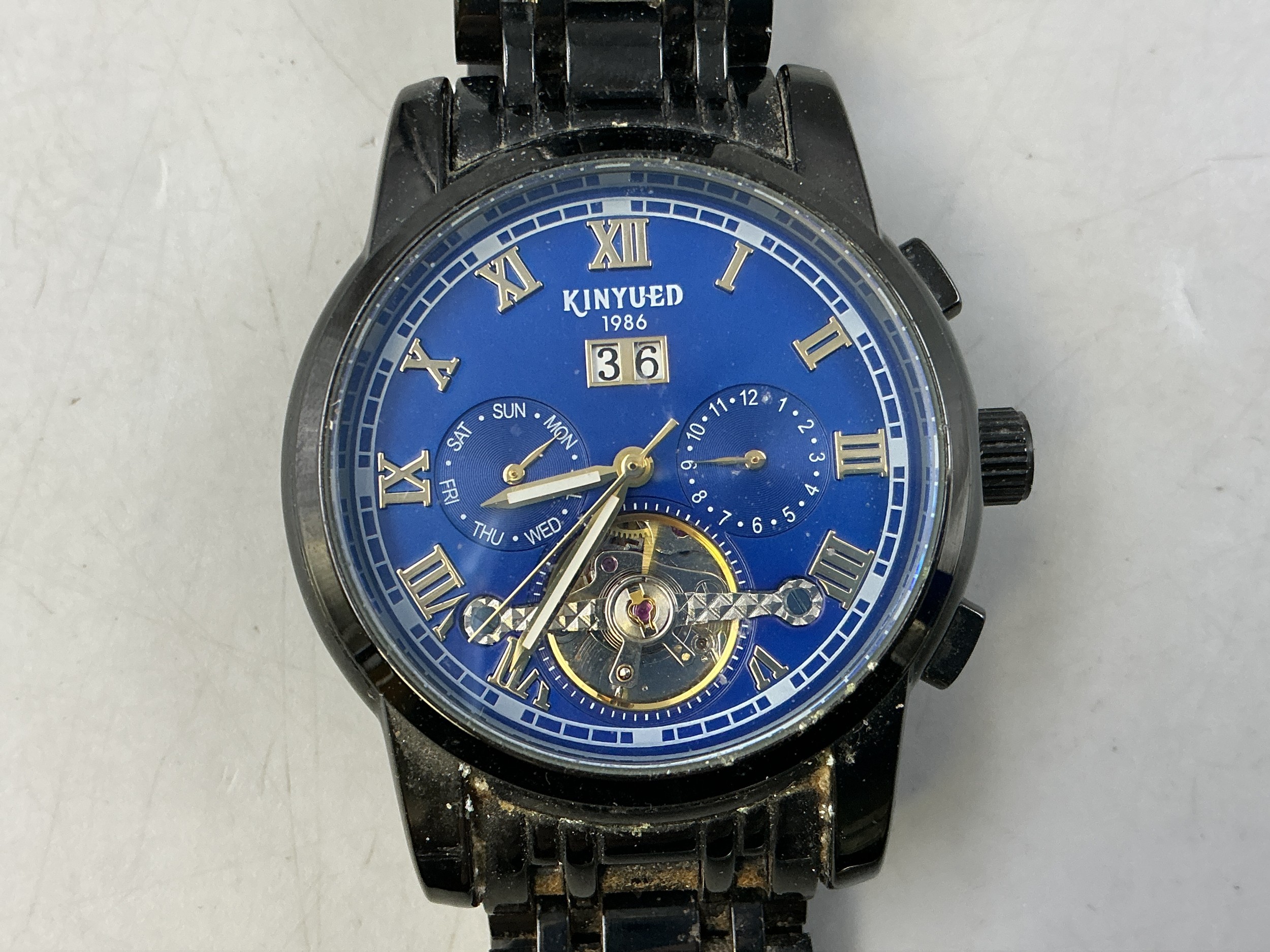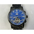 A Gents Kinyued Mechanical Calendar Watch - Blue Skeleton Dial, Black Metal Case and Strap. Working