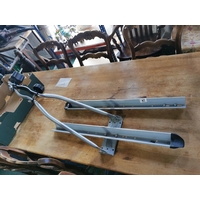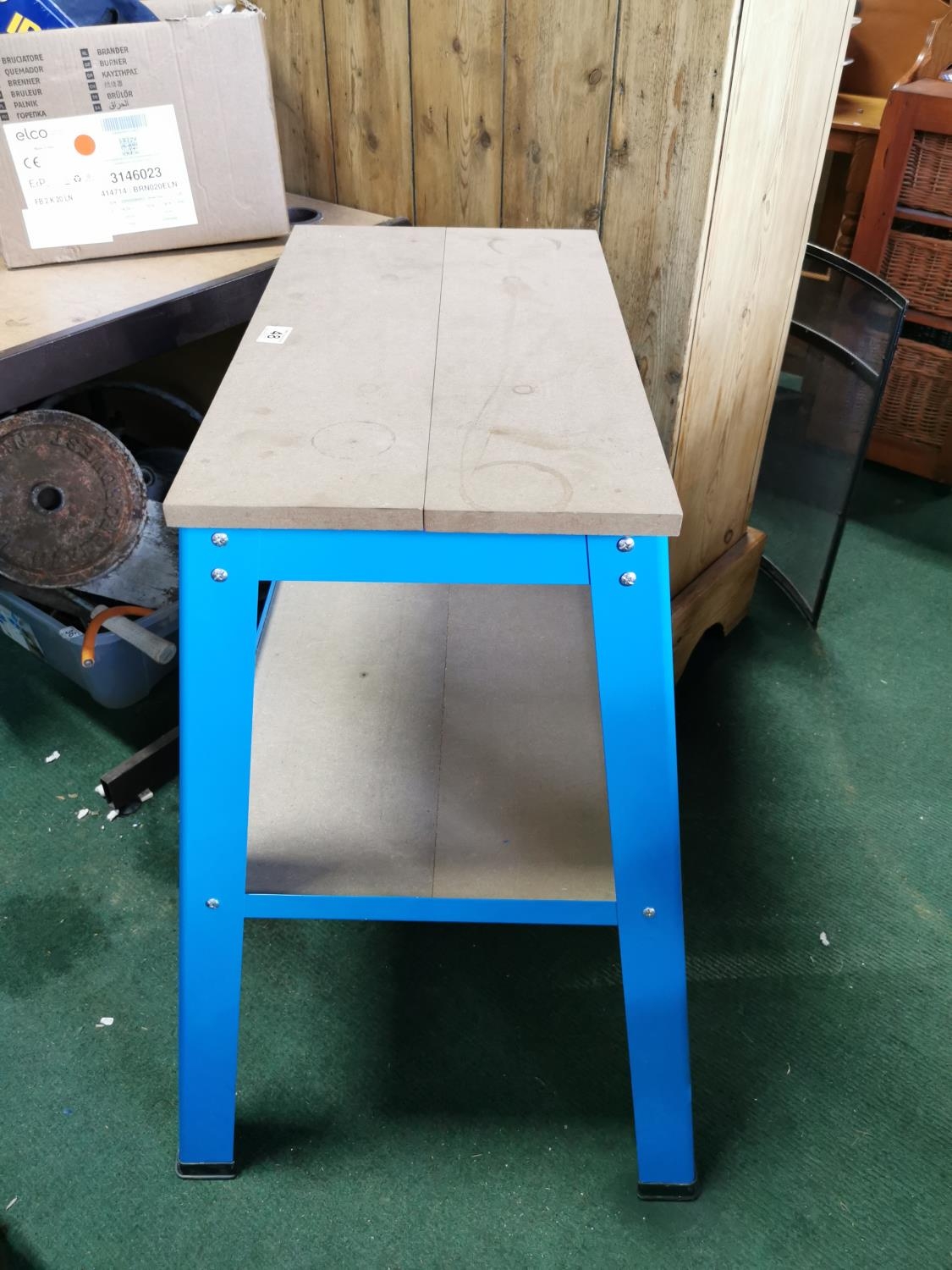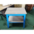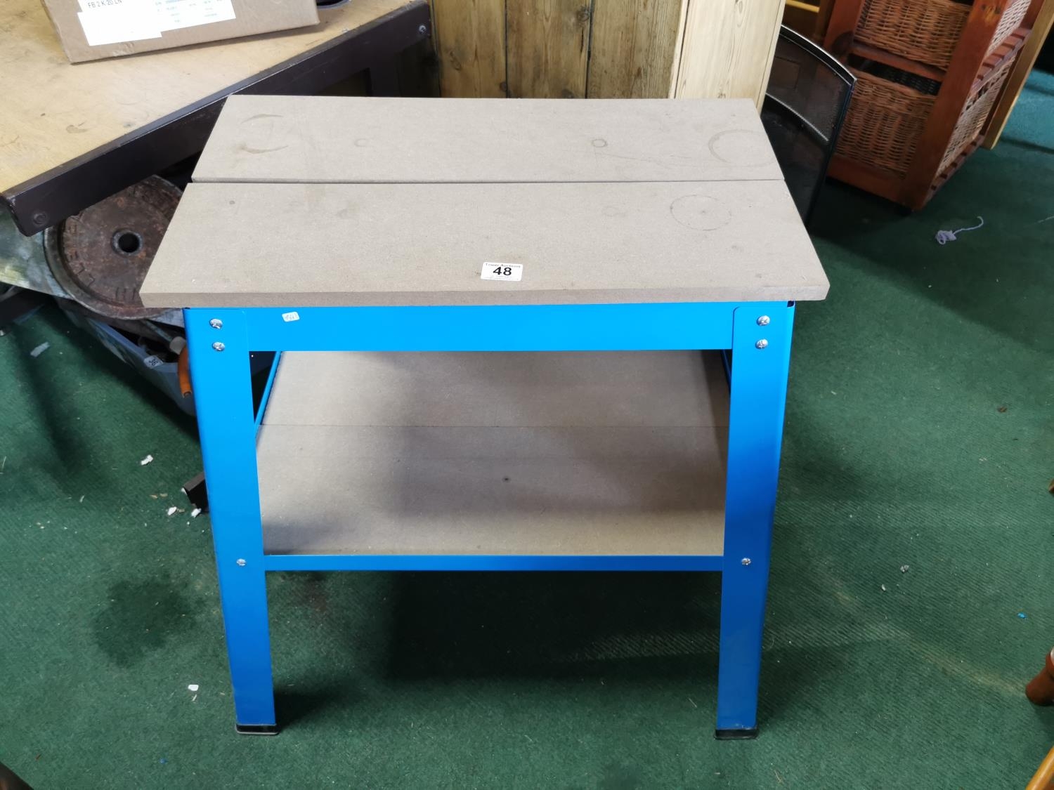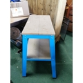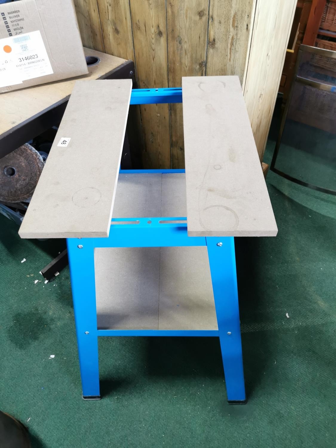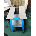 As new 2 tier work table a blue metal frame, adjustable wood top
