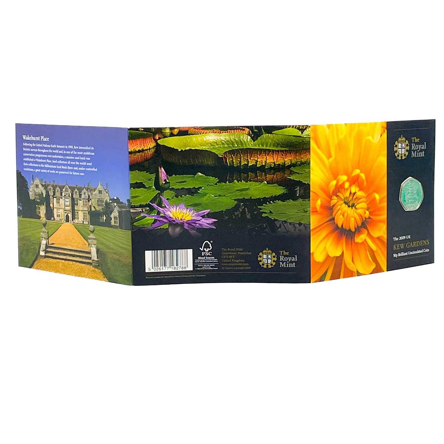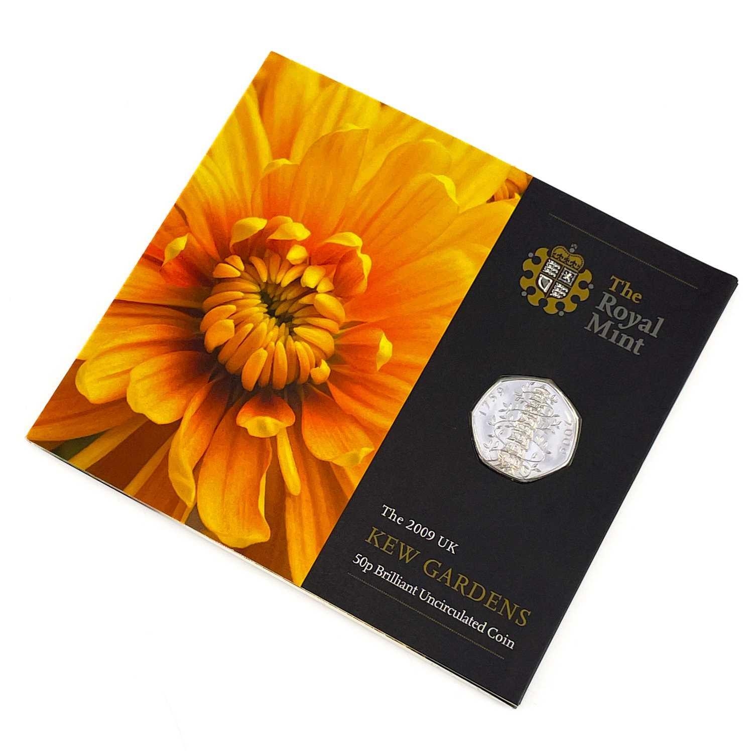 Great Britain 50 pence Kew Gardens 2009 uncirculated coin. A brilliant uncirculated 2009 50 pence coin in original Royal Mint folder.