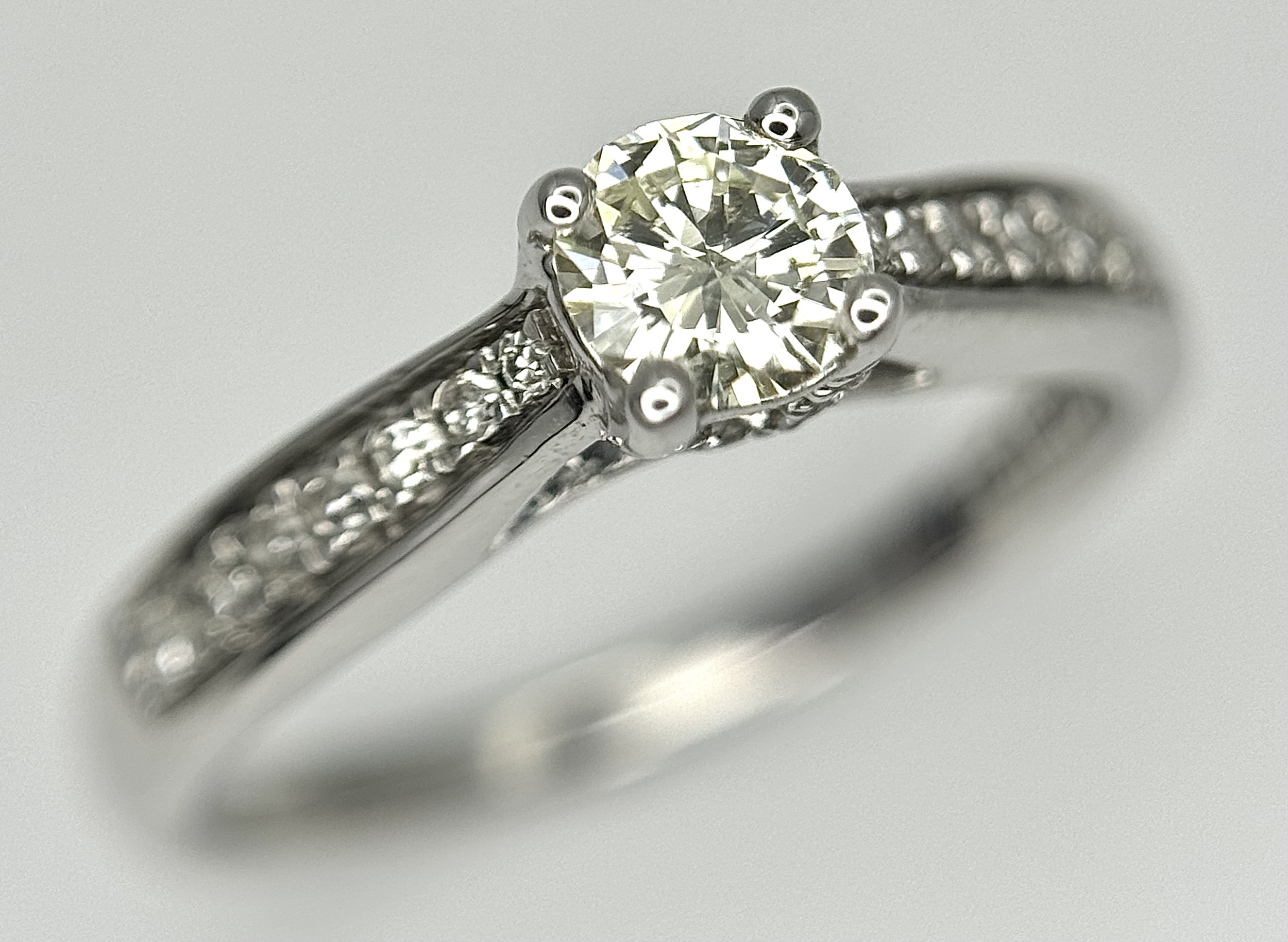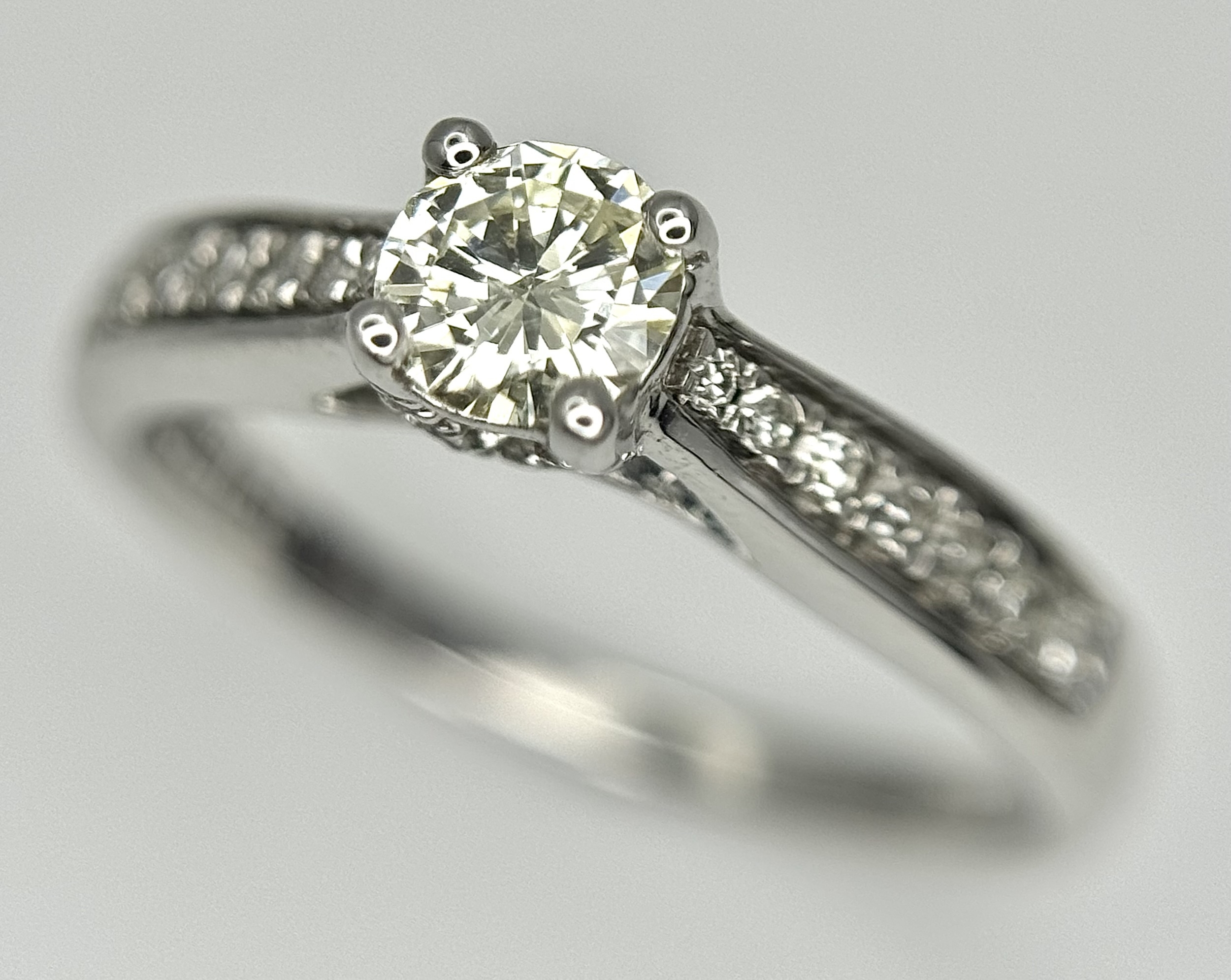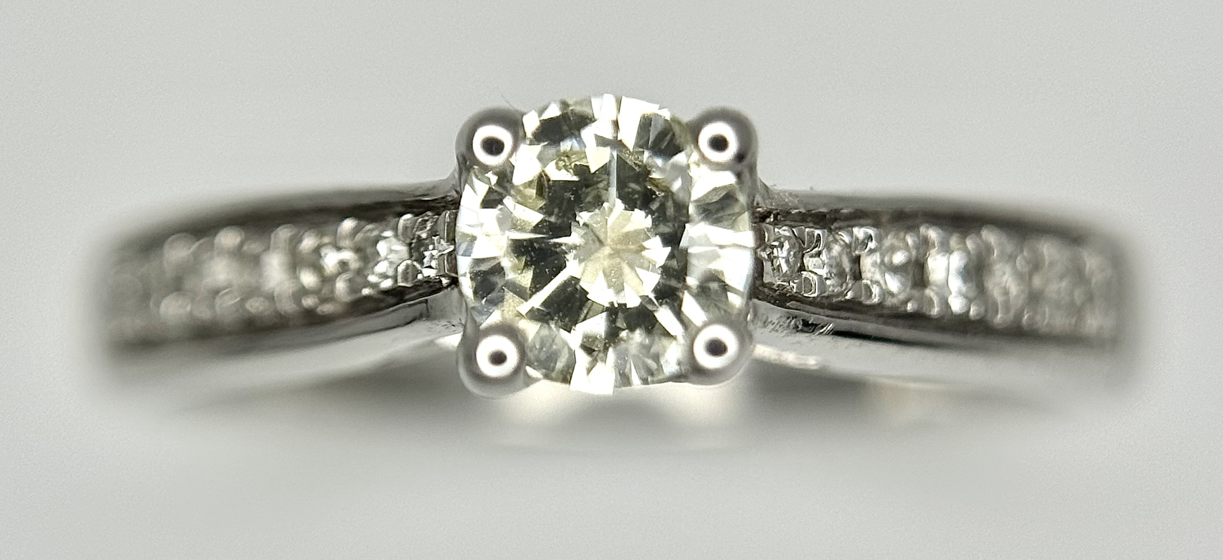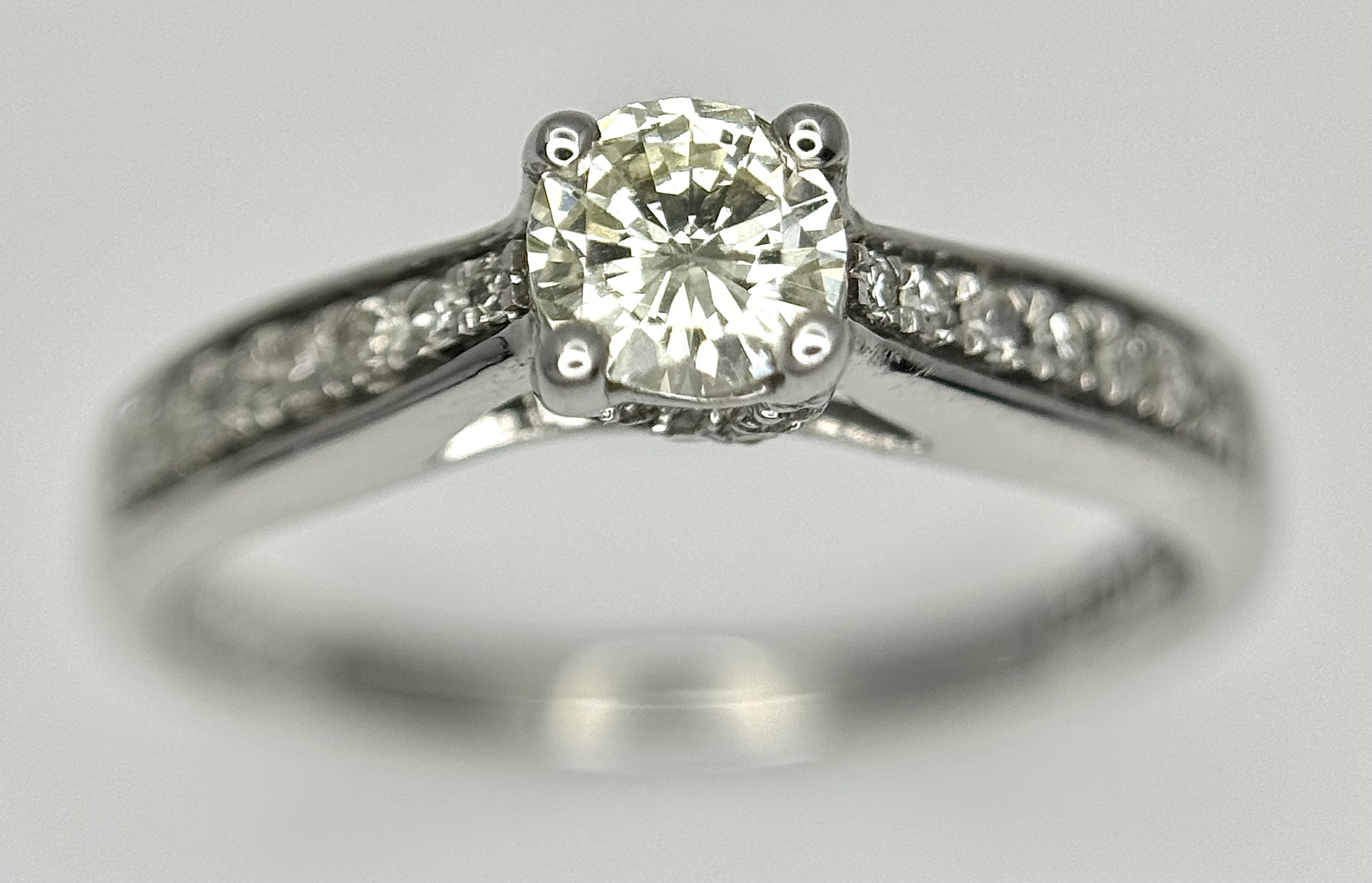 An 18k white gold diamond solitaire with diamond shoulders ring, 0.50ct diamond weight, 2.9g total weight, ring size J. NM05