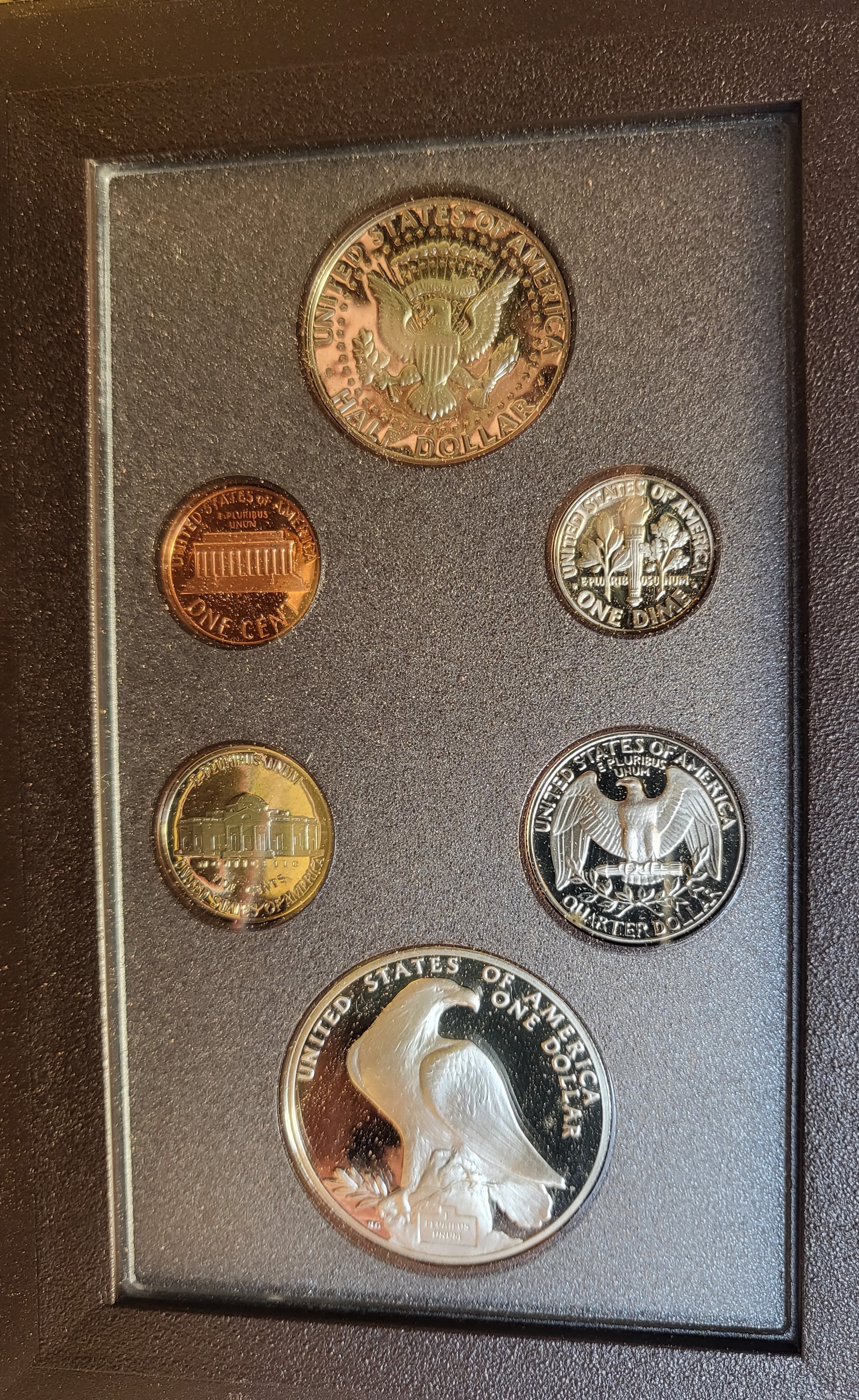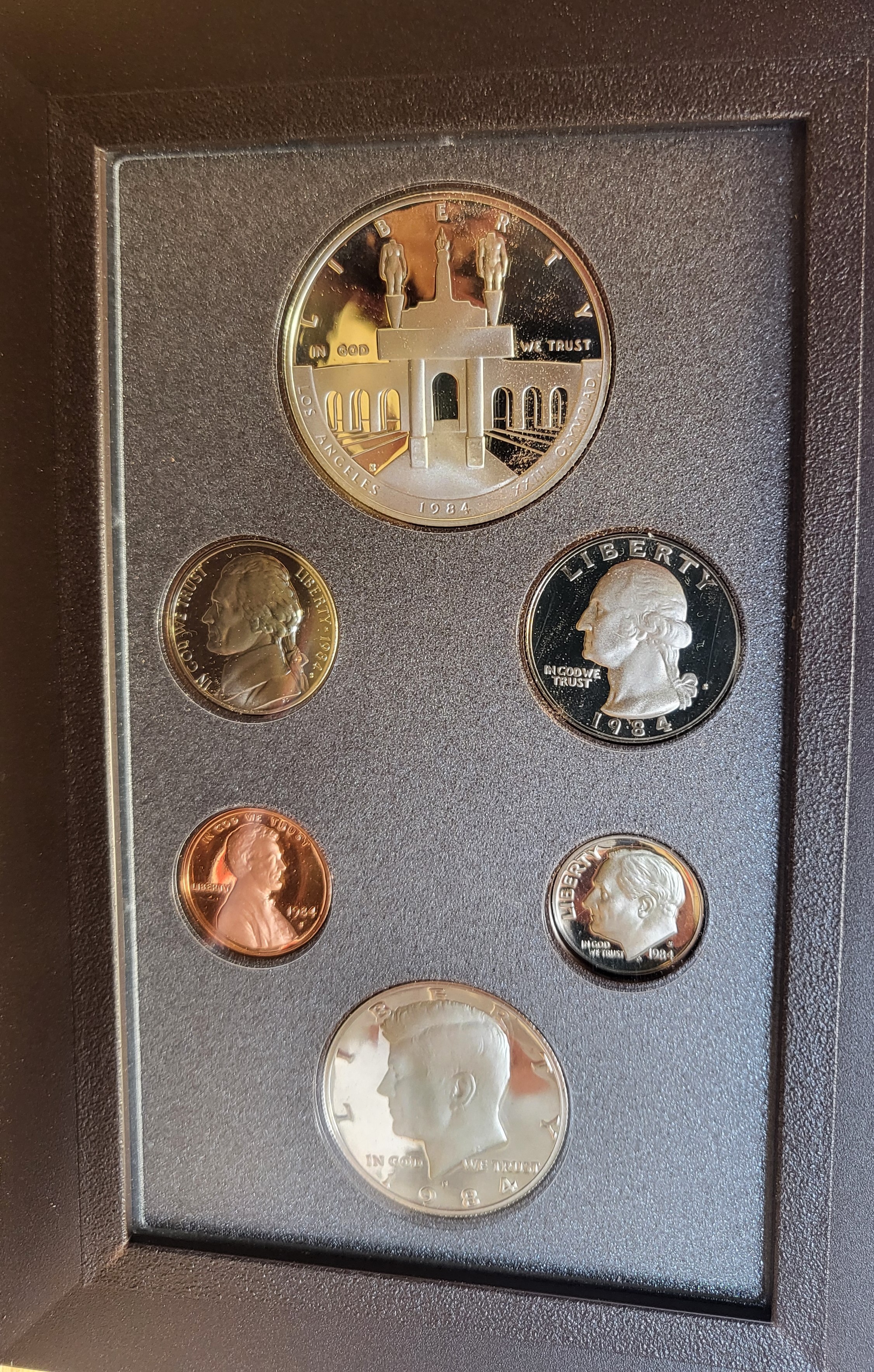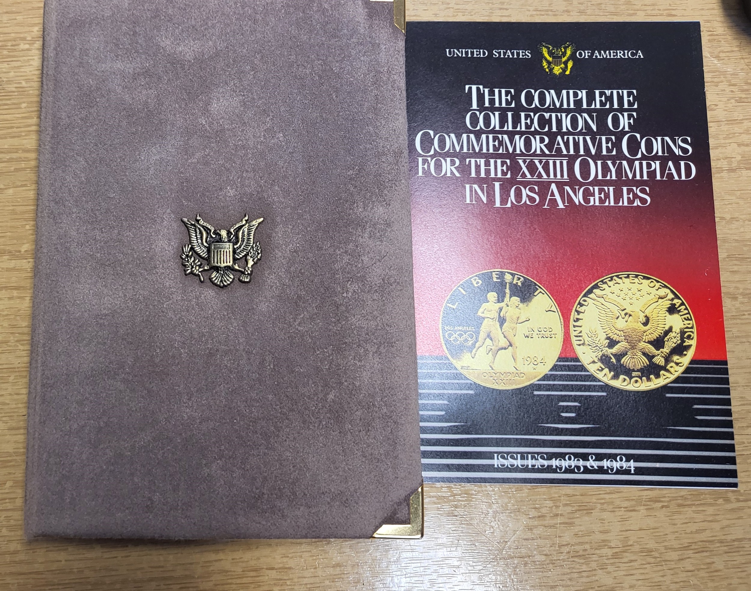 A collection of commemorative coins for the XXIII Olympiad in Los Angeles in a presentation case.