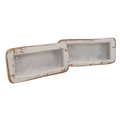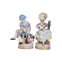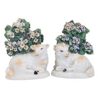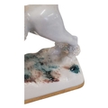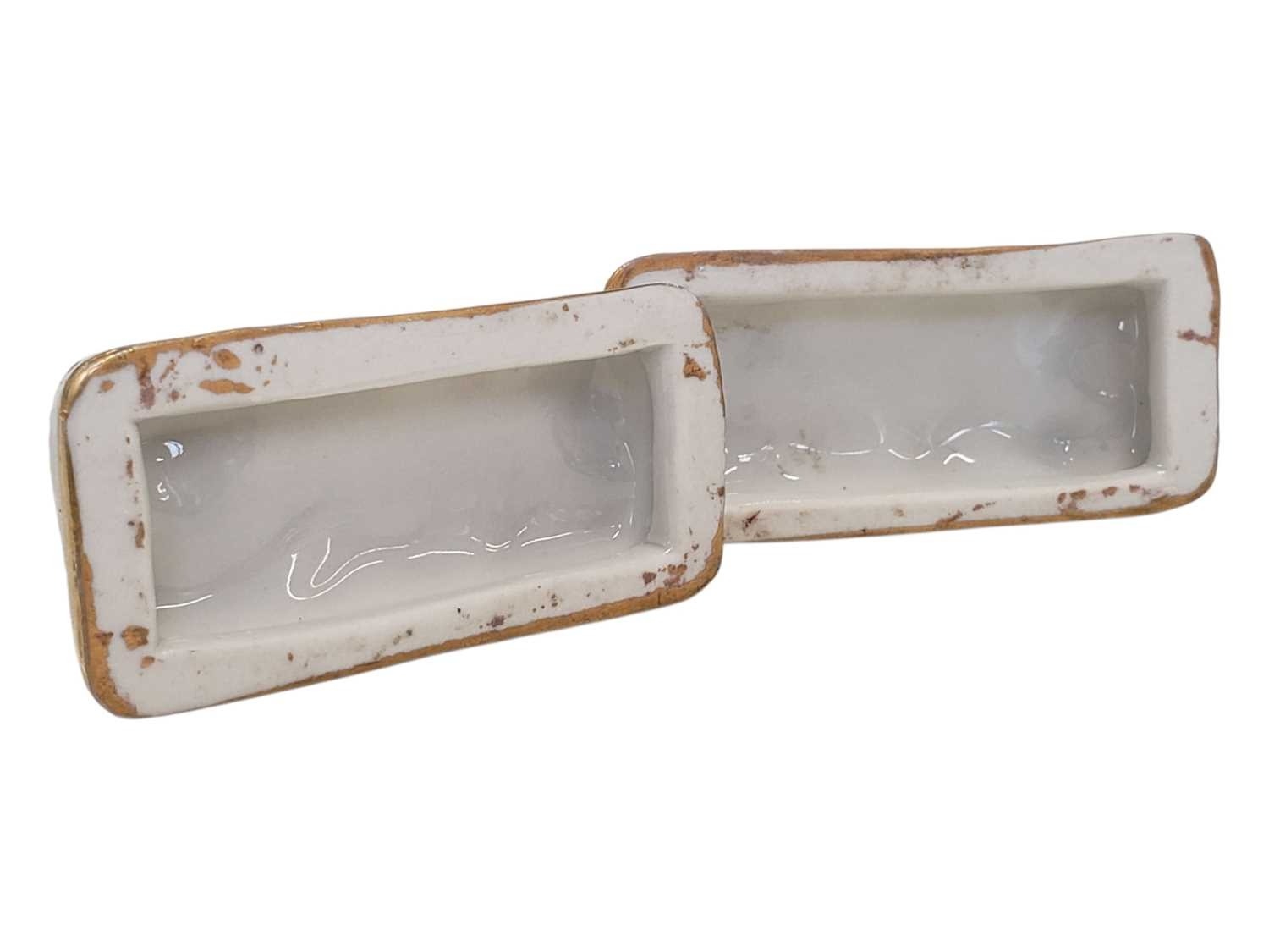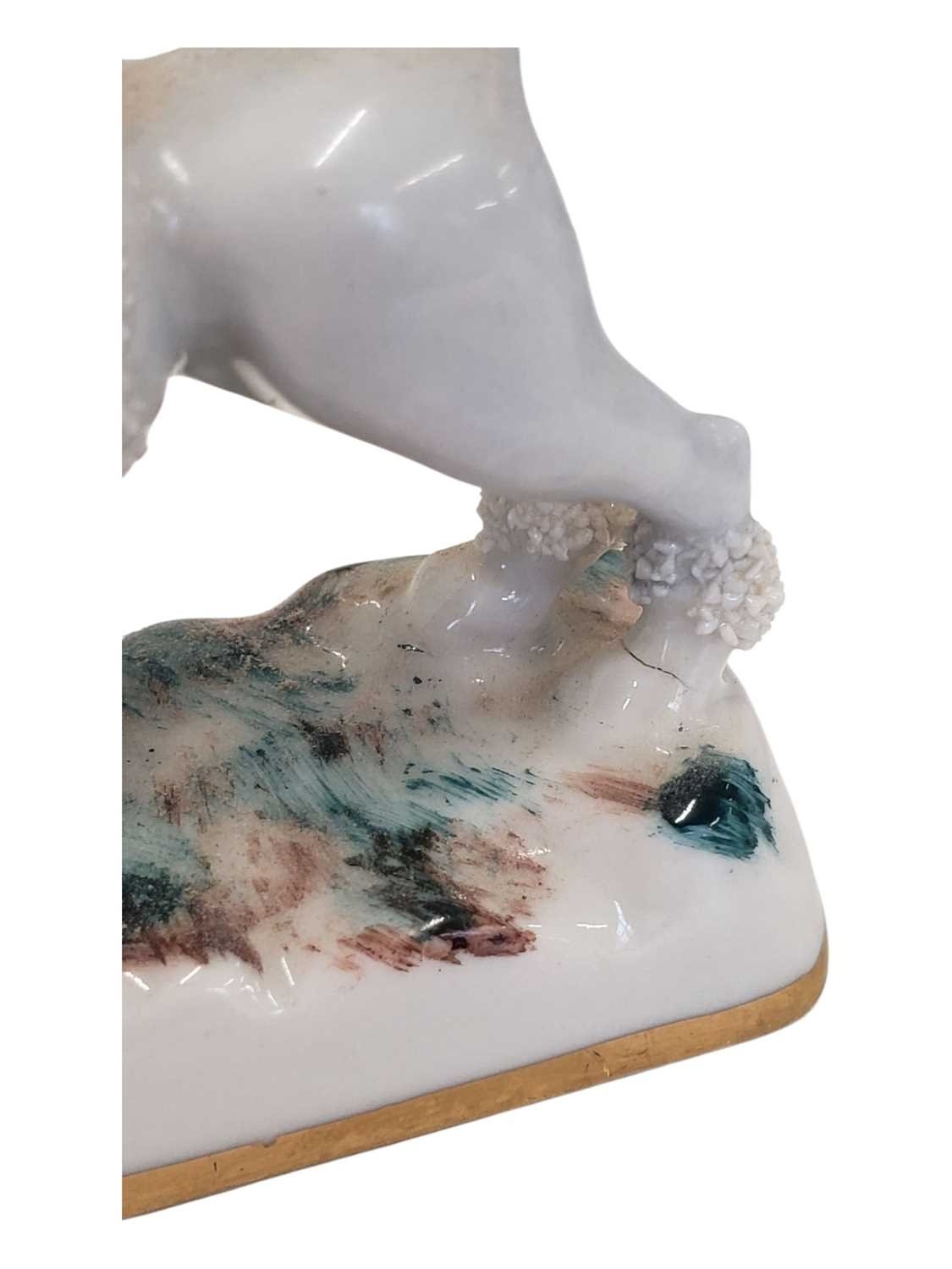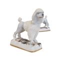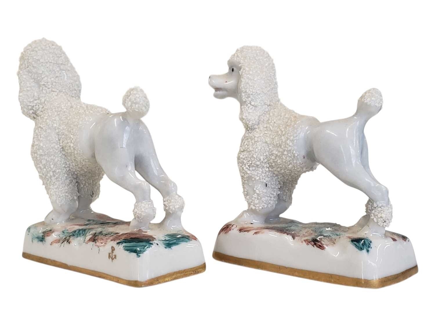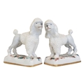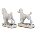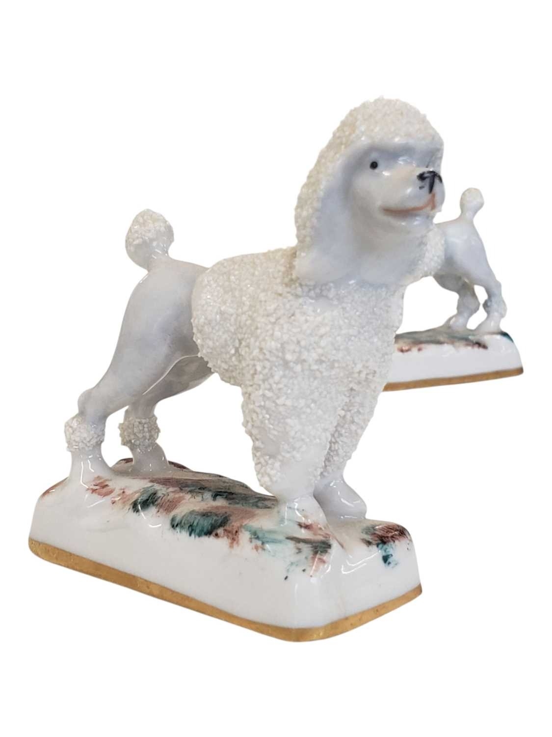 A pair of 19th century Staffordshire poodle dogs. Porcelain china construction the dogs standing on a naturalistic base with hand painted / crafted design in a white colourway with gilt border base.