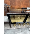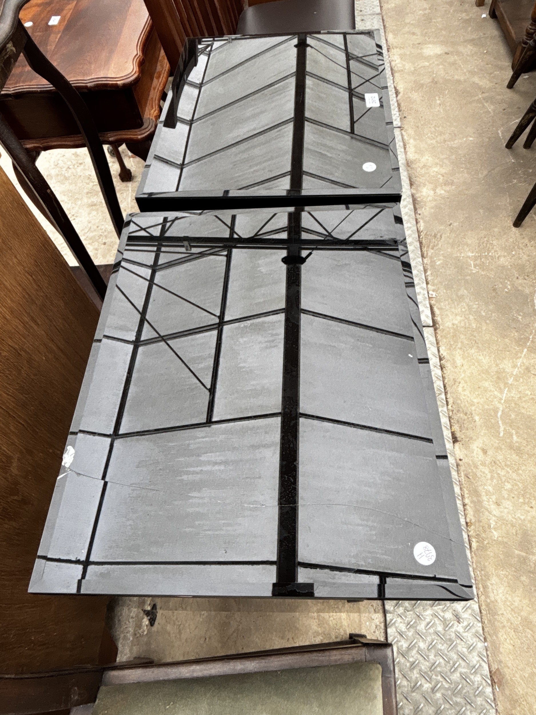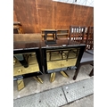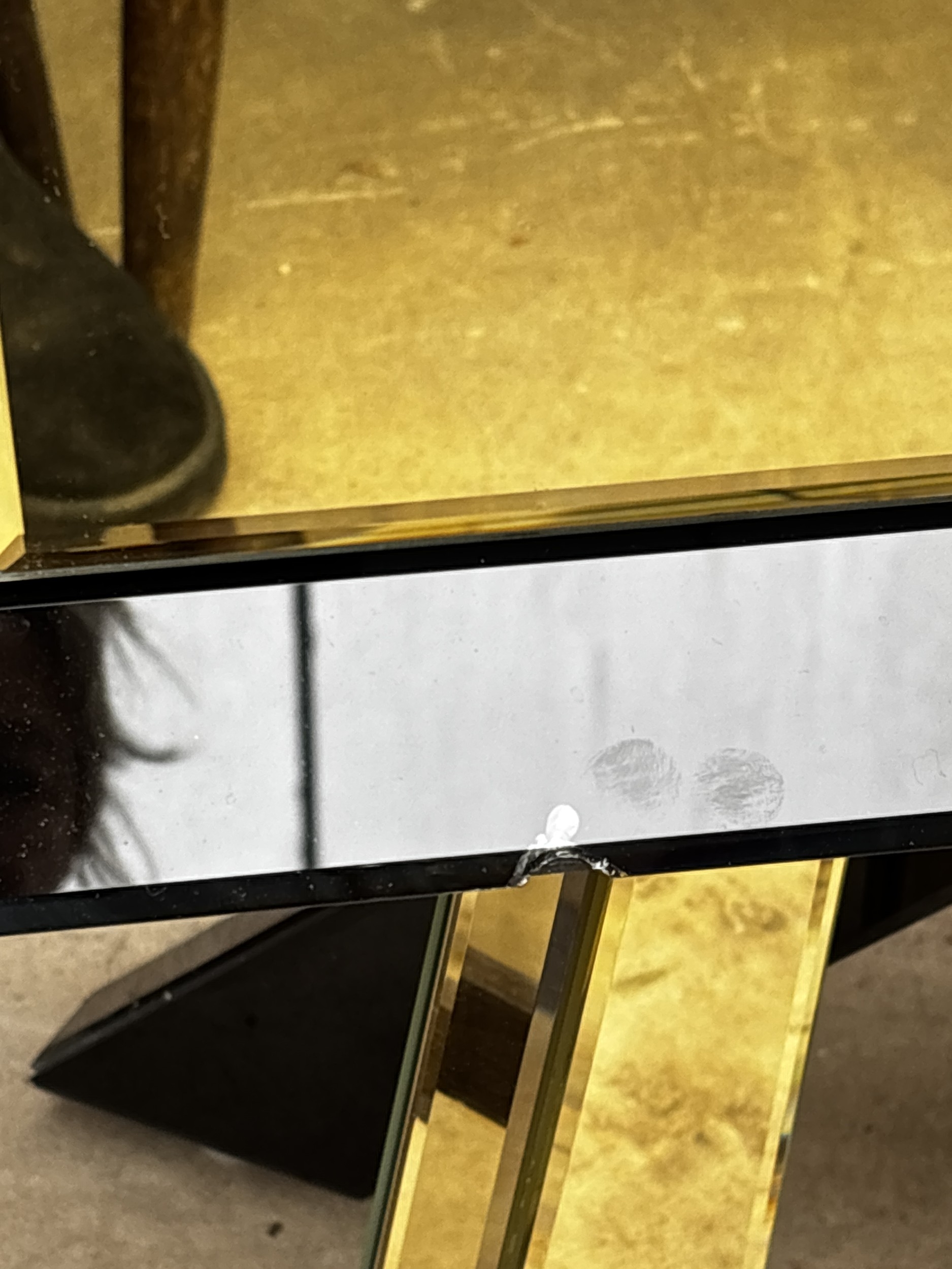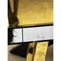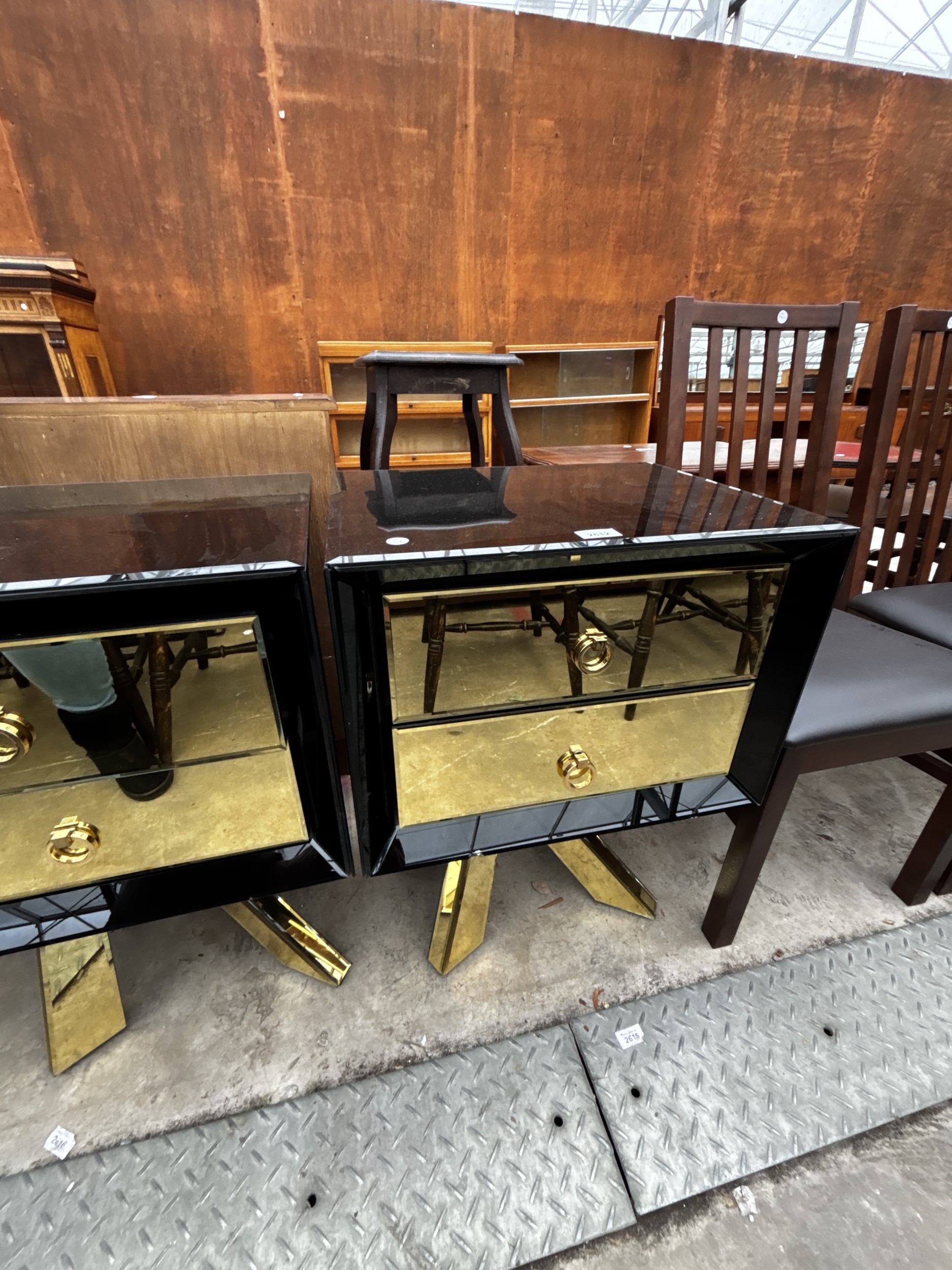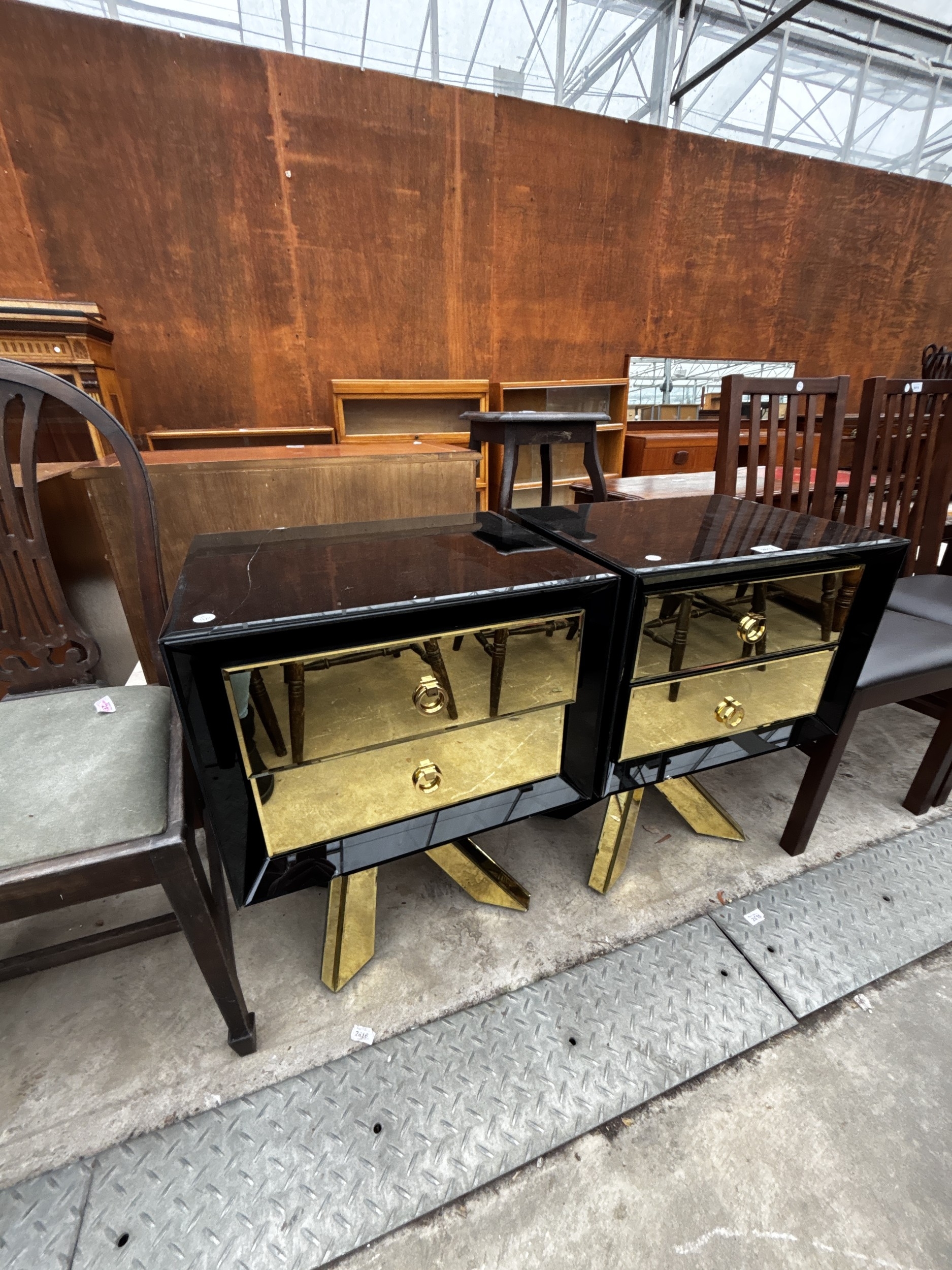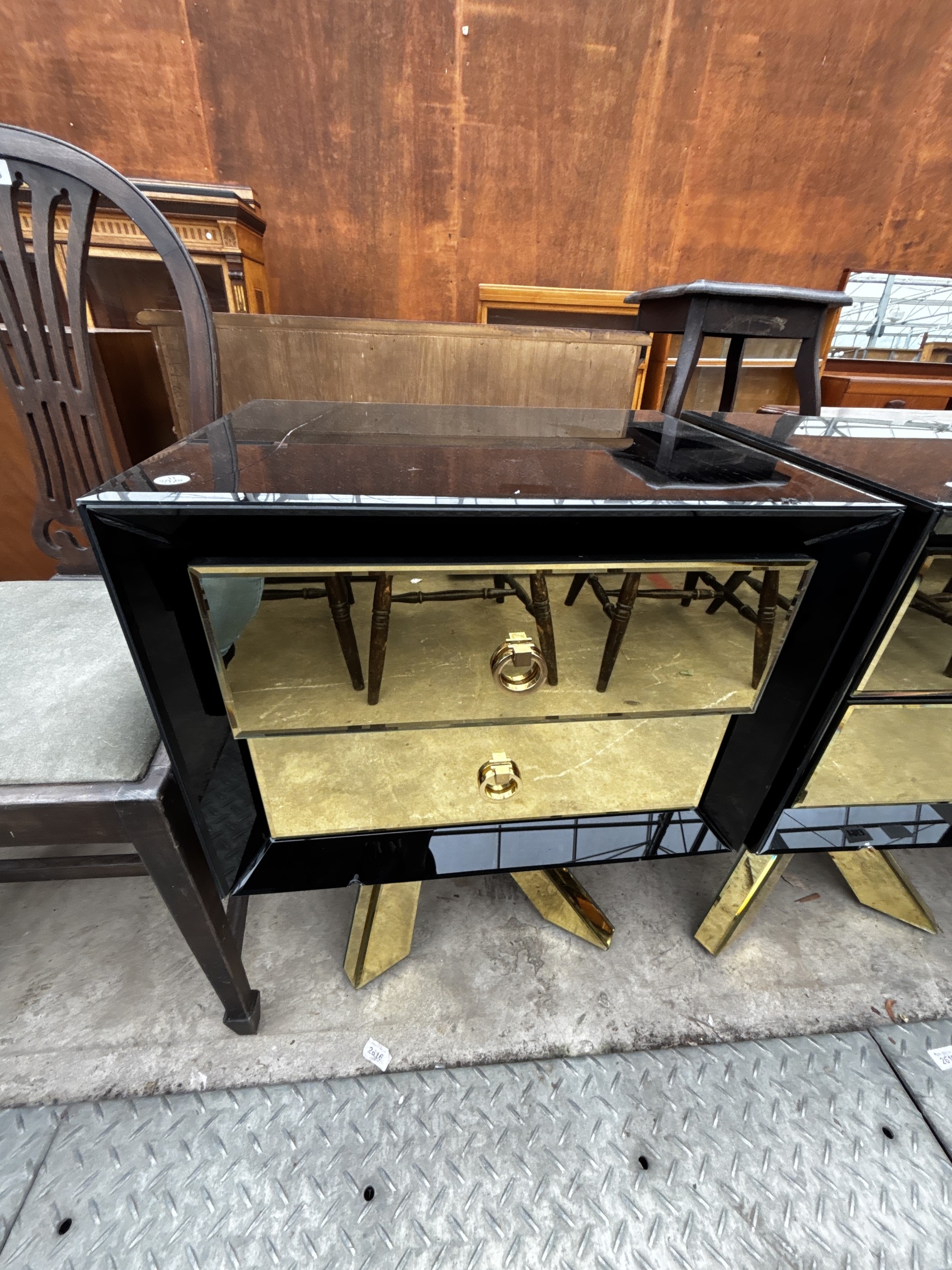 A PAIR OF BLACK GLASS BEDSIDE CHESTS EACH WITH TWO GOLD COLOURED DRAWERS AND MIRRORED LEGS