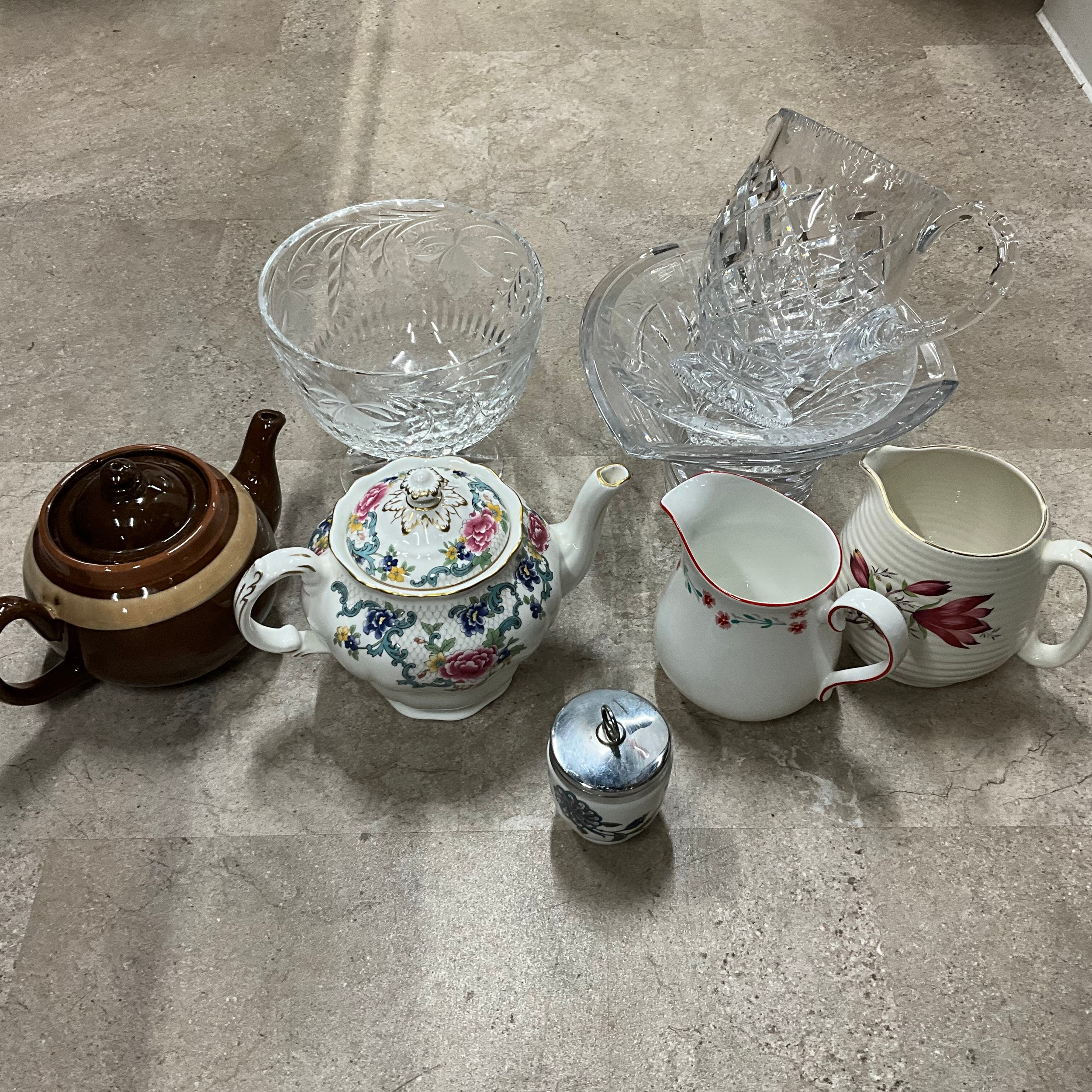 Fine glassware including fruit bowl, jug vase etc. and two teapots.