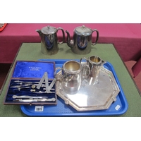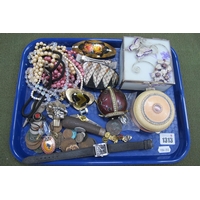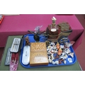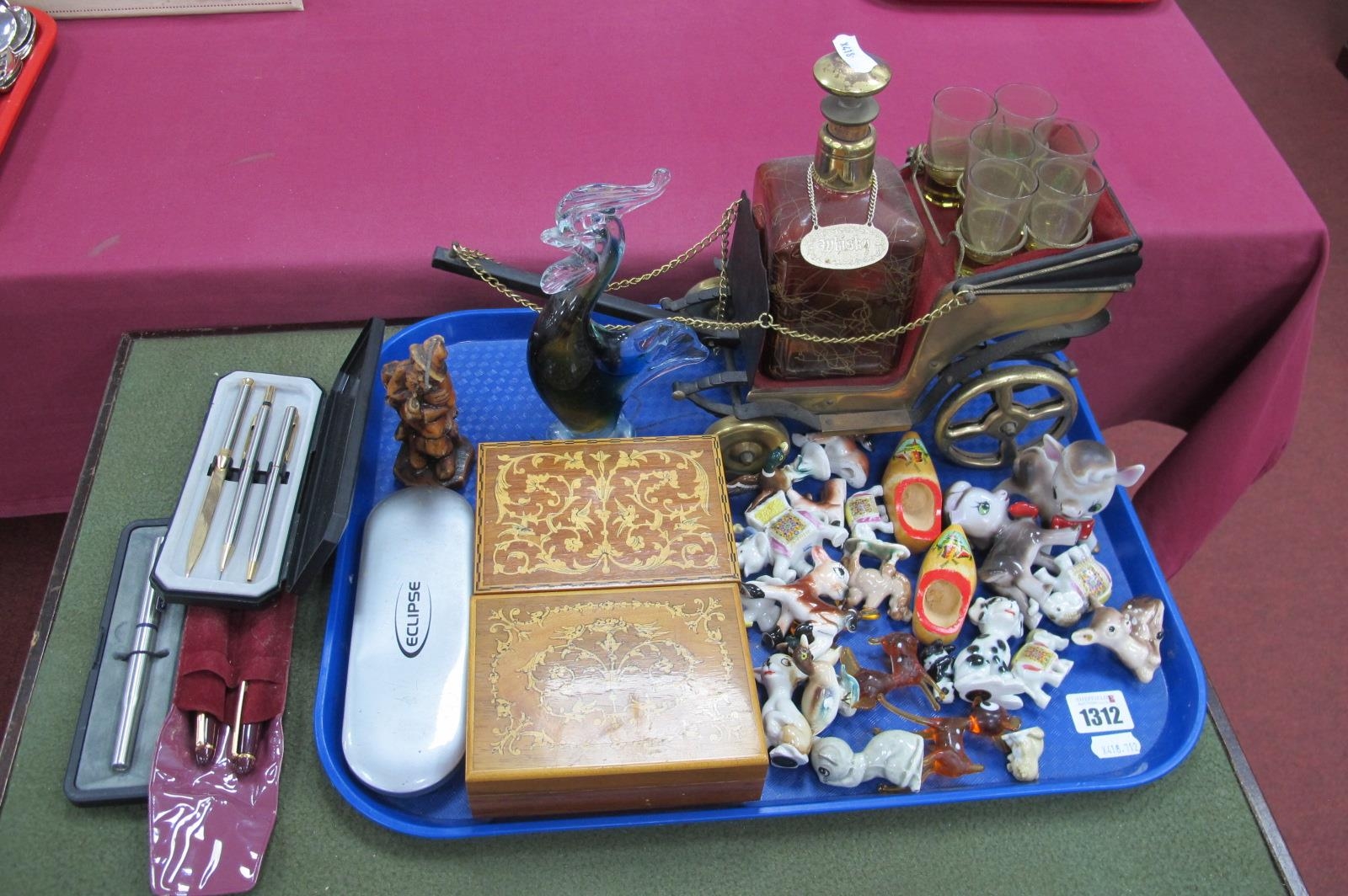 Whiskey Carriage, Wade and other figures, musical boxes, glass swan, writing implements.
