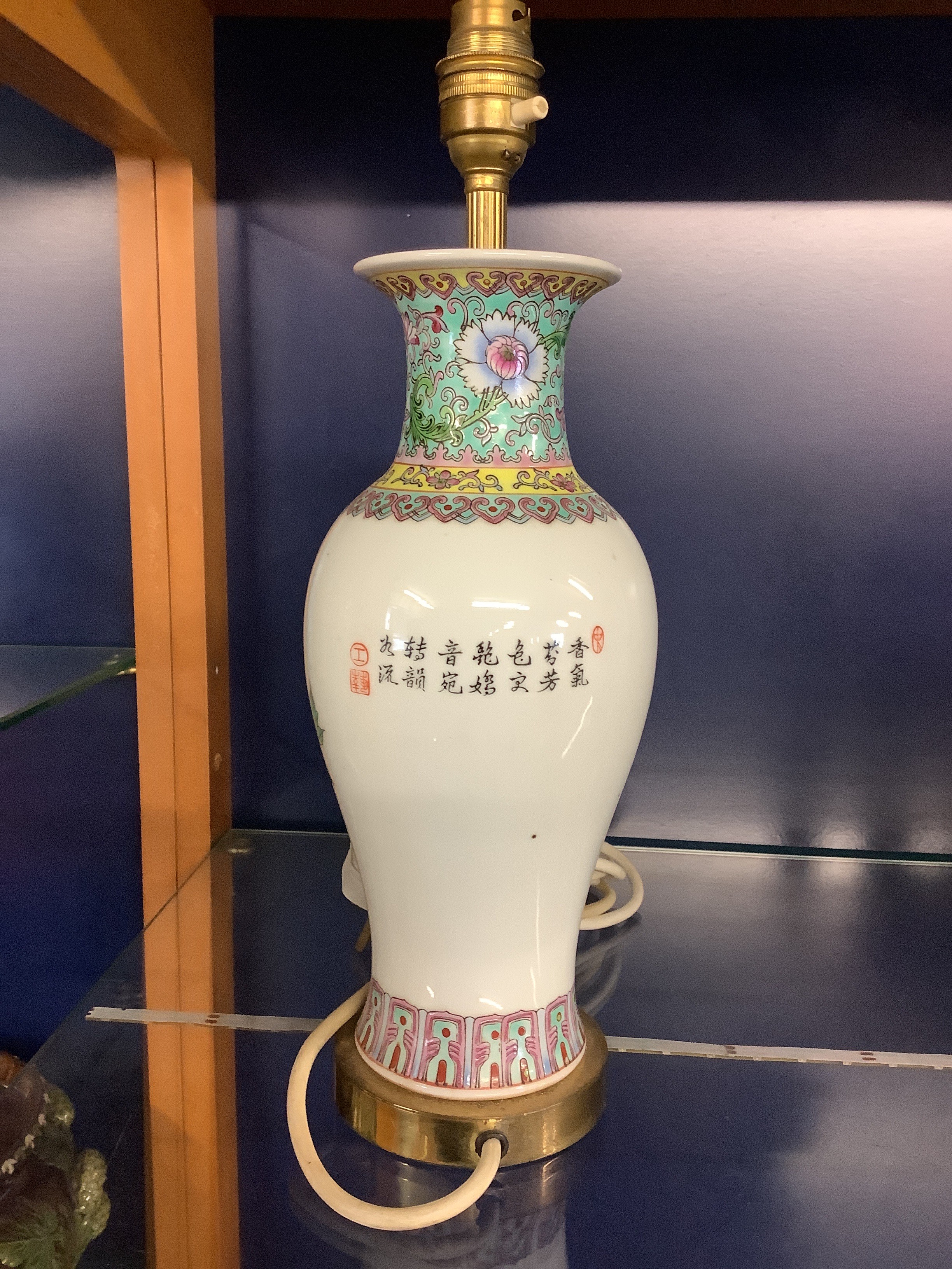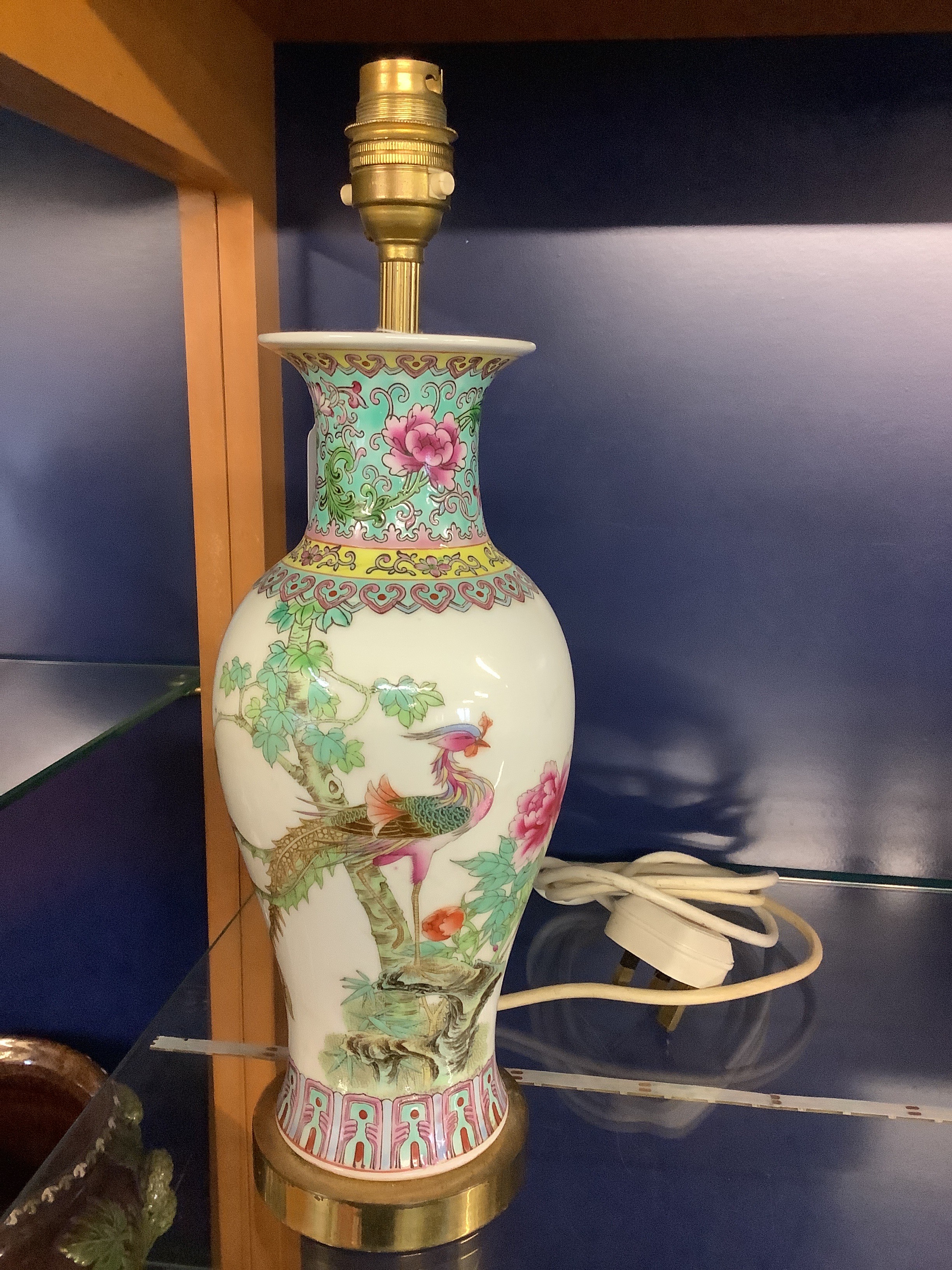 A Chinese famille rose vase having peacock and floral decoration now converted to a table lamp fully marked with script etc
