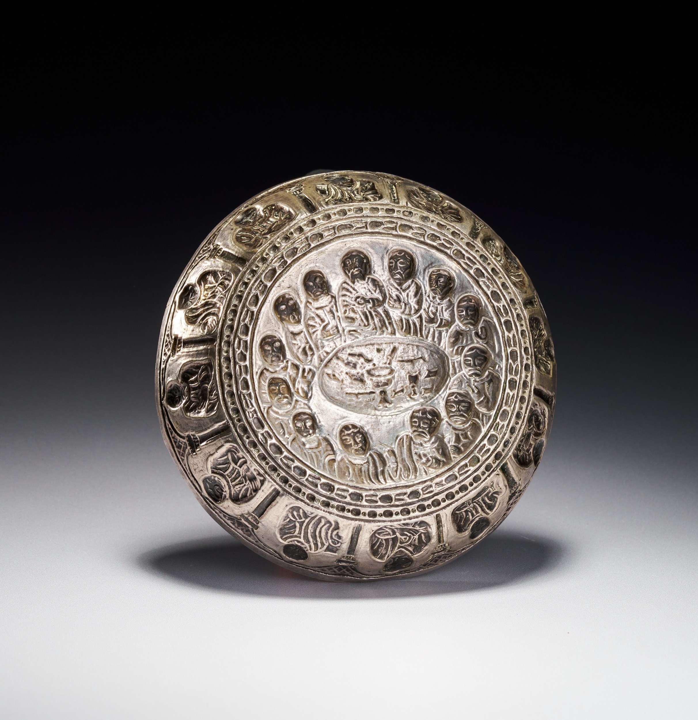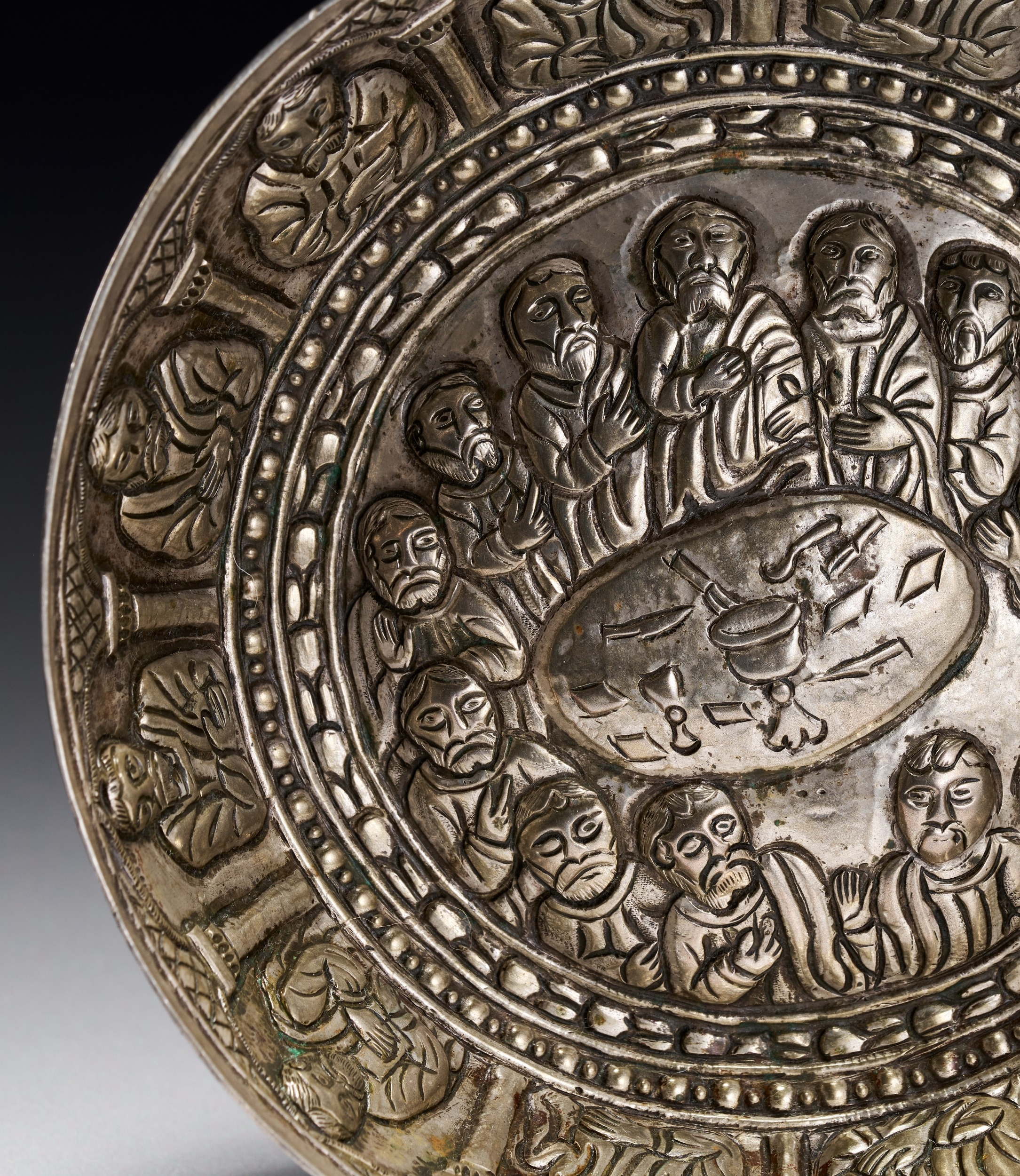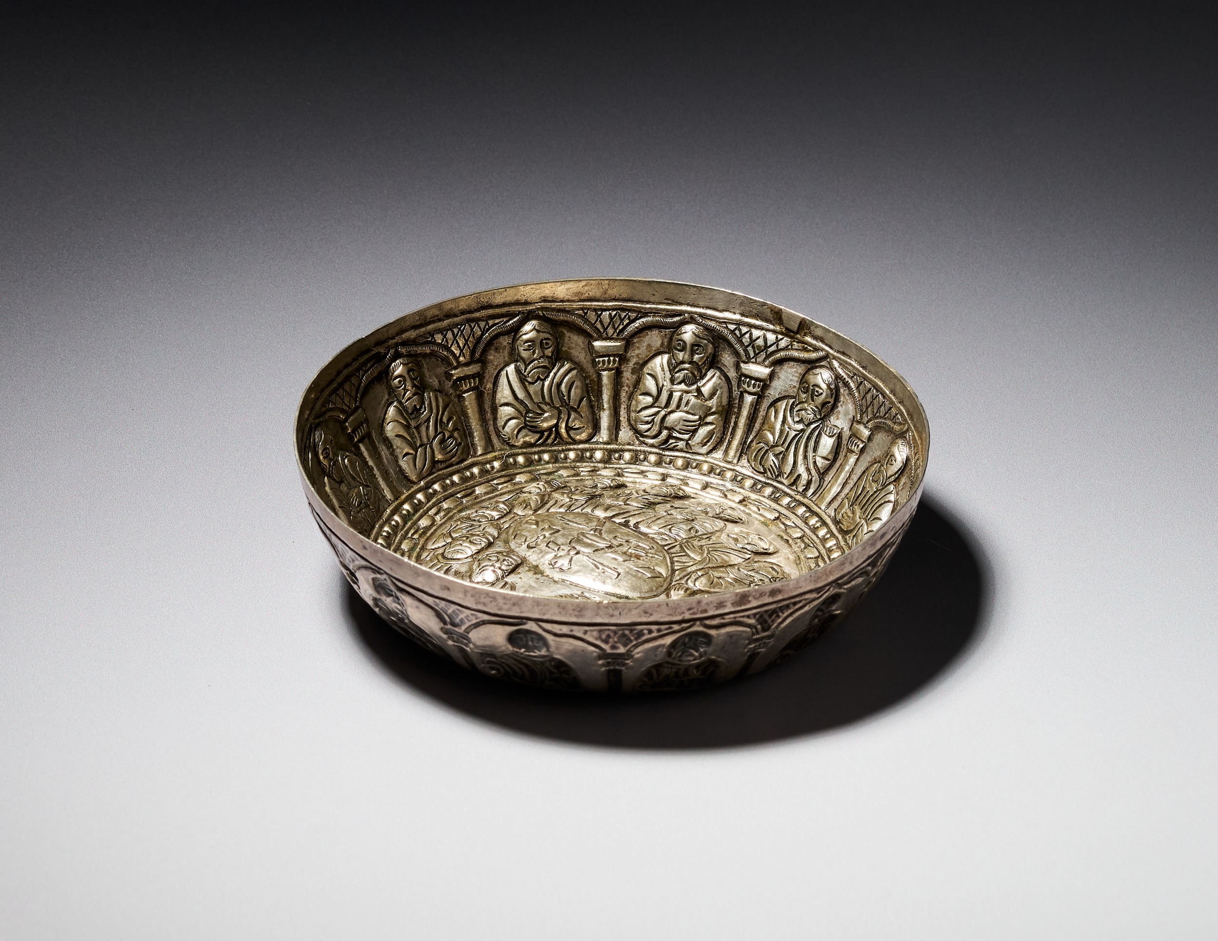 A silver bowl of circular form featuring high-relief repousse and chased decoration. The interior base depicts the Last Supper with Christ and the twelve apostles gathered around an oval table set with a central chalice and bread. The scene is enclosed by concentric beaded and linear borders. Both the interior and exterior side walls are decorated with a continuous frieze of individual figures, likely saints or apostles, situated within arched architectural niches supported by columns against a cross-hatched background.