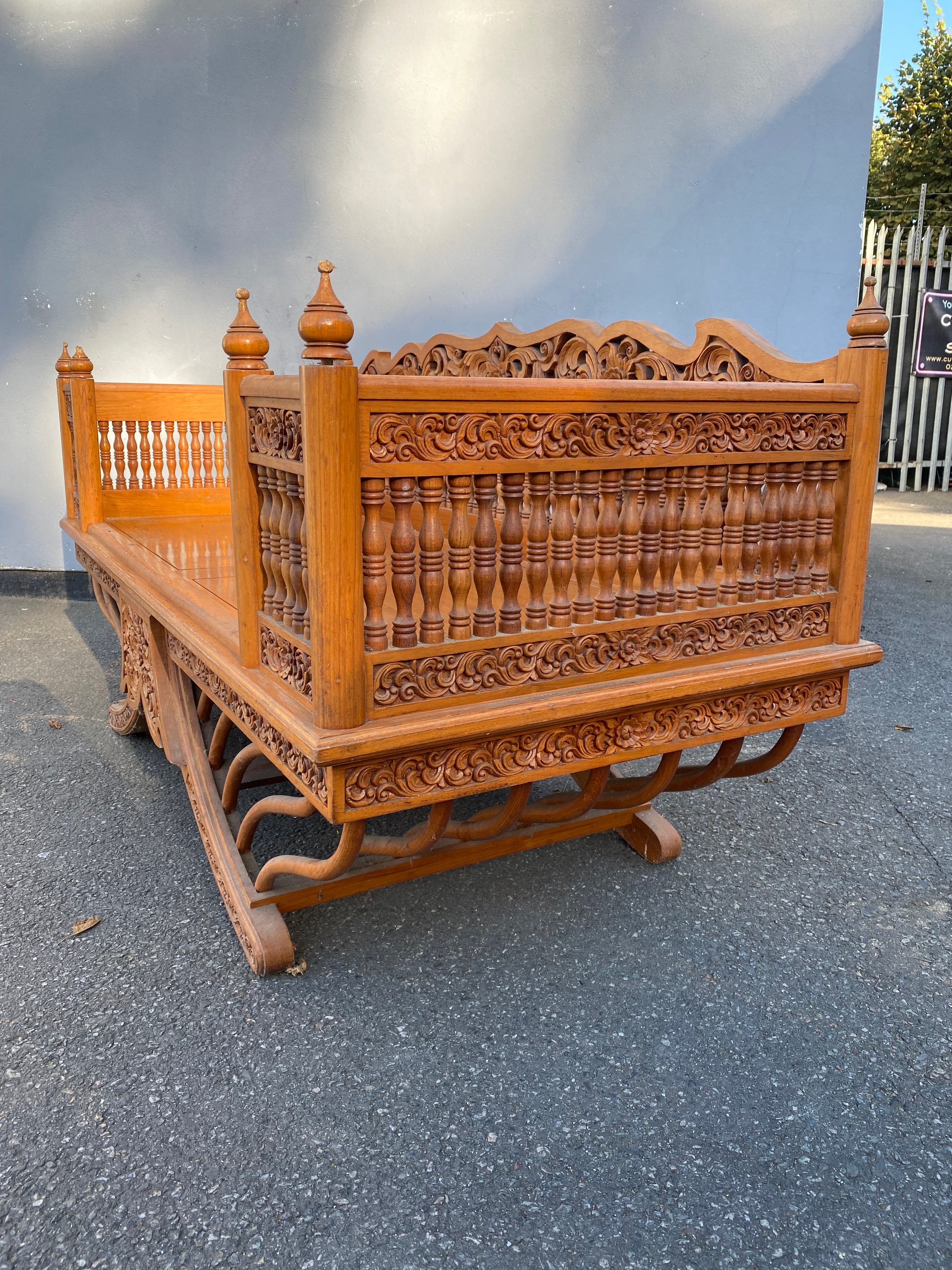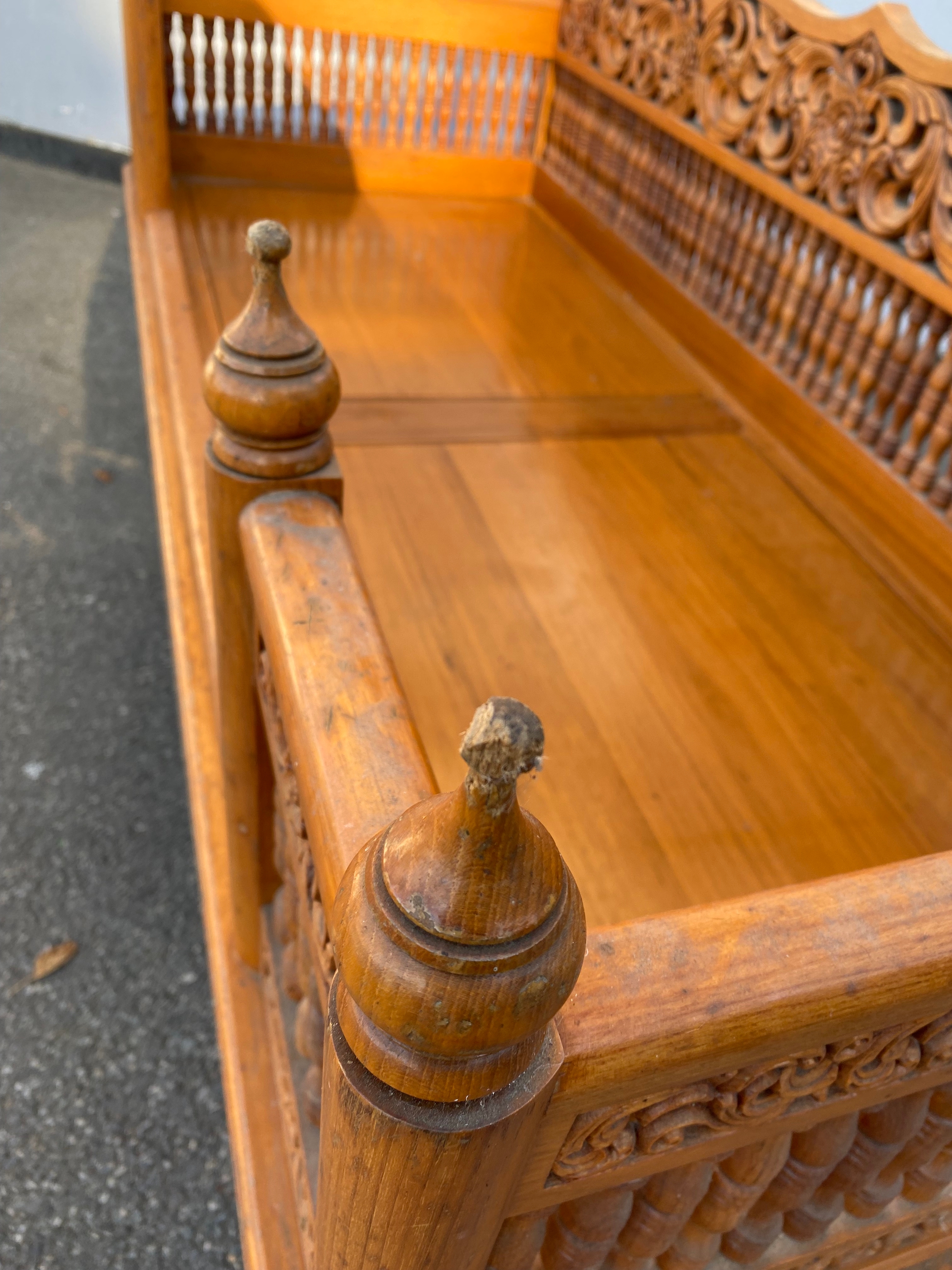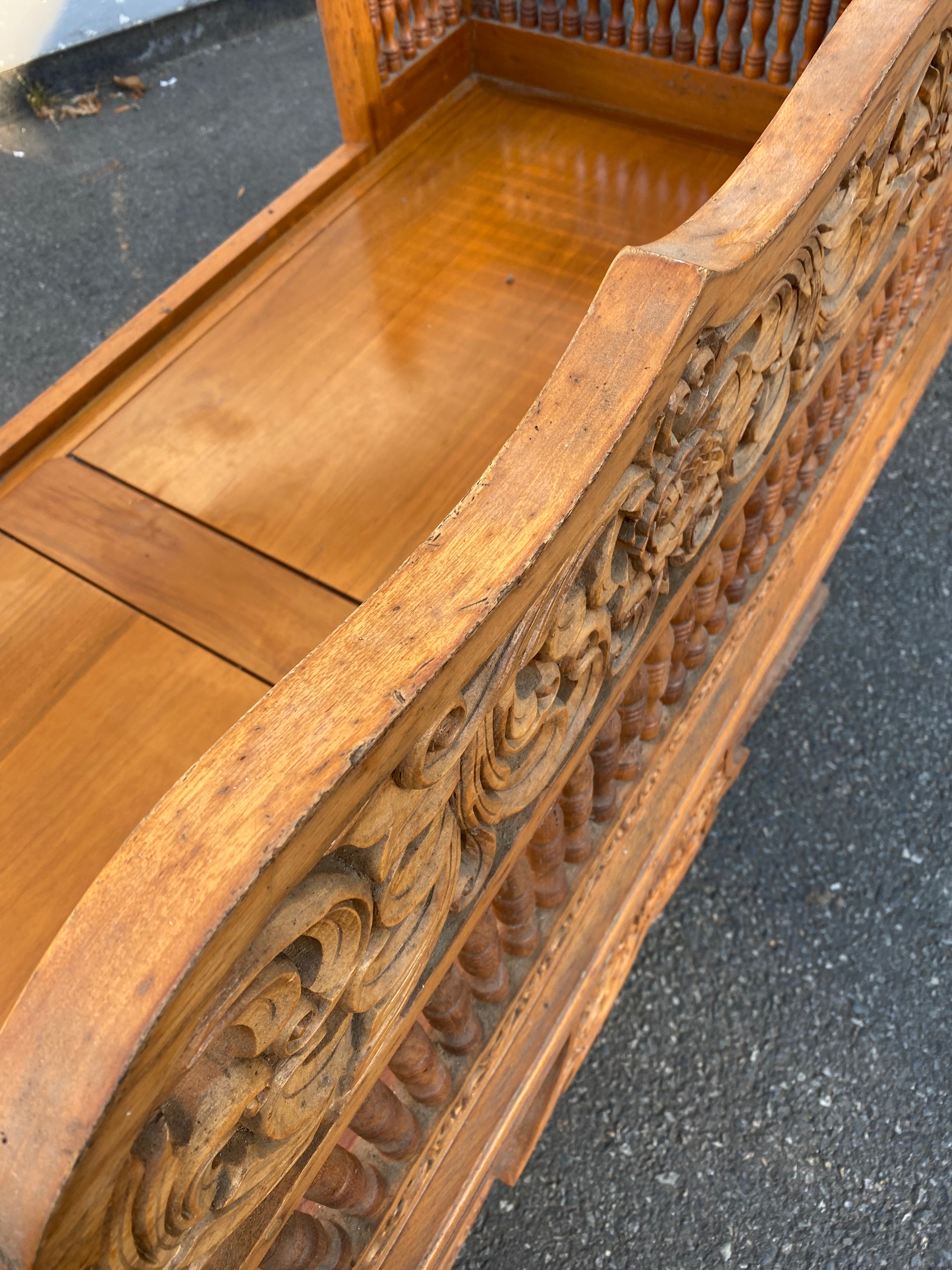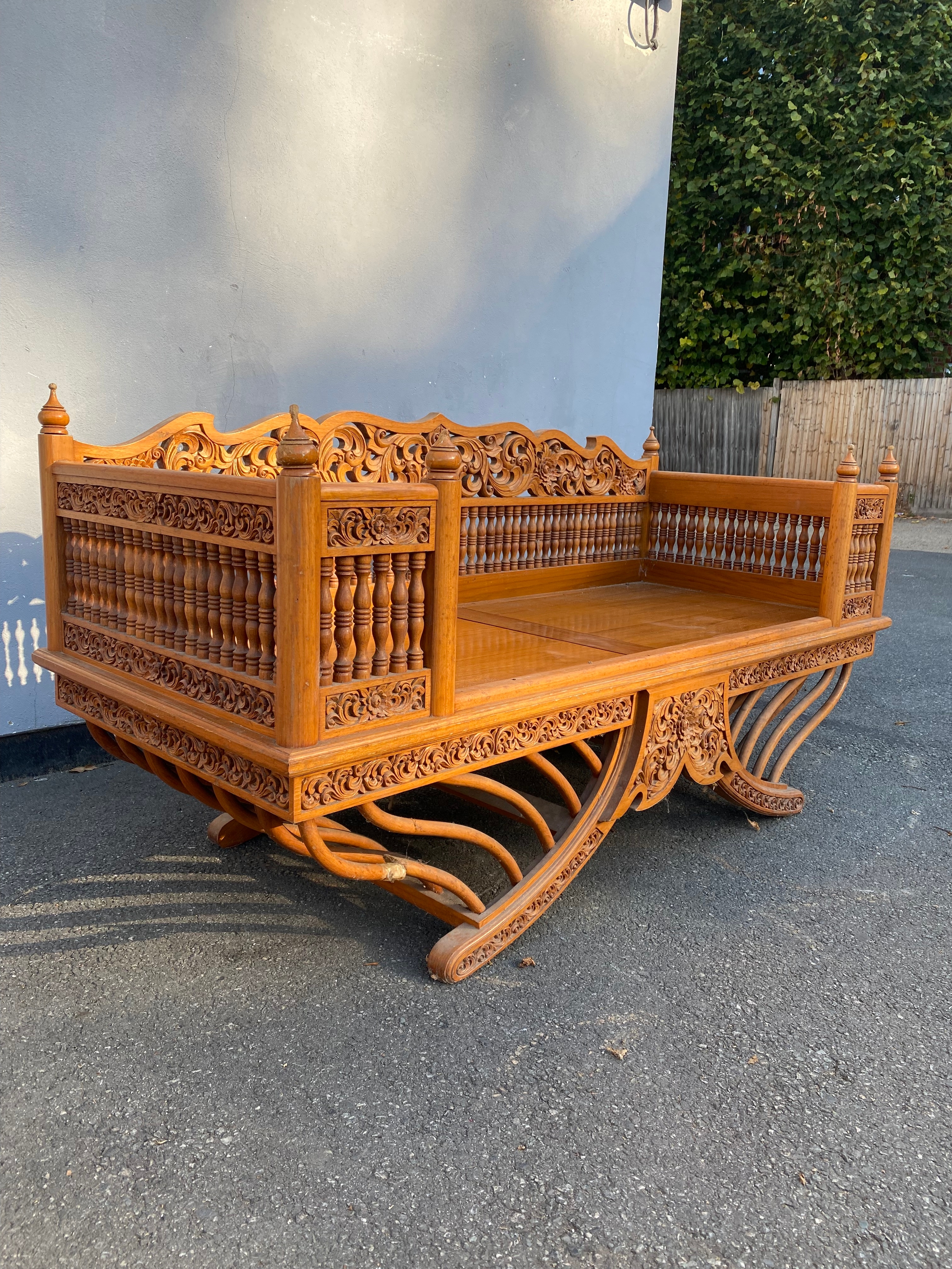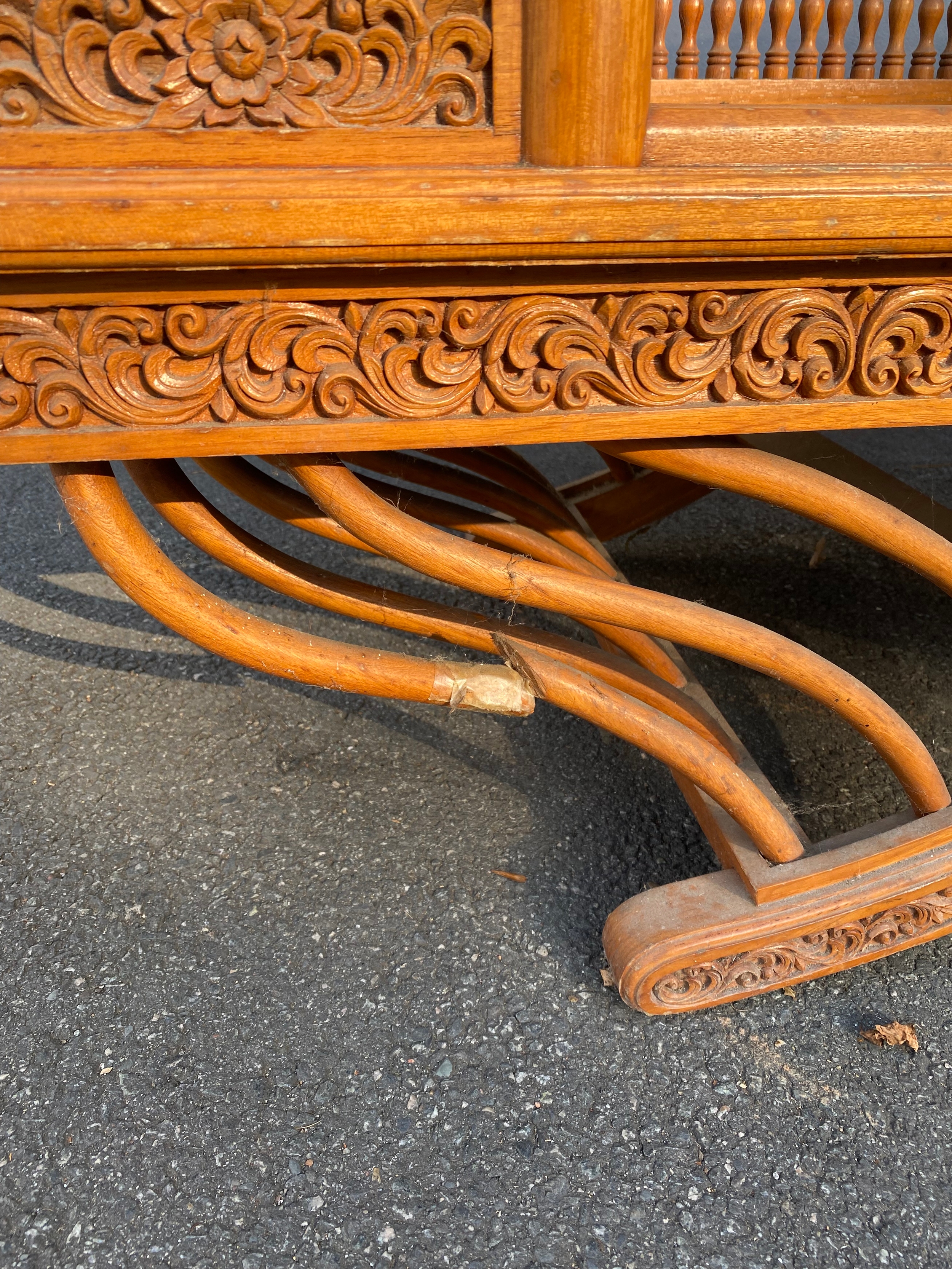 Large Exquisite Hand-Carved Wooden Swing seat with carved floral backrest.