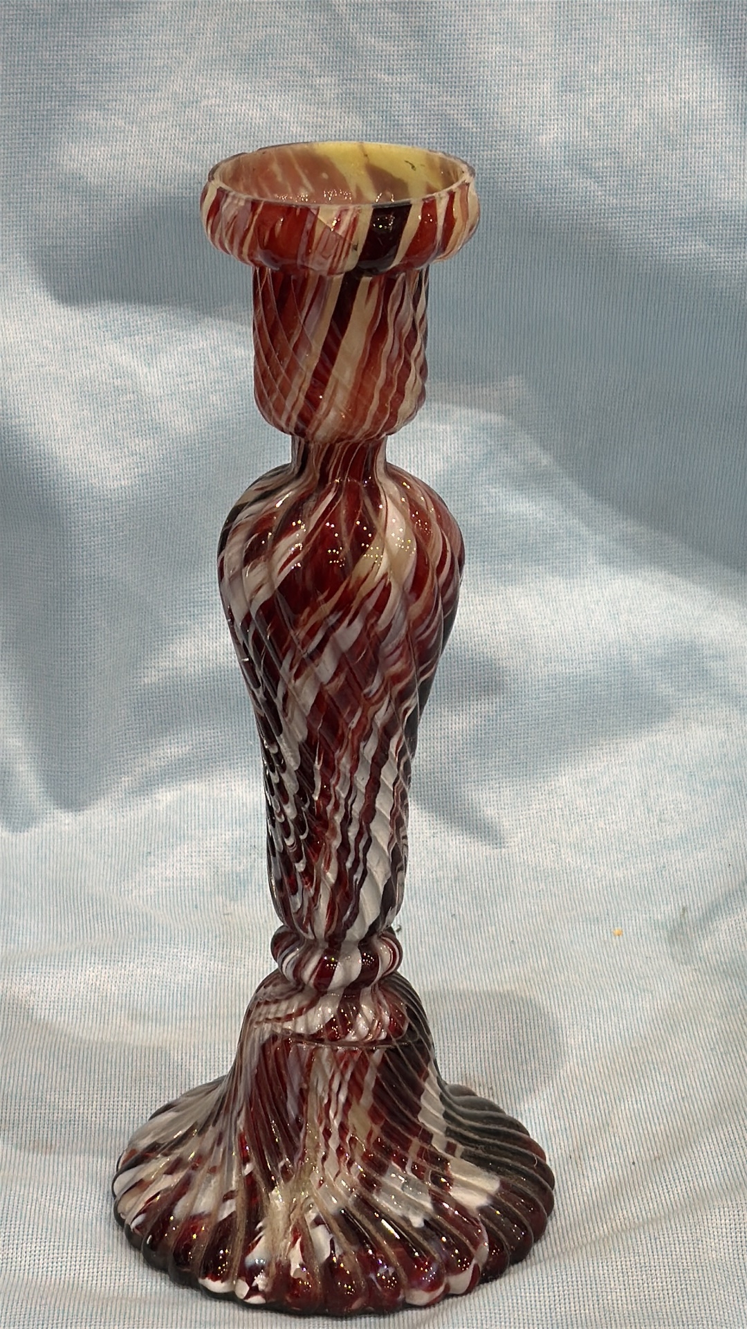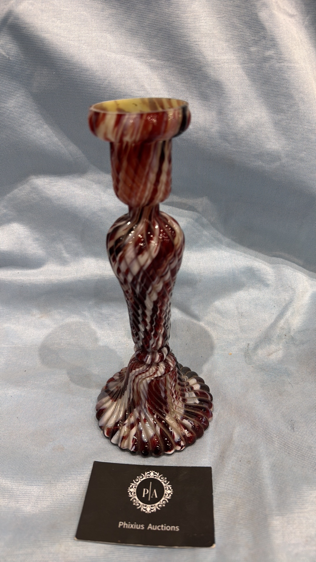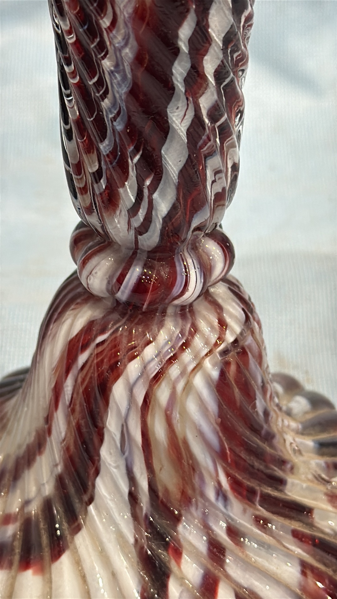 Spiral-moulded candlestick of marbled red, white and cream art glass, the fluted stem rising from a scalloped circular foot, contemporary decorative design.
