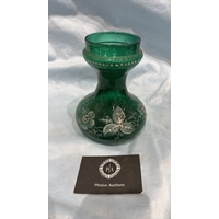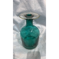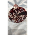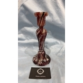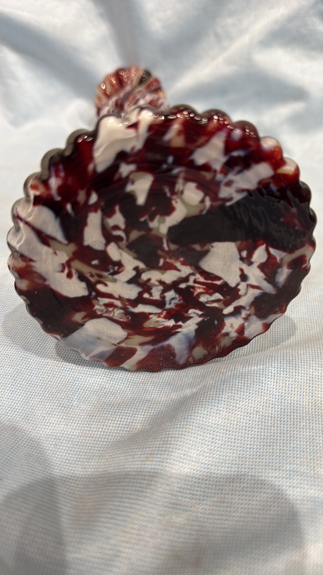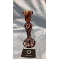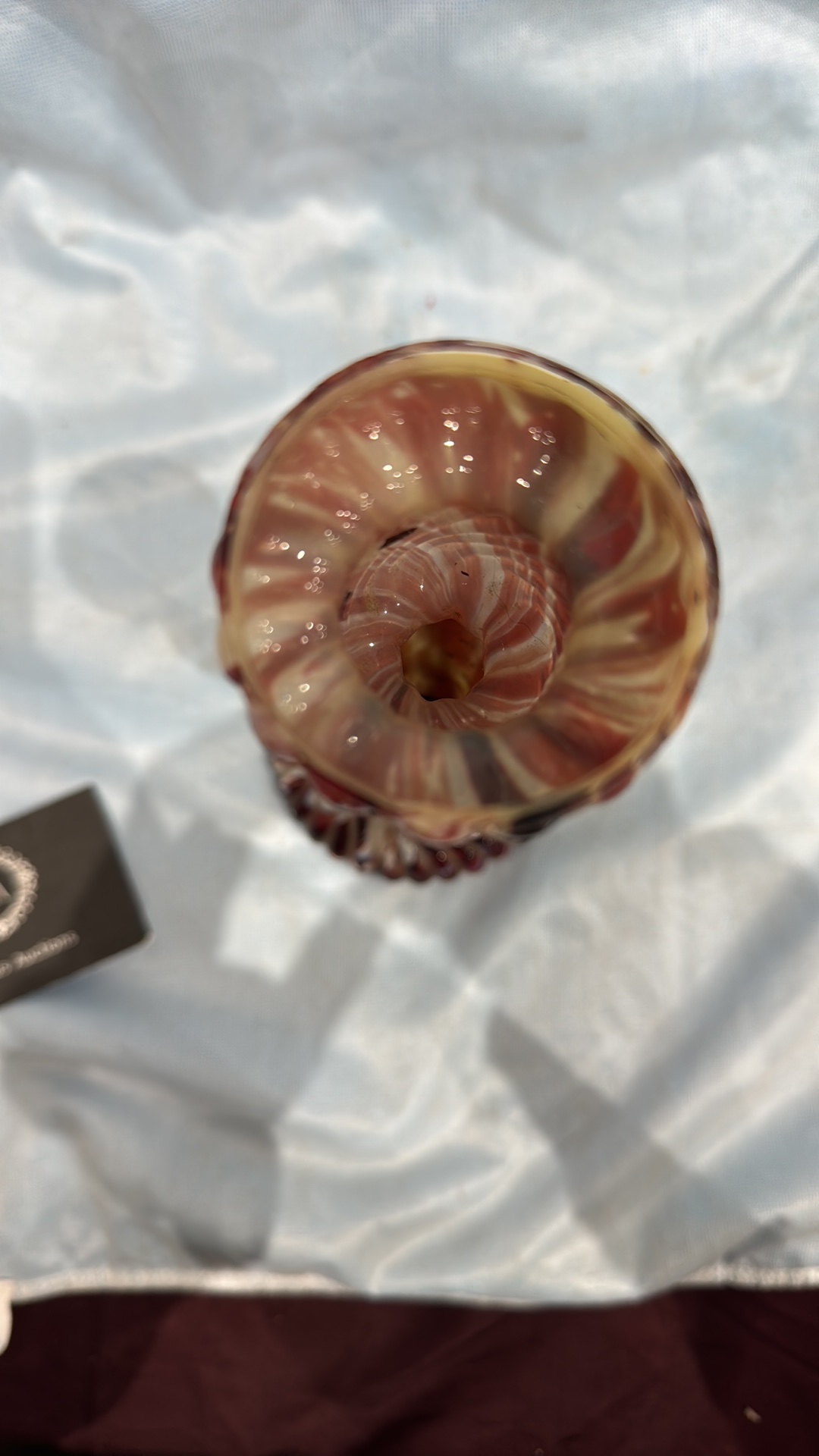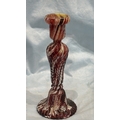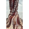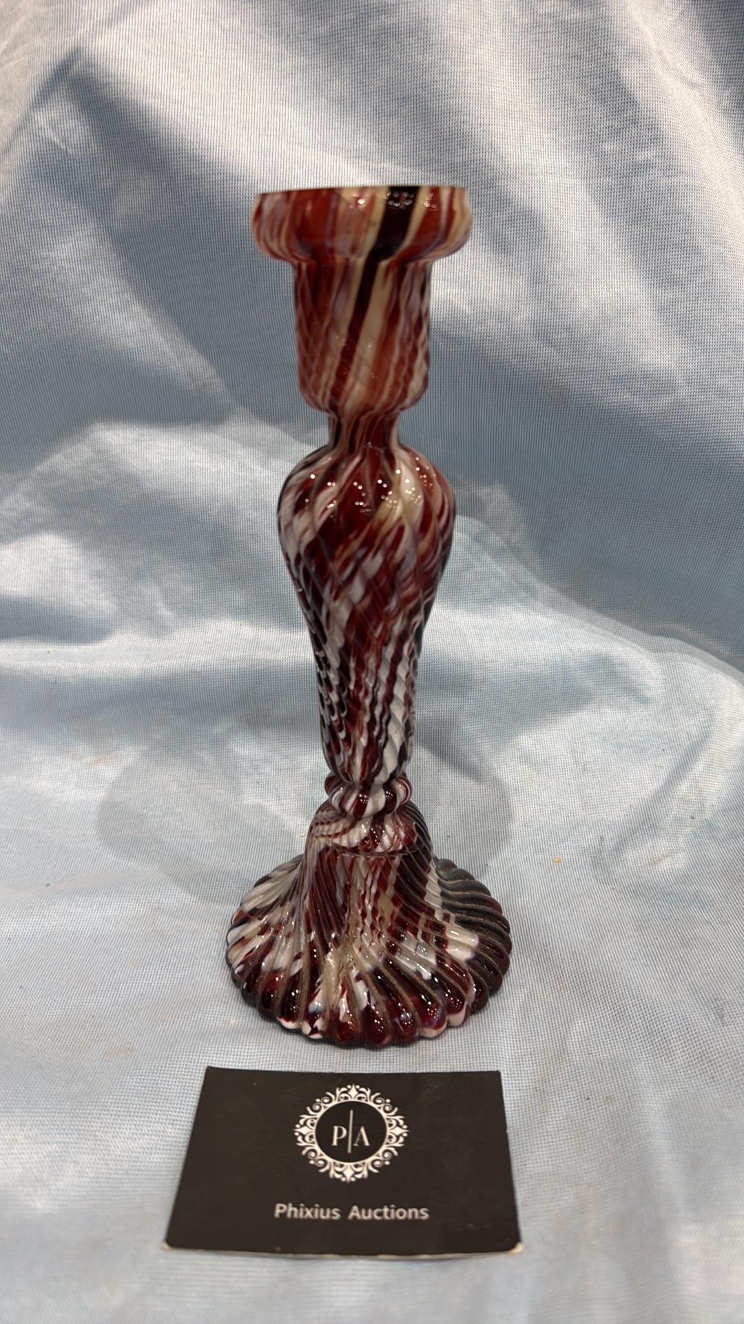 Spiral-moulded candlestick of marbled red, white and cream art glass, the fluted stem rising from a scalloped circular foot, contemporary decorative design.