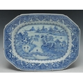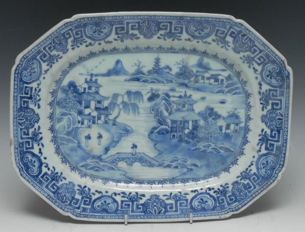 A Chinese canted rectangular meat plate, decorated in tones of underglaze blue with figures in a monumental landscape of pagodas and mountains, scroll and trellis border, 32.5cm wide, Quinlong, c.1770