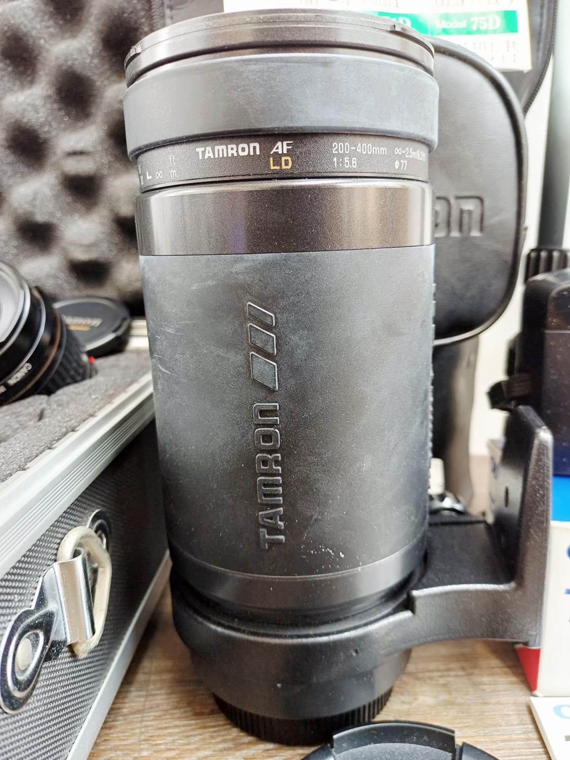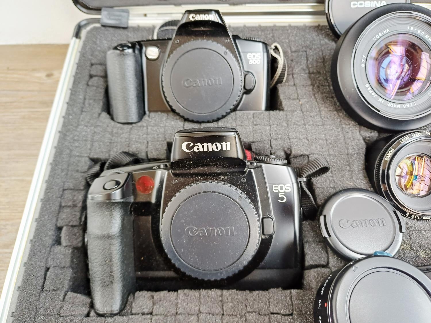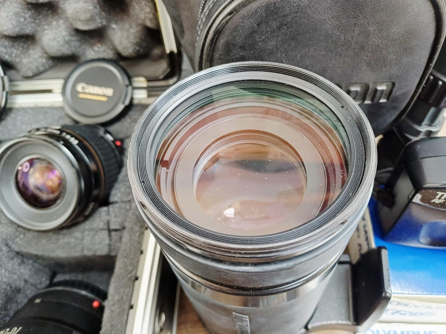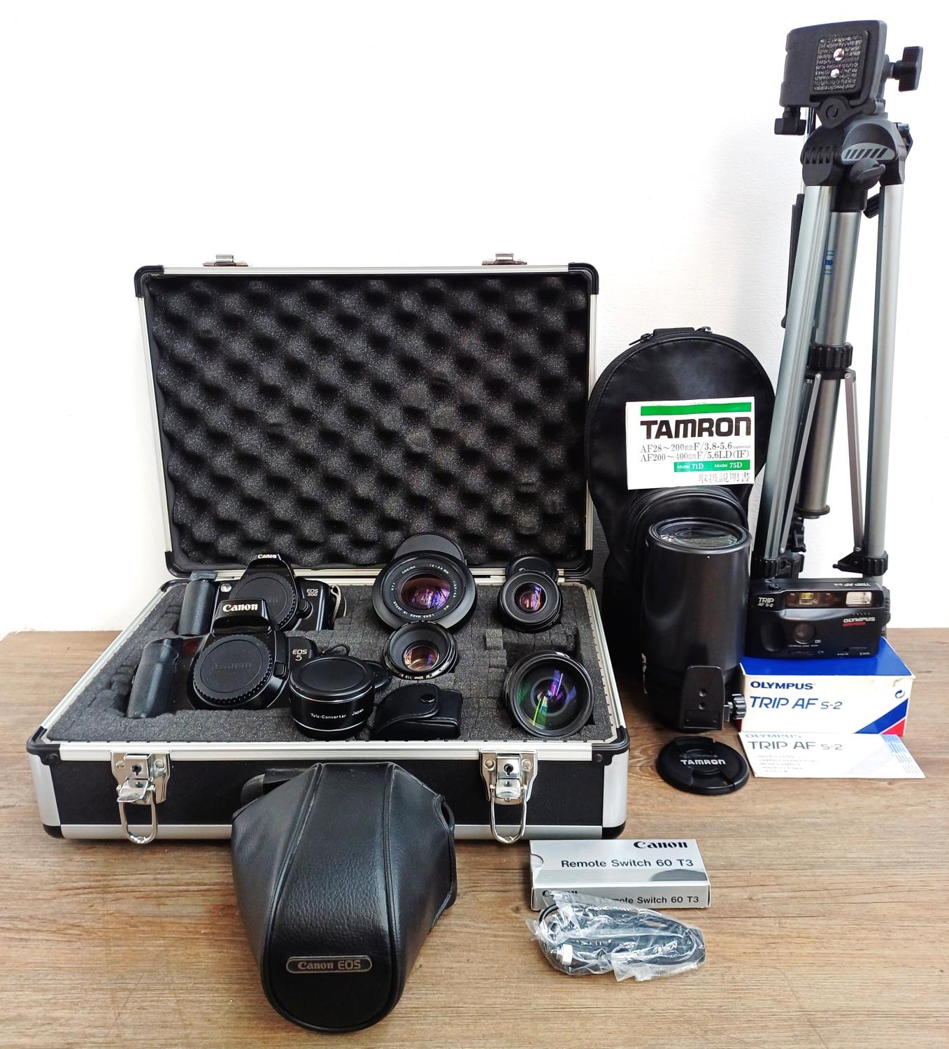 A flight case containing Canon EOS 5 advanced autofocus 35mm SLR camera body, EF 1:1.8 II 50mm lens, Cosina MC 1:3.5-4.5 19-35mm super wide angle lens for Canon AF, EF 1:4-5.6 35-80mm zoom lens, EF 1:4 70-210mm zoom lens and cased Jessop MC 2x tele-converter for Canon AF, Canon EOS 500 autofocus 35mm SLR camera body together with cased Tamron LD 1:5.6 200-400mm lens for Canon AF, Centon PV23 tripod, boxed Olympus Trip AF S-2 autofocus point-and-shoot camera, boxed Canon 60 T3 remote switch and Canon EOS EH8 LL camera case