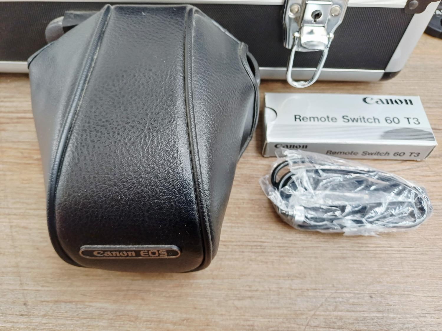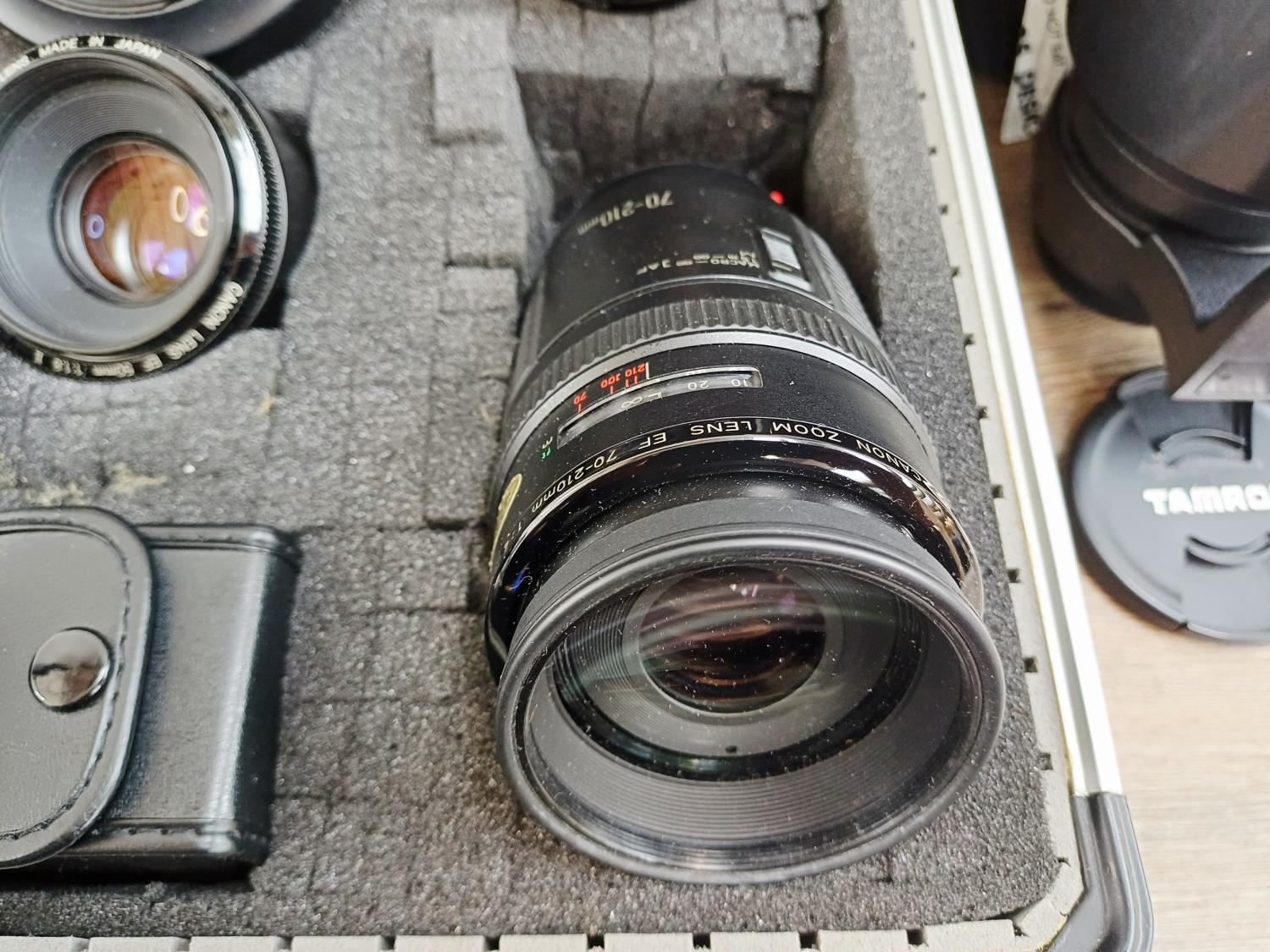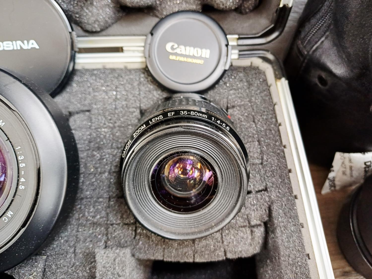 A flight case containing Canon EOS 5 advanced autofocus 35mm SLR camera body, EF 1:1.8 II 50mm lens, Cosina MC 1:3.5-4.5 19-35mm super wide angle lens for Canon AF, EF 1:4-5.6 35-80mm zoom lens, EF 1:4 70-210mm zoom lens and cased Jessop MC 2x tele-converter for Canon AF, Canon EOS 500 autofocus 35mm SLR camera body together with cased Tamron LD 1:5.6 200-400mm lens for Canon AF, Centon PV23 tripod, boxed Olympus Trip AF S-2 autofocus point-and-shoot camera, boxed Canon 60 T3 remote switch and Canon EOS EH8 LL camera case