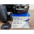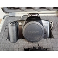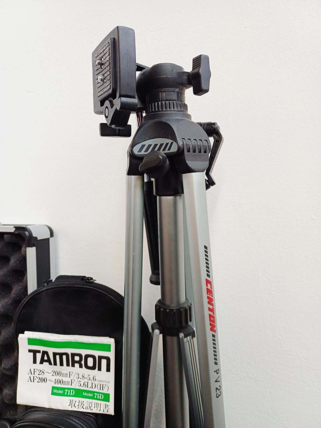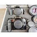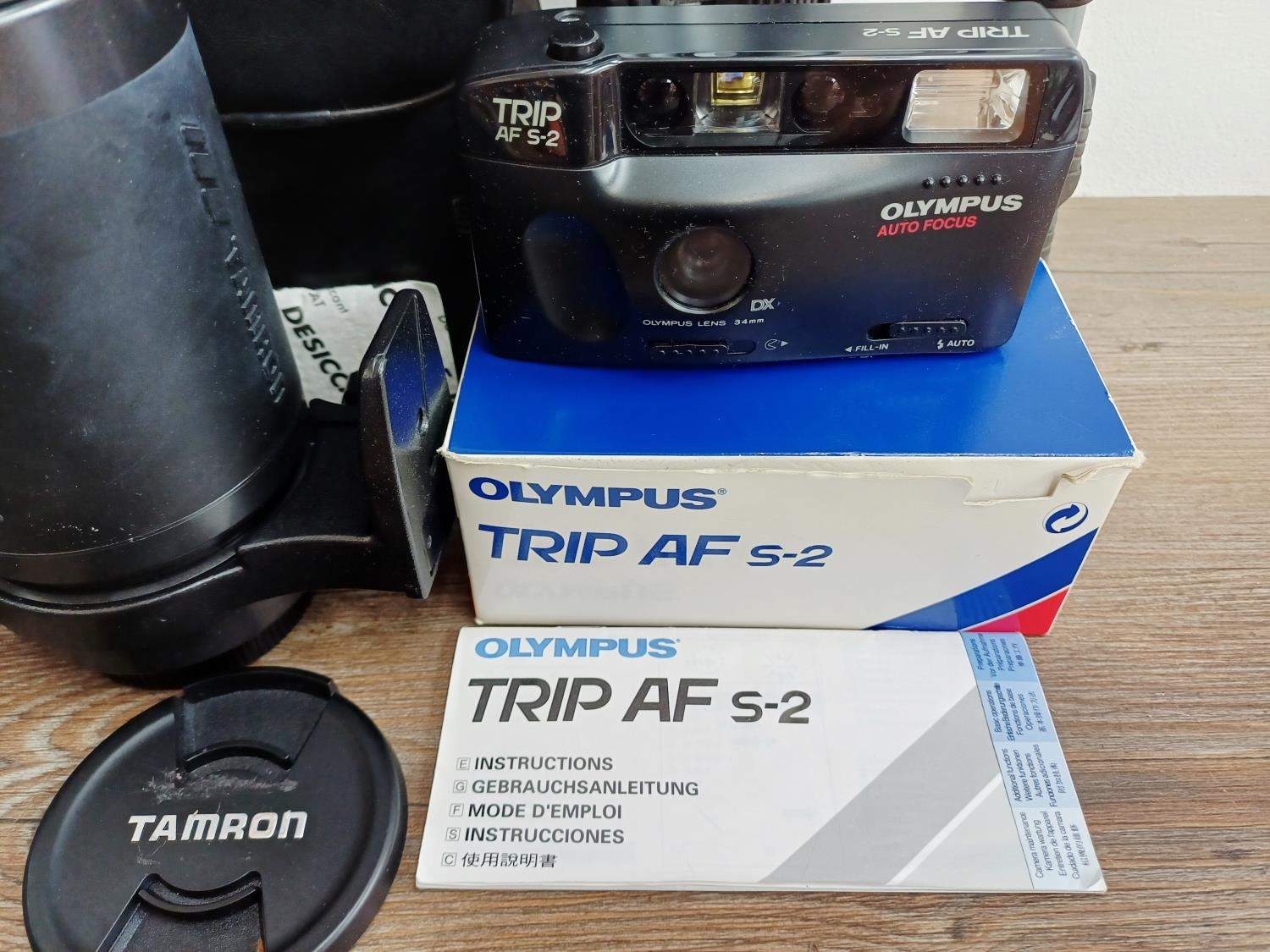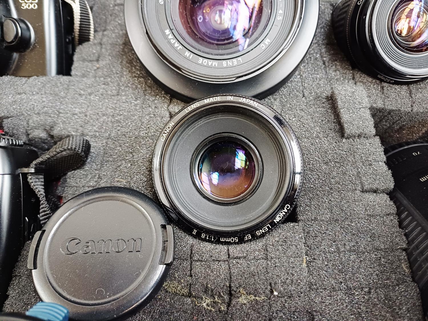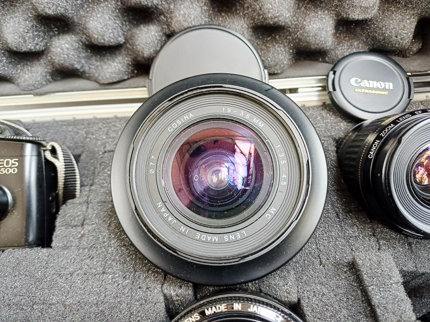 A flight case containing Canon EOS 5 advanced autofocus 35mm SLR camera body, EF 1:1.8 II 50mm lens, Cosina MC 1:3.5-4.5 19-35mm super wide angle lens for Canon AF, EF 1:4-5.6 35-80mm zoom lens, EF 1:4 70-210mm zoom lens and cased Jessop MC 2x tele-converter for Canon AF, Canon EOS 500 autofocus 35mm SLR camera body together with cased Tamron LD 1:5.6 200-400mm lens for Canon AF, Centon PV23 tripod, boxed Olympus Trip AF S-2 autofocus point-and-shoot camera, boxed Canon 60 T3 remote switch and Canon EOS EH8 LL camera case