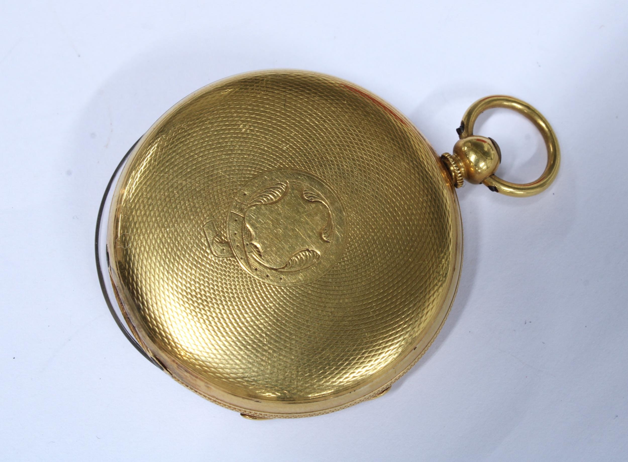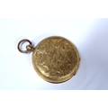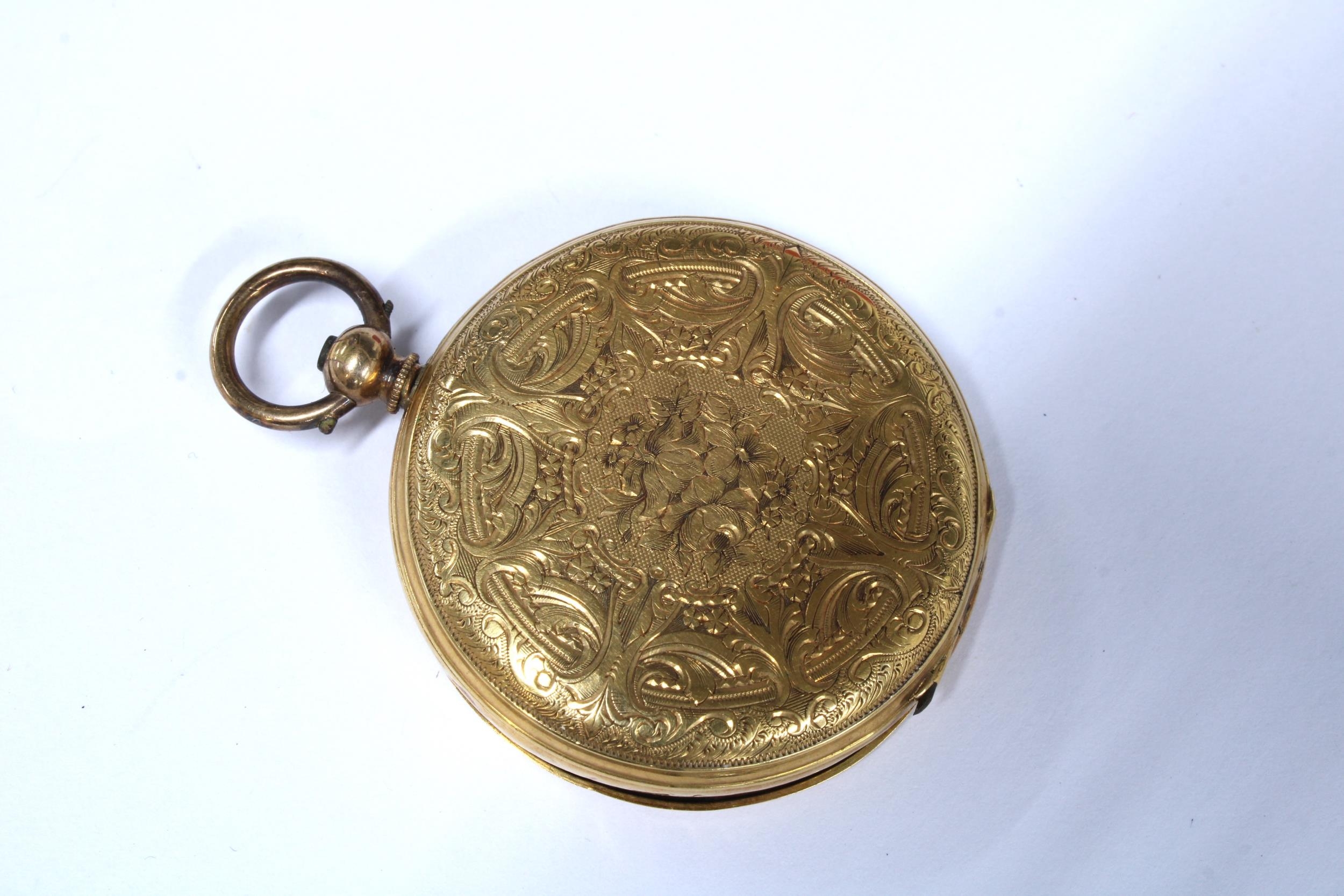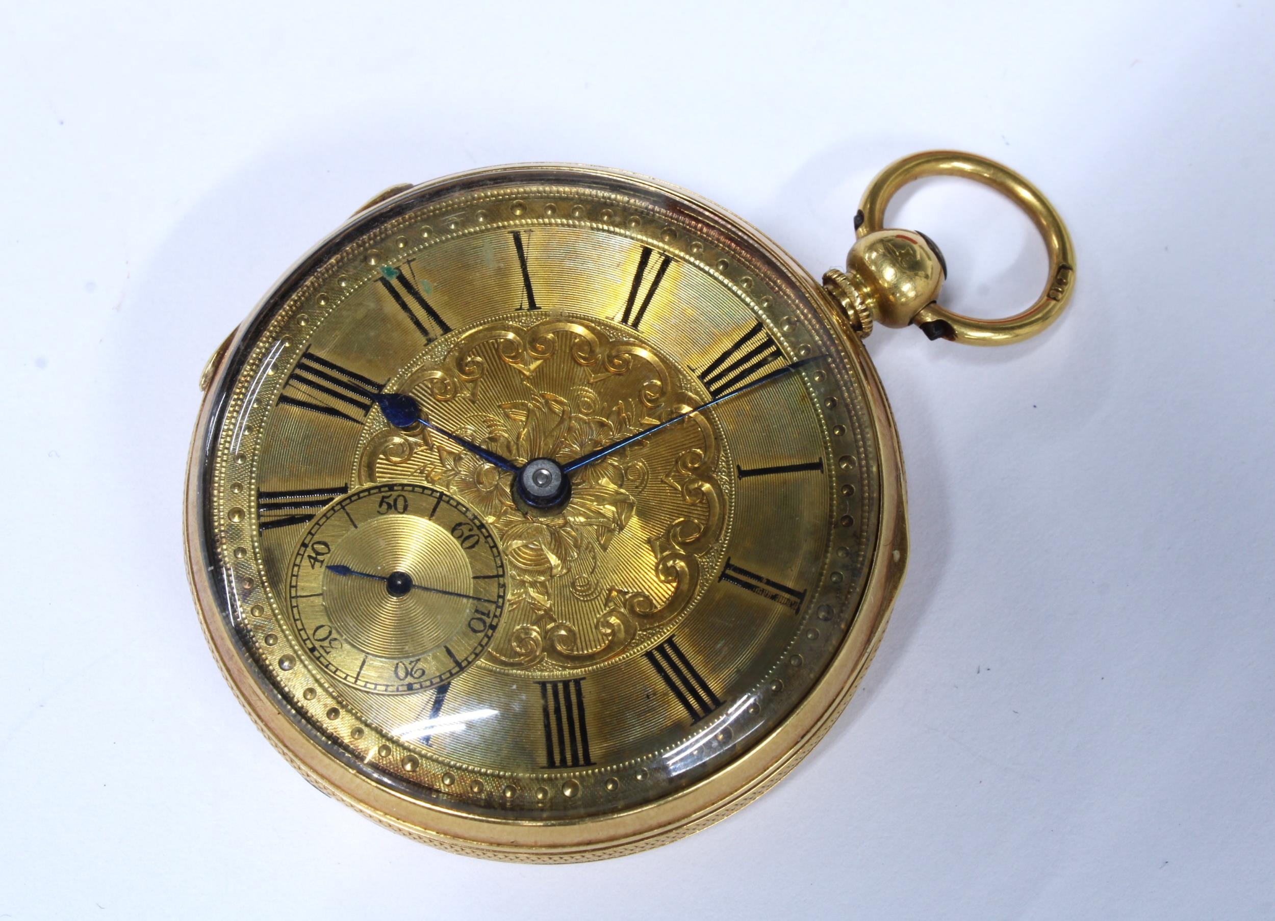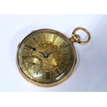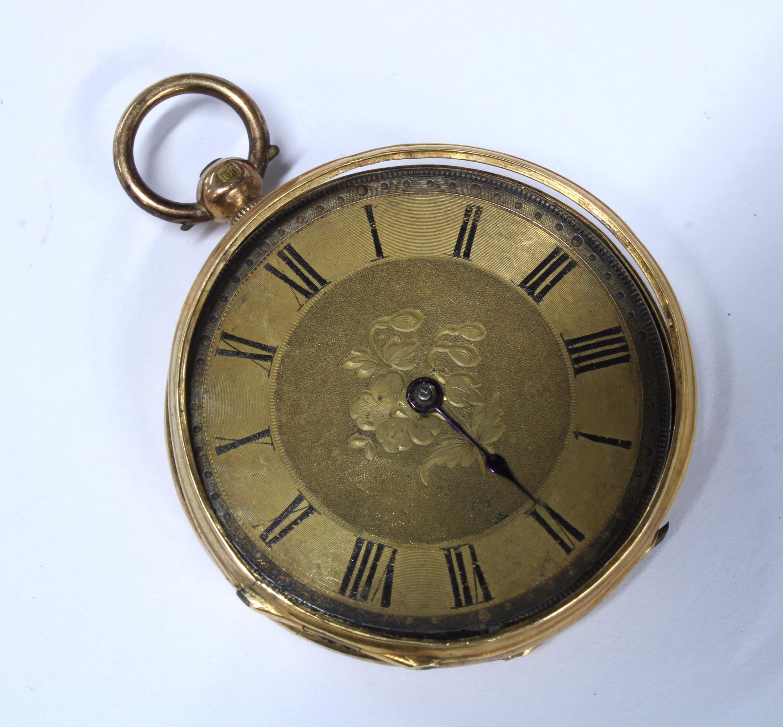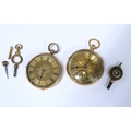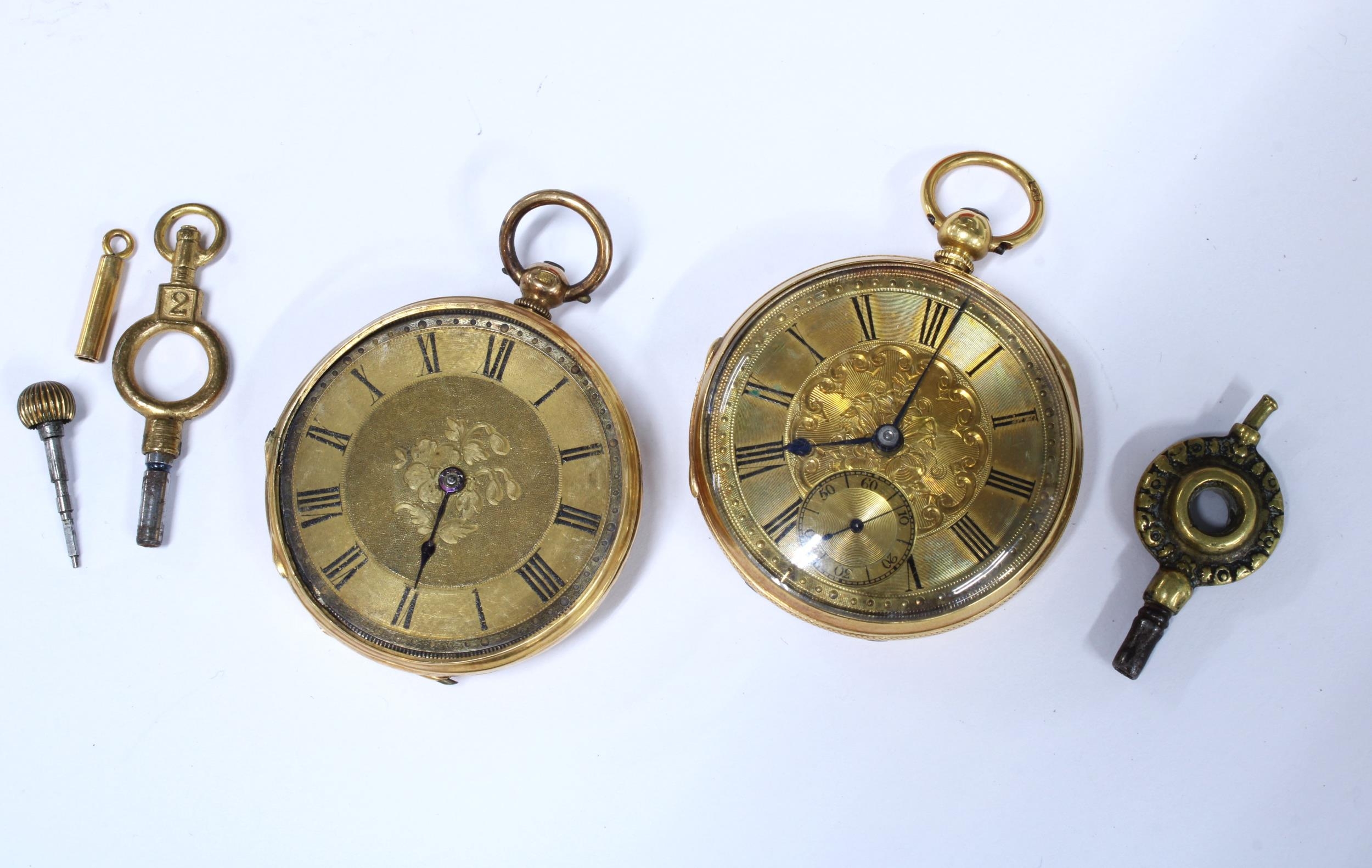 Ladies gold open face fob watch, dust cover with indistinct marks and suspension loop marked 18CT ( glass cover is loose) together with another fob watch, case stamped K18, with miscellaneous key winders (glass cover and one hand missing) (2)