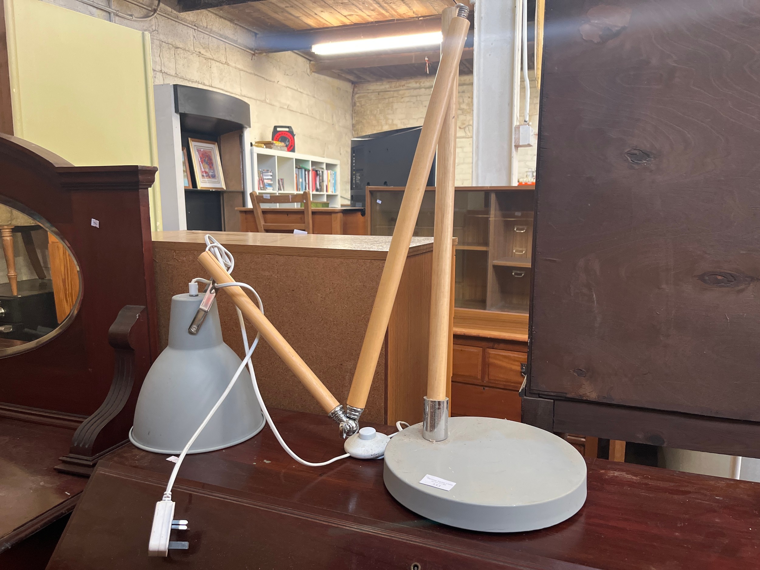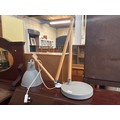 FLOOR STANDING LAMP WITH GREY METAL BASE AND SHADE (STAND NEEDS ATTENTION)