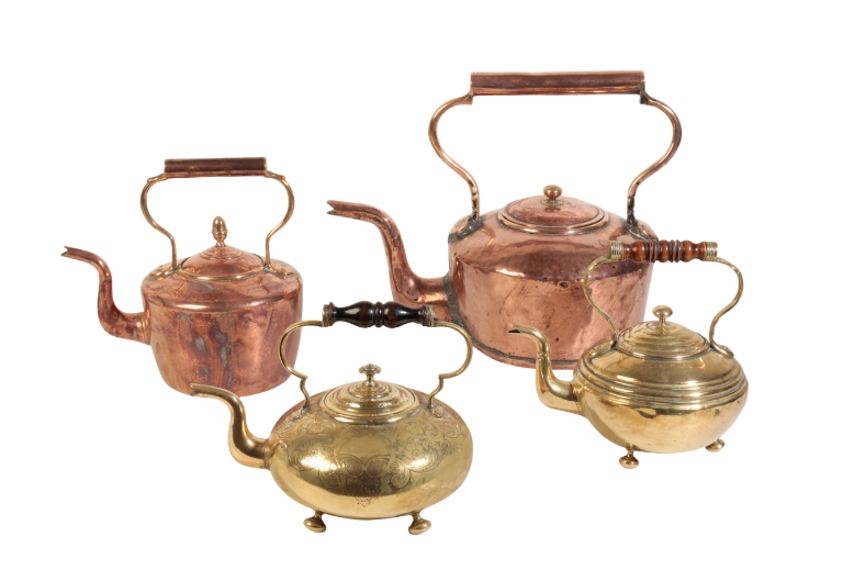 TWO VICTORIAN BRASS TODDY KETTLES circa 1870, one with engraved floral decoration, the other with bands of ribbing, both with turned wood handles; and two Victorian copper kettles, last quarter 19th century, The toddy kettles: 22 and 23cm high respectively