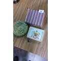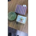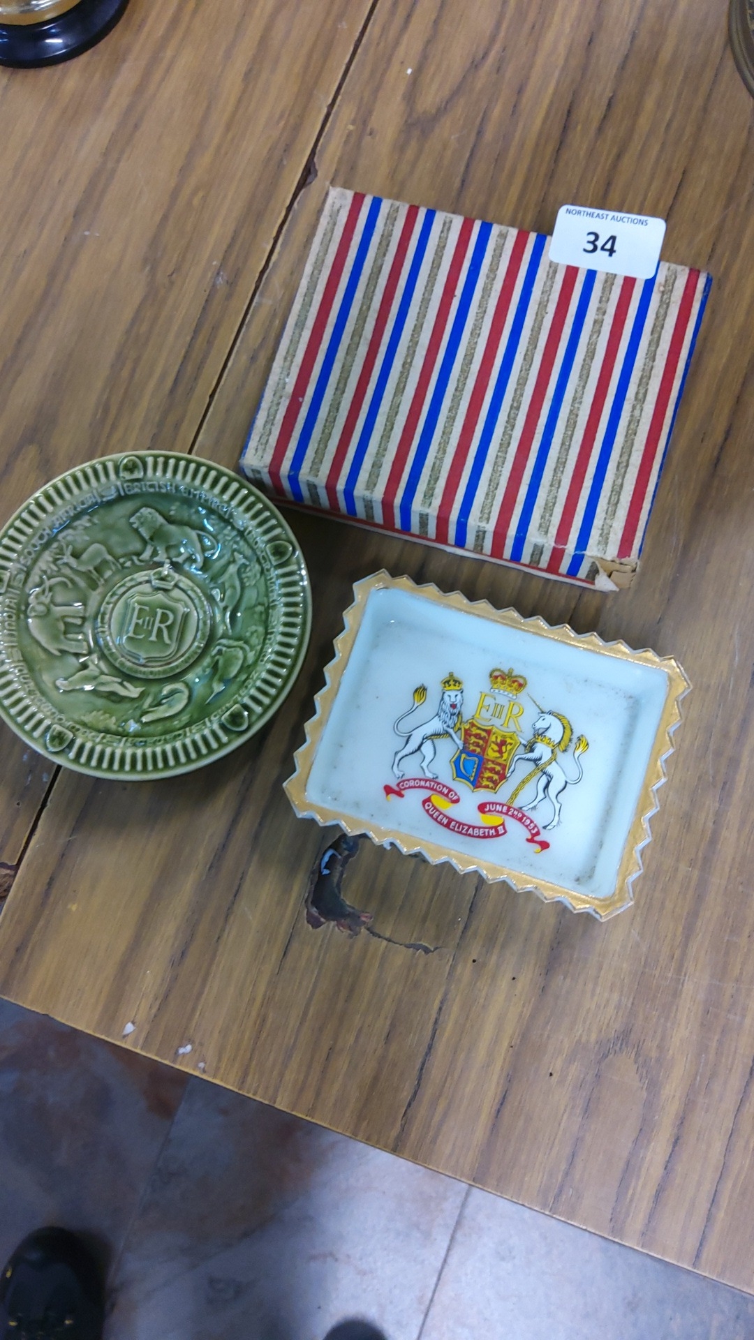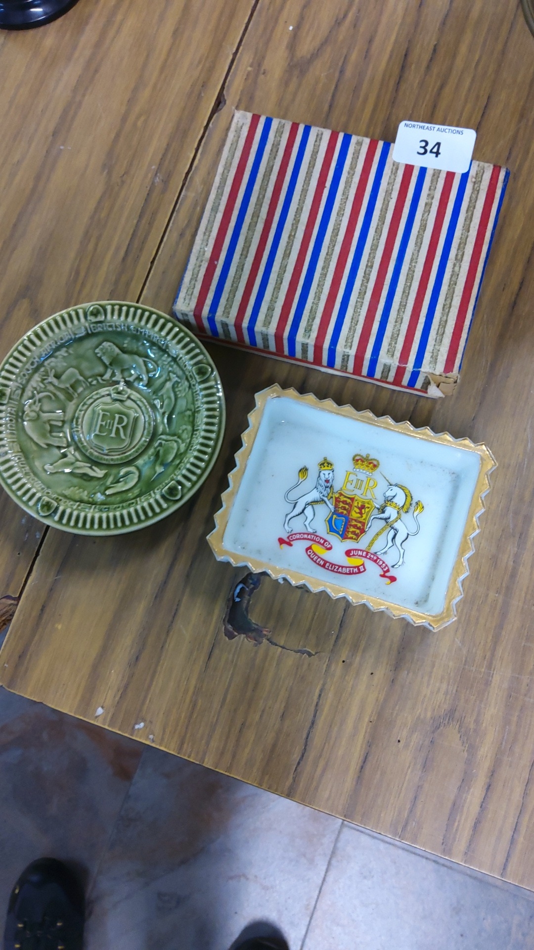 Two Queen Elizabeth II coronation commemoratives, comprising a green glazed ceramic dish with crowned E II R emblem, and a small rectangular glass or ceramic tray with royal arms and "Coronation of Queen Elizabeth II, June 2nd 1953" motif, with original striped presentation box.