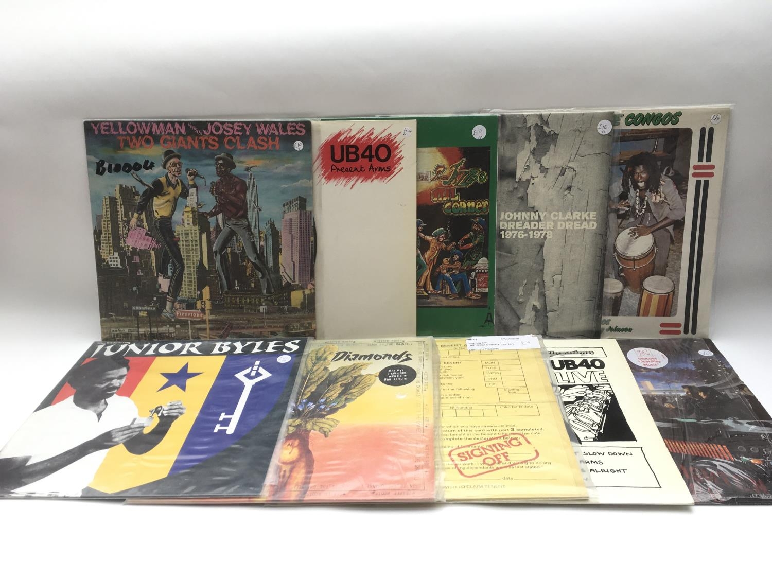 A collection of reggae and dub LPs by various artists including UB40, Mighty Diamonds, Junior Byles and others.