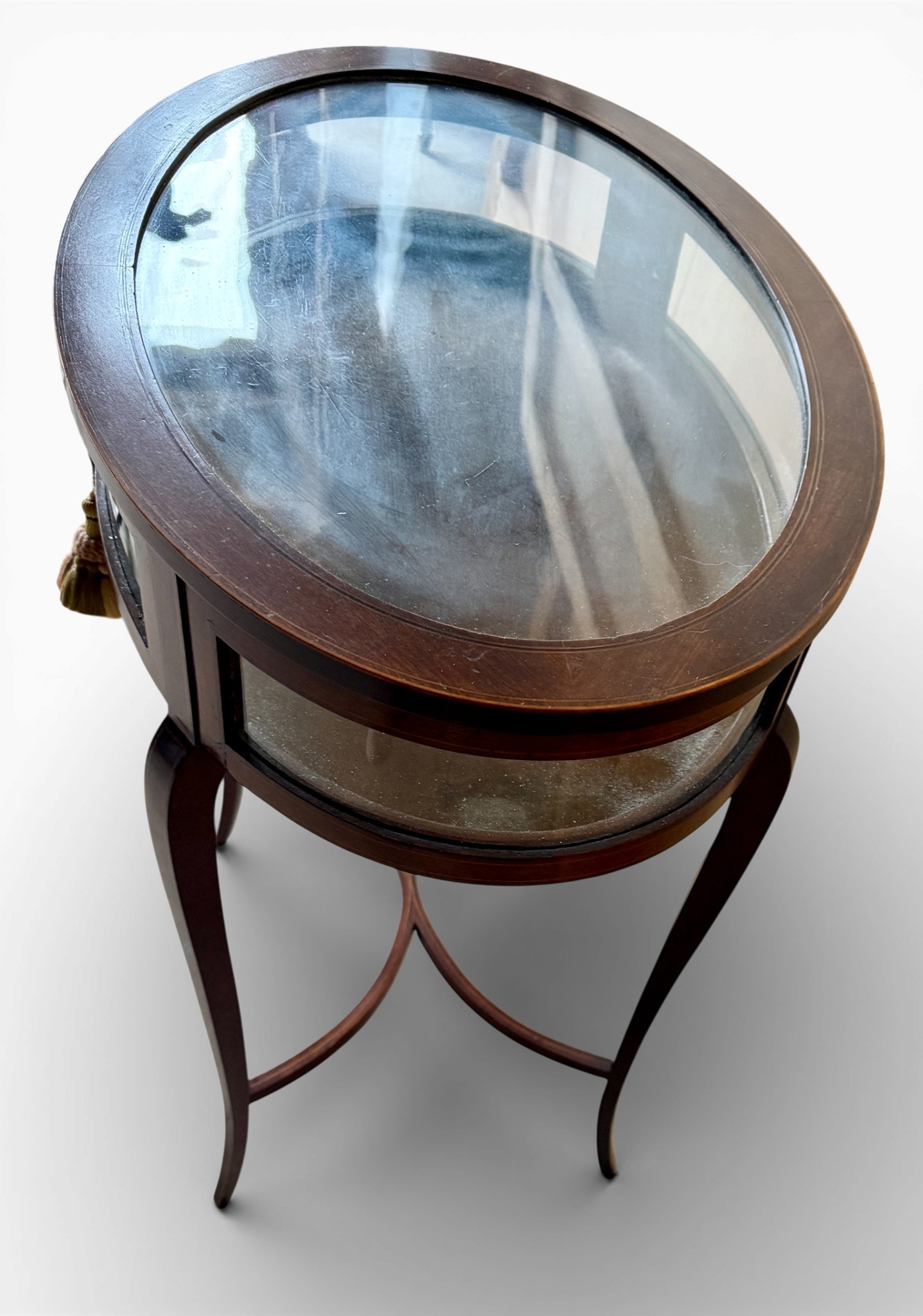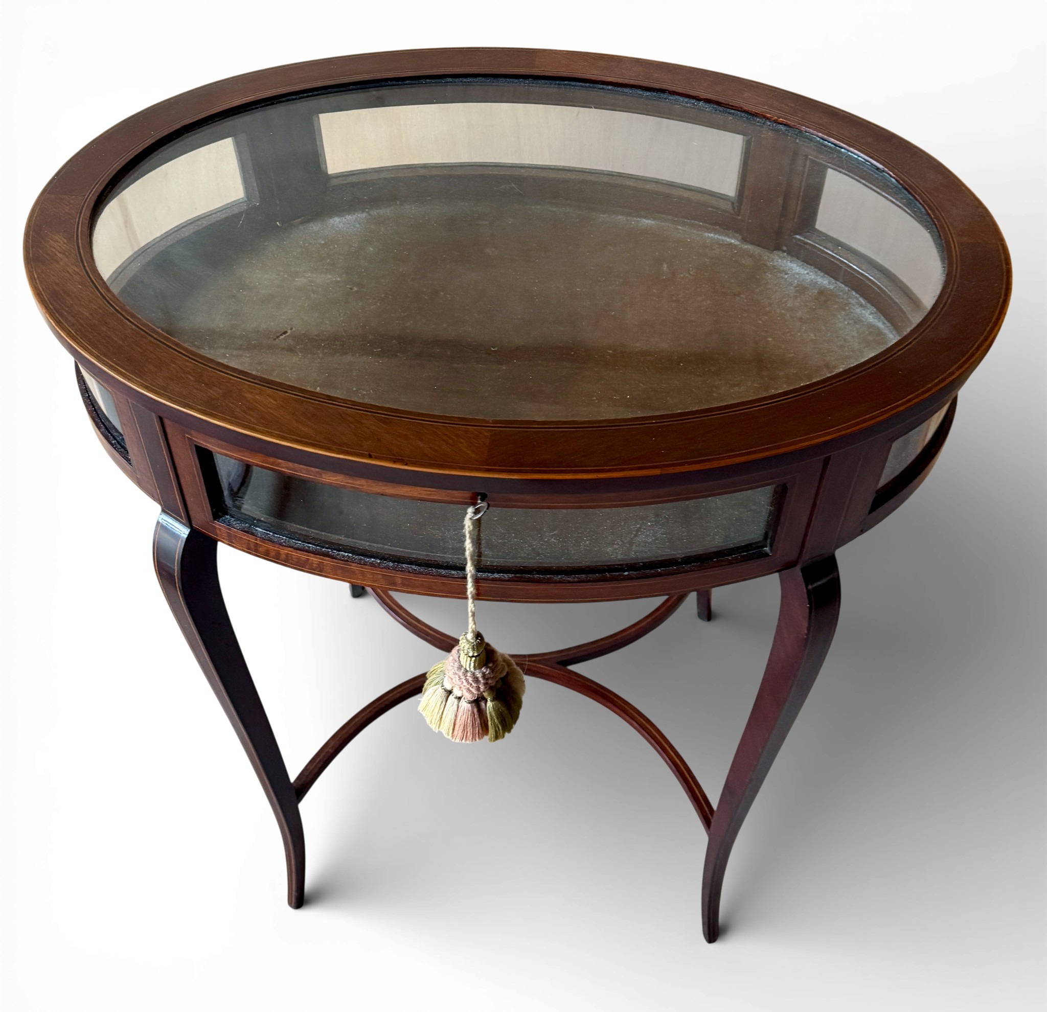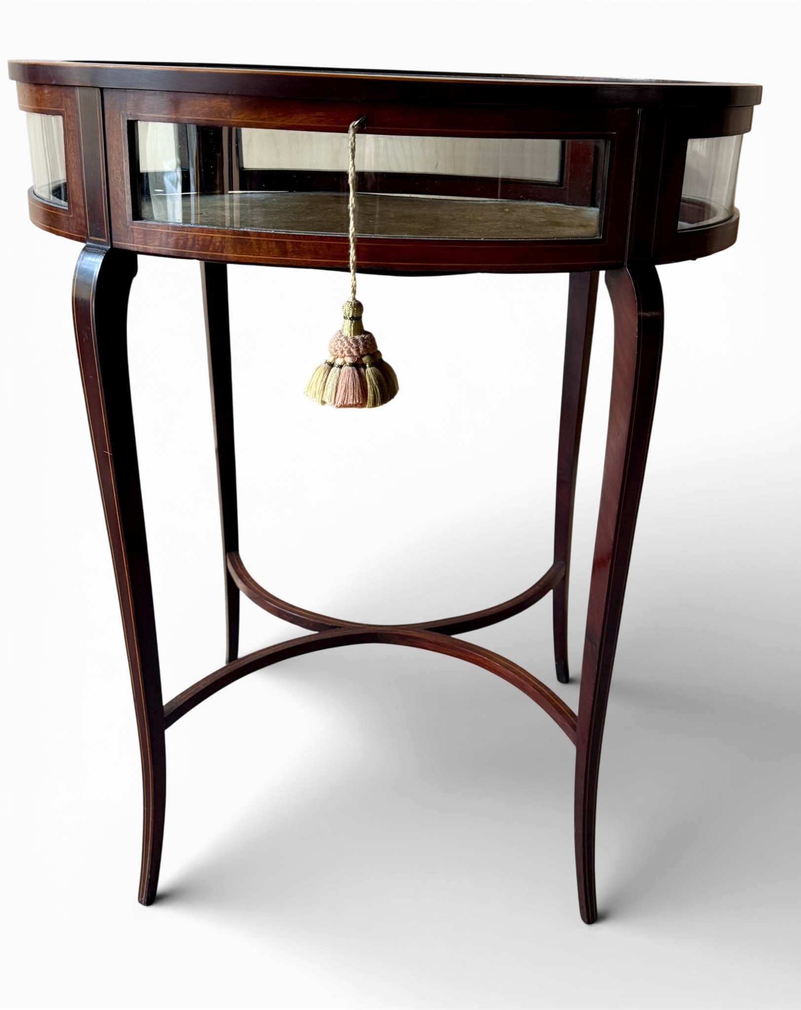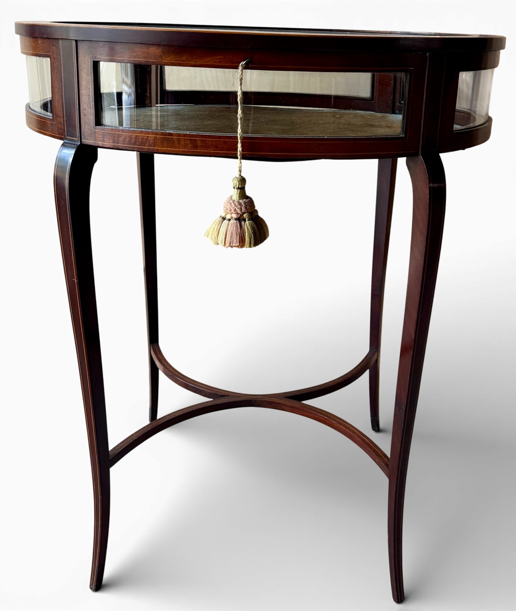 An Edwardian mahogany inlaid bijouterie table. 62cm w x 42cm d x 73cm h.