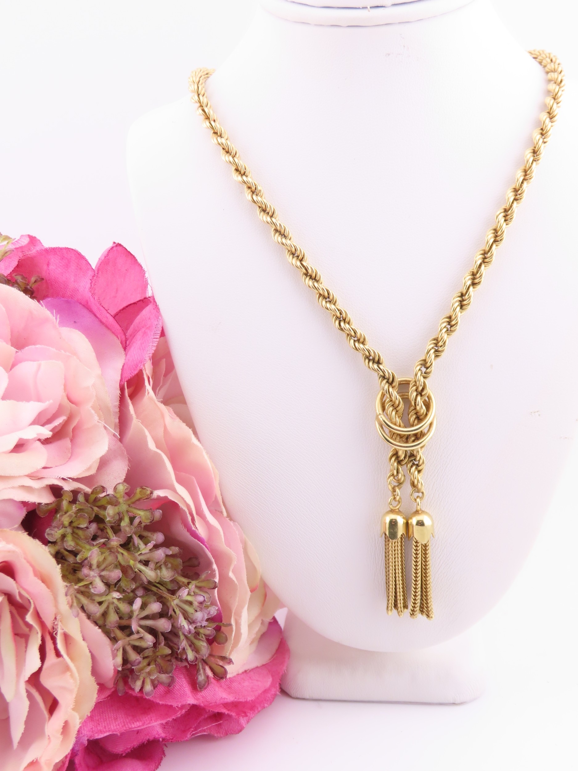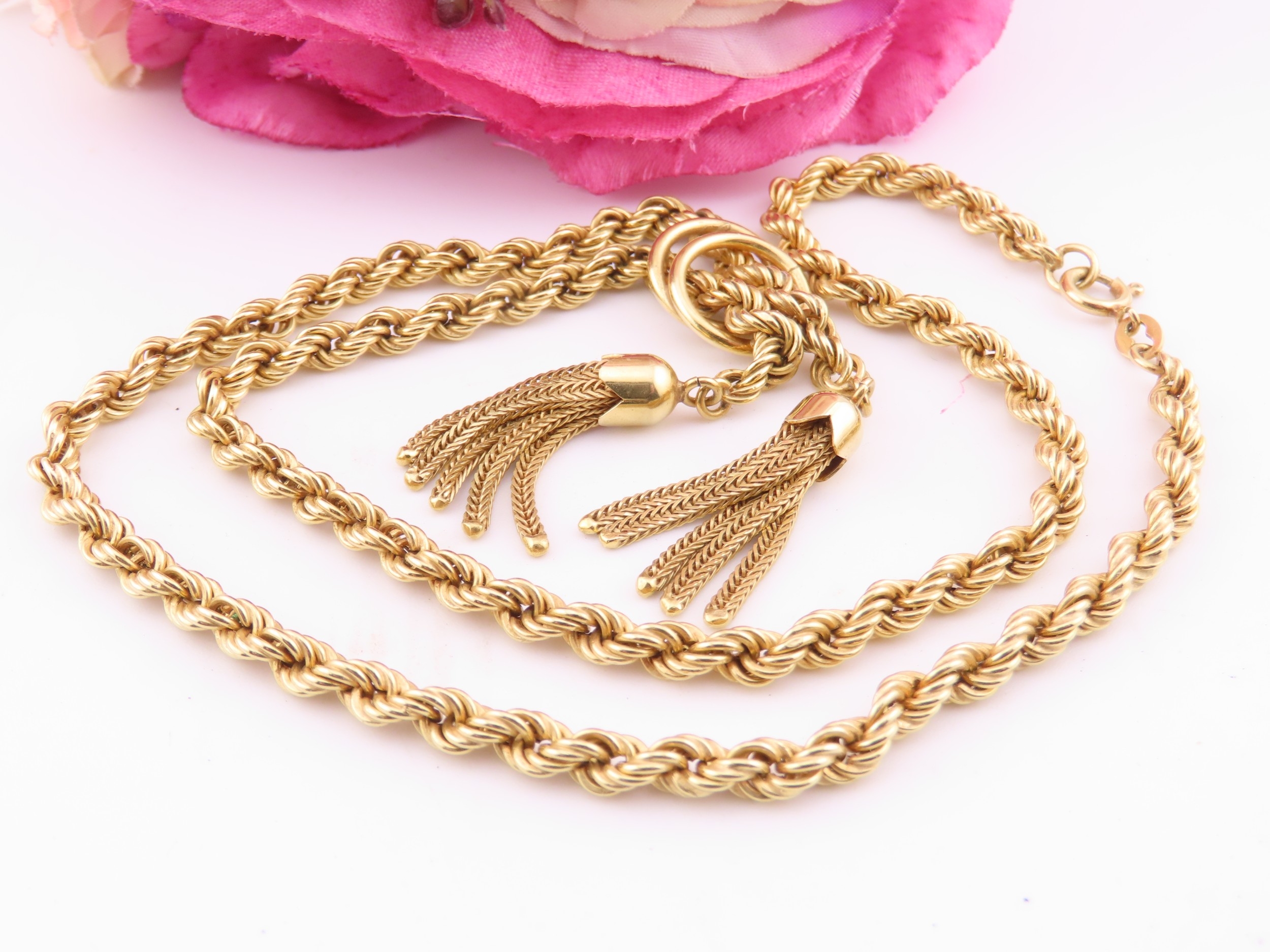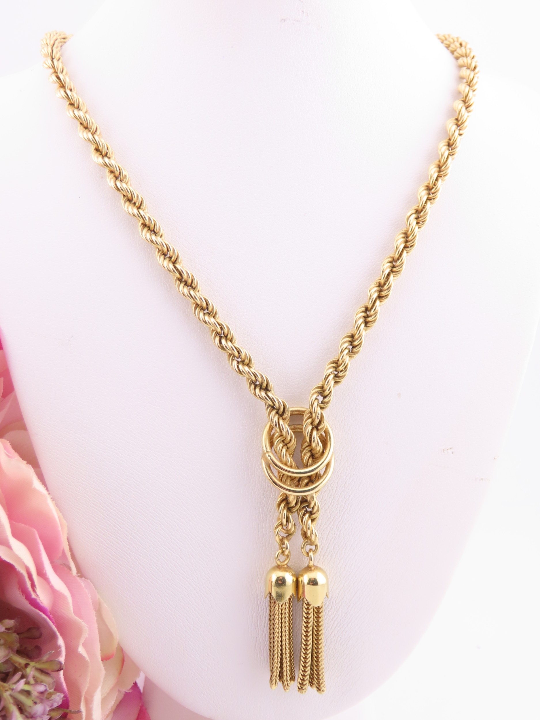 An 18ct gold rope twist necklace suspending a tassel drop. Gross weight 20.7 grams.