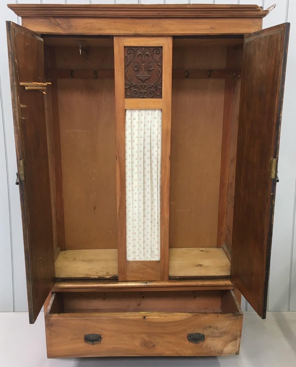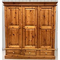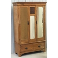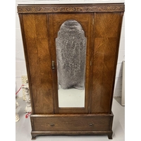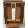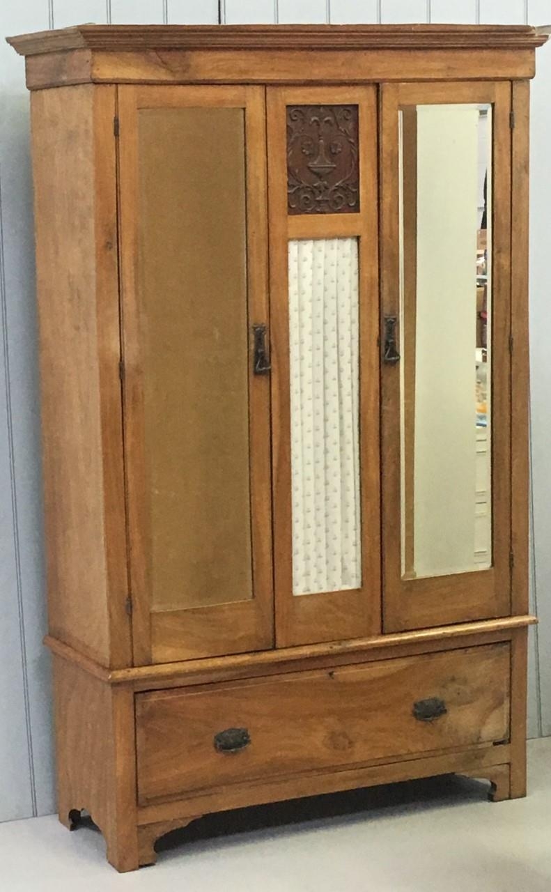 Three piece Double Wardrobe. Double doors aside glass/curtained centrepiece, over a single deep drawer. Bevelled-edged mirror glass doors. Interior brass hooks. No key present.