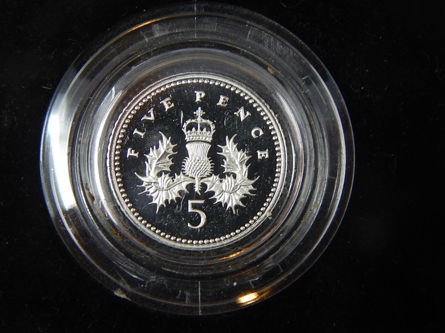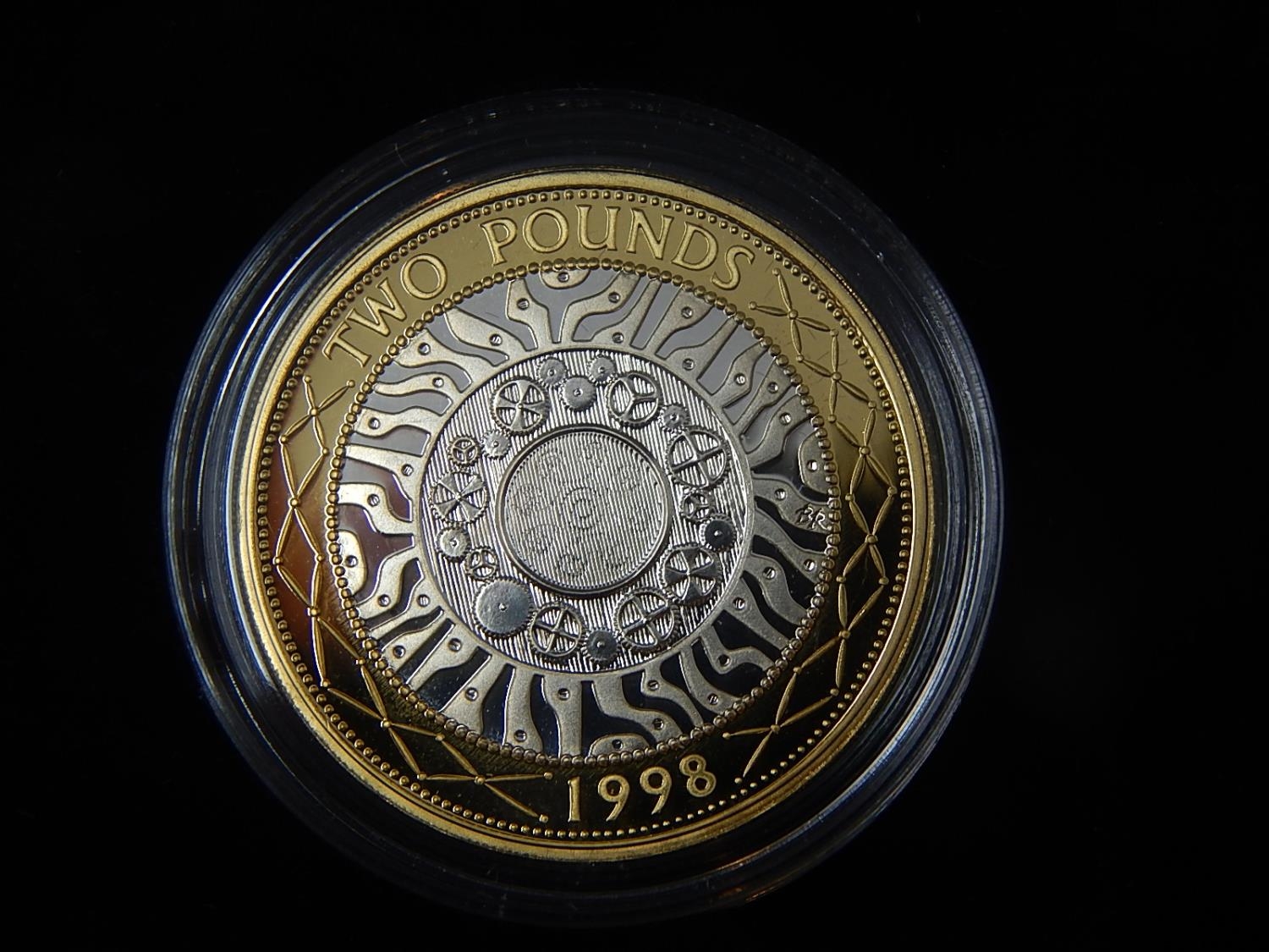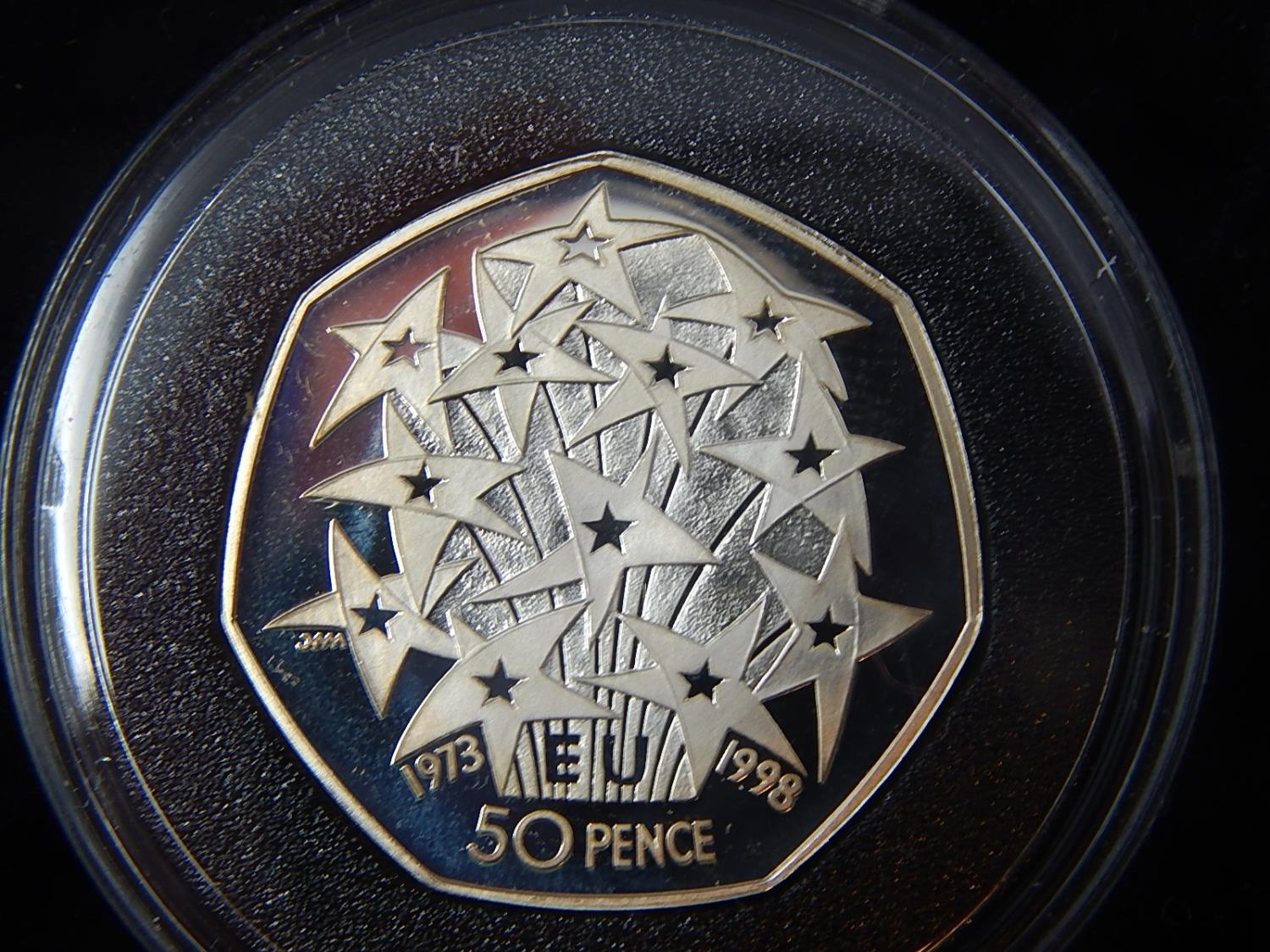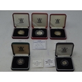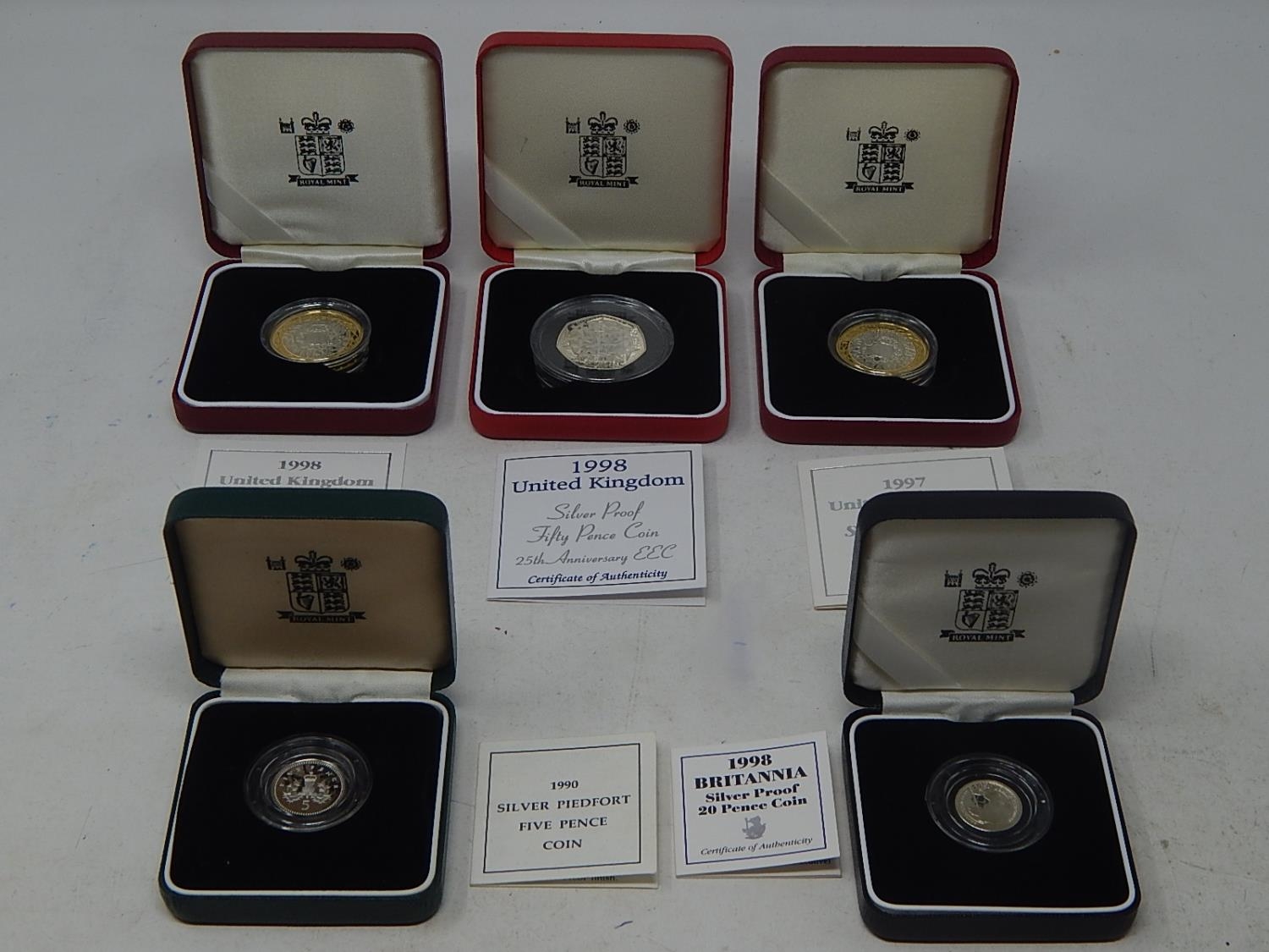 1998 Silver Proof 50p; 1990 Silver Piedfort 5 pence; 1998 Silver proof Britannia 20 pence; 1997 Silver Proof £2 coin; 1998 Silver Proof £5 coin, about as struck, all in original cases of issue with COAs