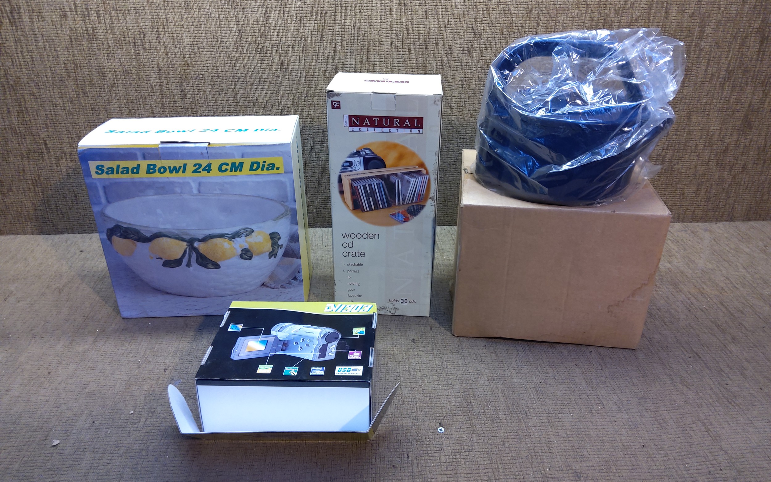 Home commodities including salad bowl and camcorder