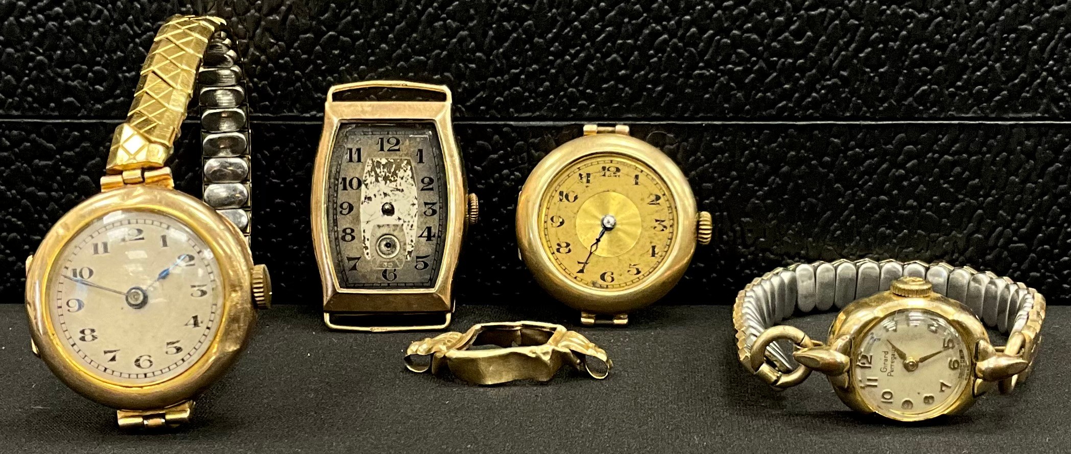 Watches - a 9ct gold cased wristwatch head, compensated 15 jewel movement, one with strap 45.4g gross