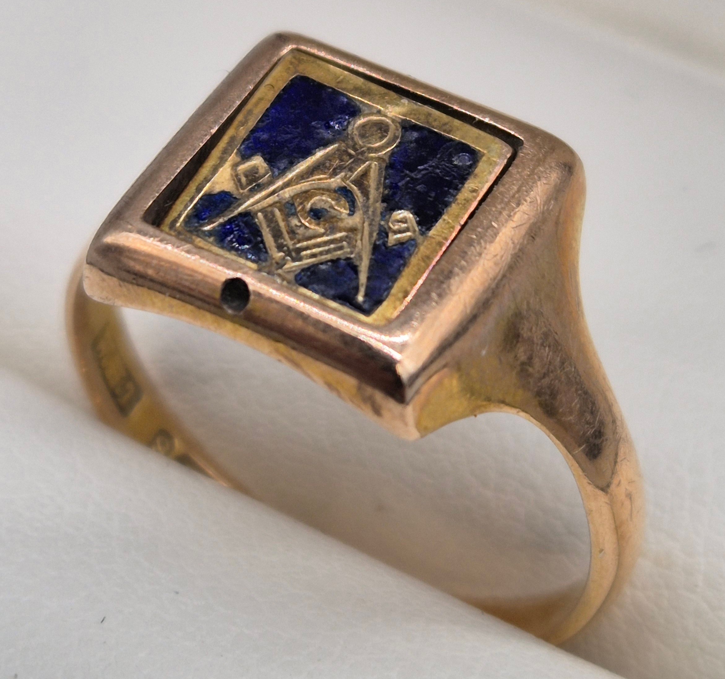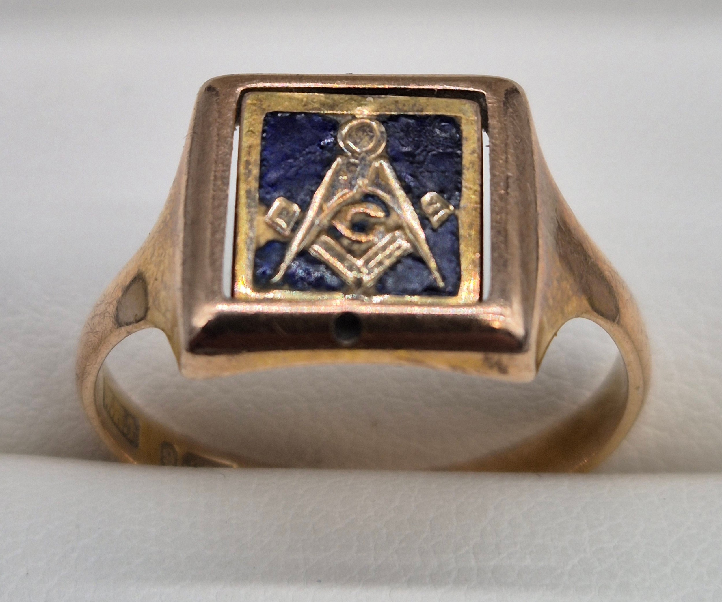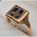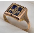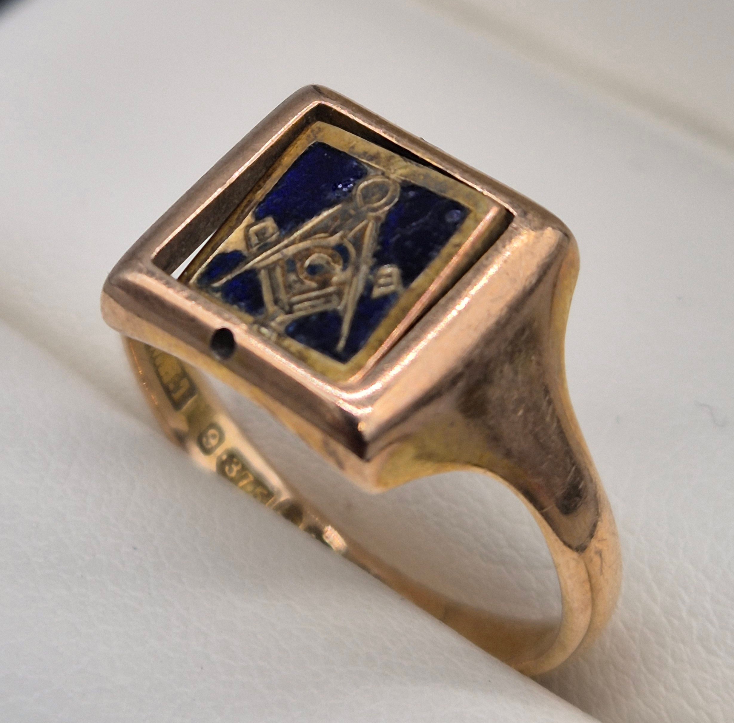 Birmingham 9ct yellow gold and enamel Masonic swivel ring. [Ring size R] [3.97Grams]