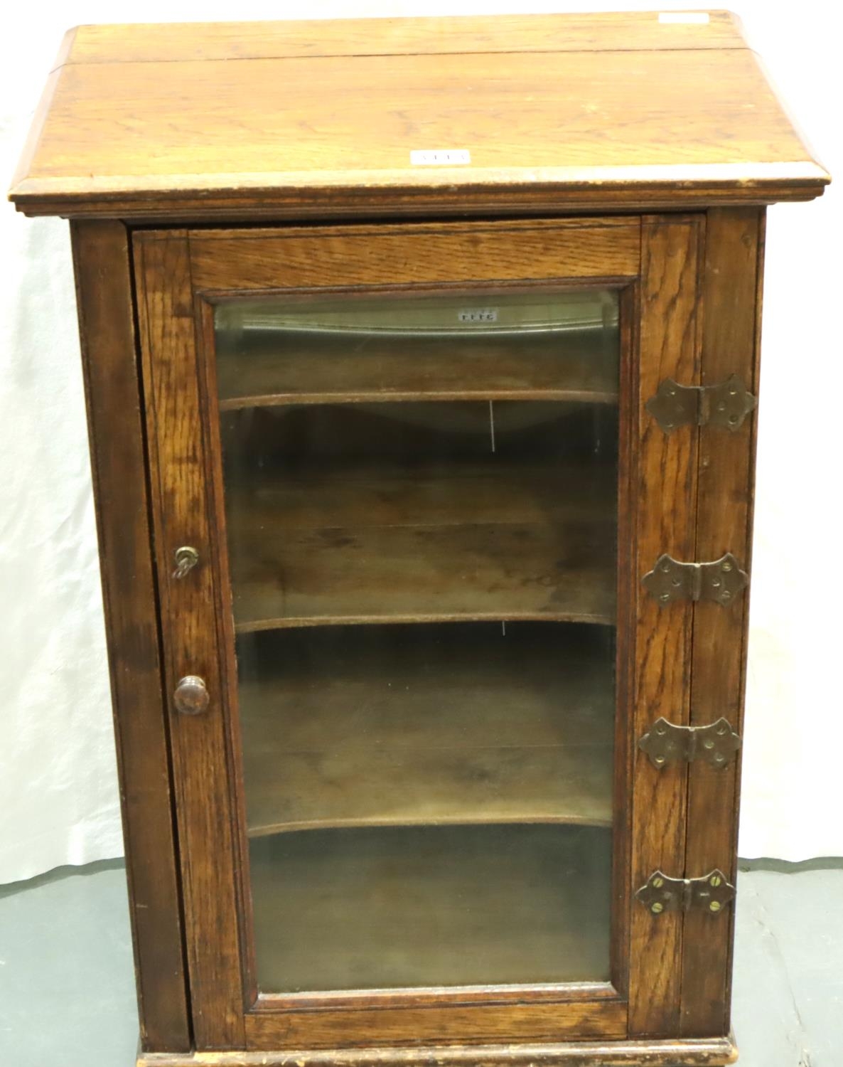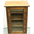 An early 20th century oak music cabinet with single glazed door and internal shelves, 55 x 40 x 86 cm H. Not available for in-house P&P, contact Paul O'Hea at Mailboxes on 01925 659133