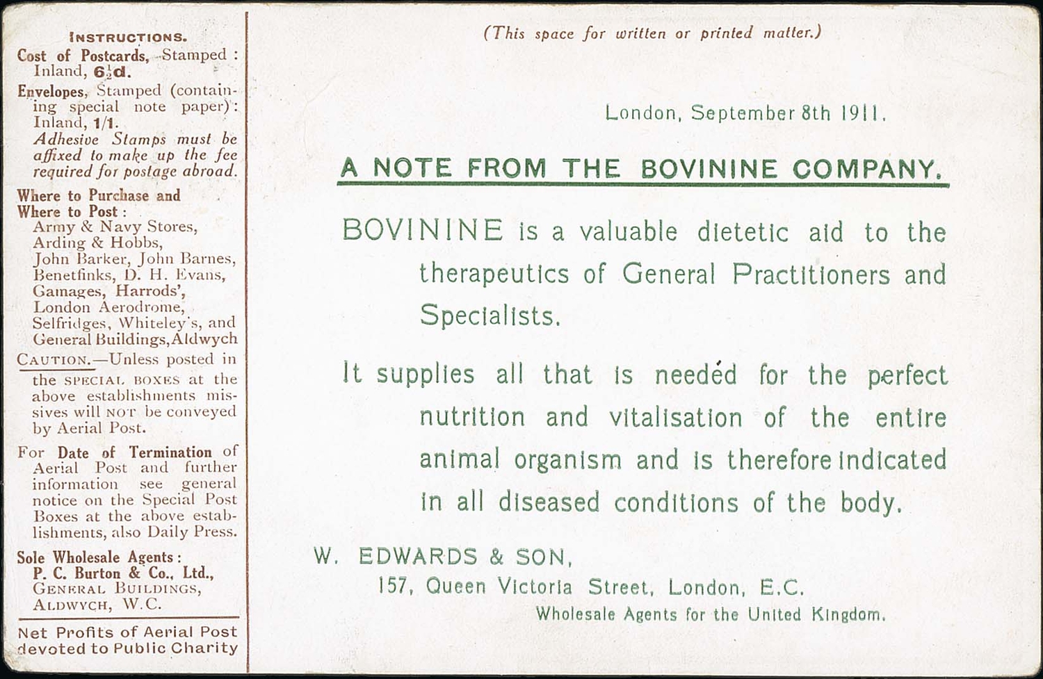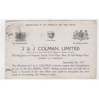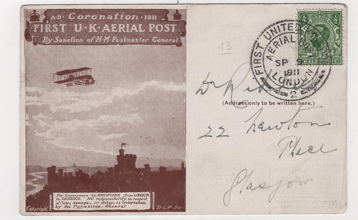 1911 (Sep 9) Brown London postcard with Bovinine Company advert printed on the reverse, used with Aerial Post c.d.s code "2", very minor corner creasing, otherwise fine and a scarce advert. Photo on Page 12.