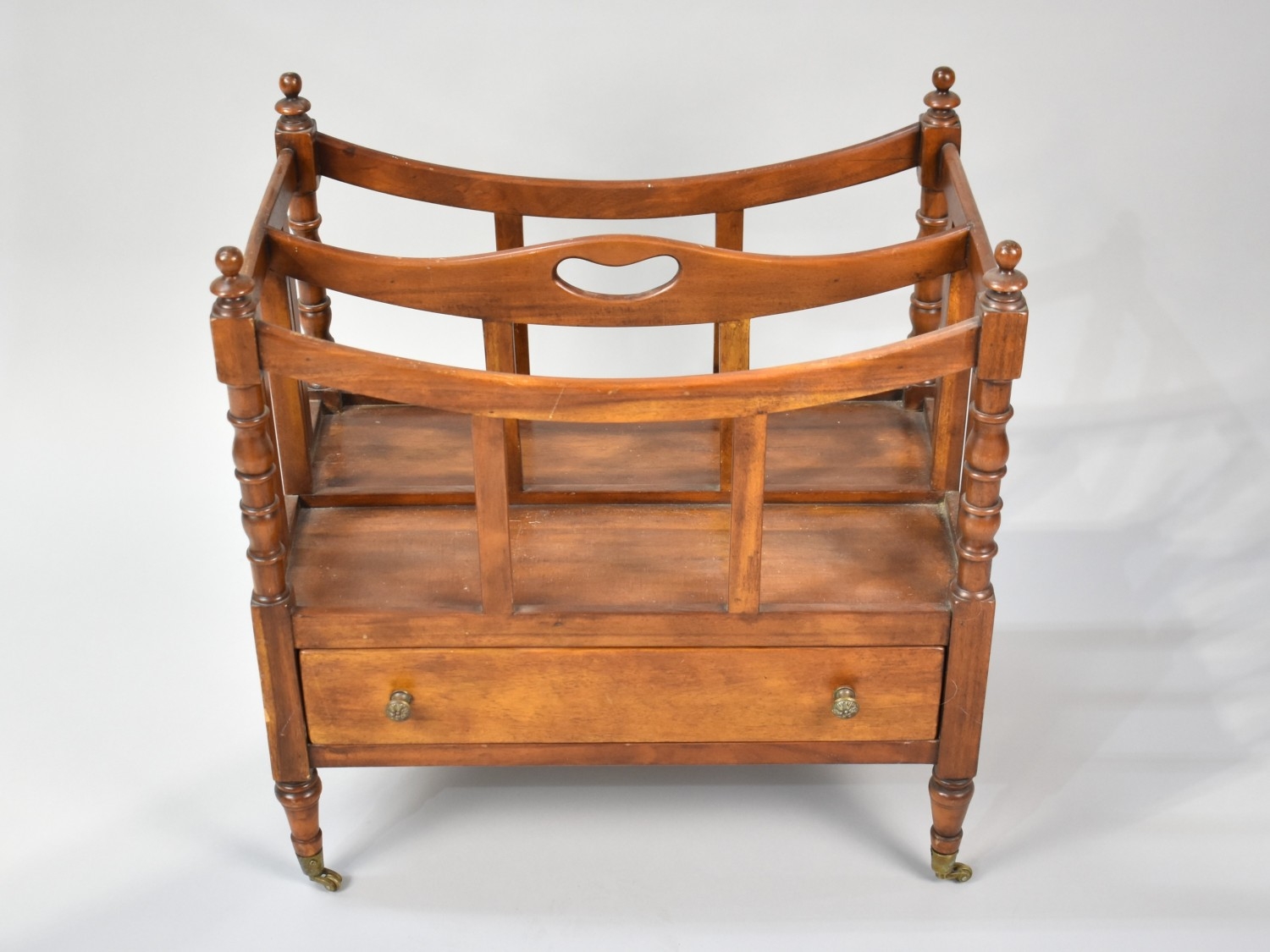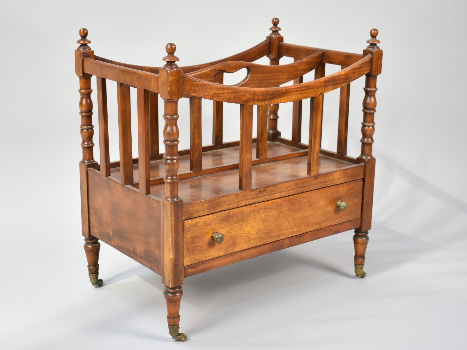 A Reproduction Mahogany Two Section Canterbury with Base Drawer and Turned Supports Culminating in Castors, 51.5cms Wide