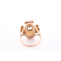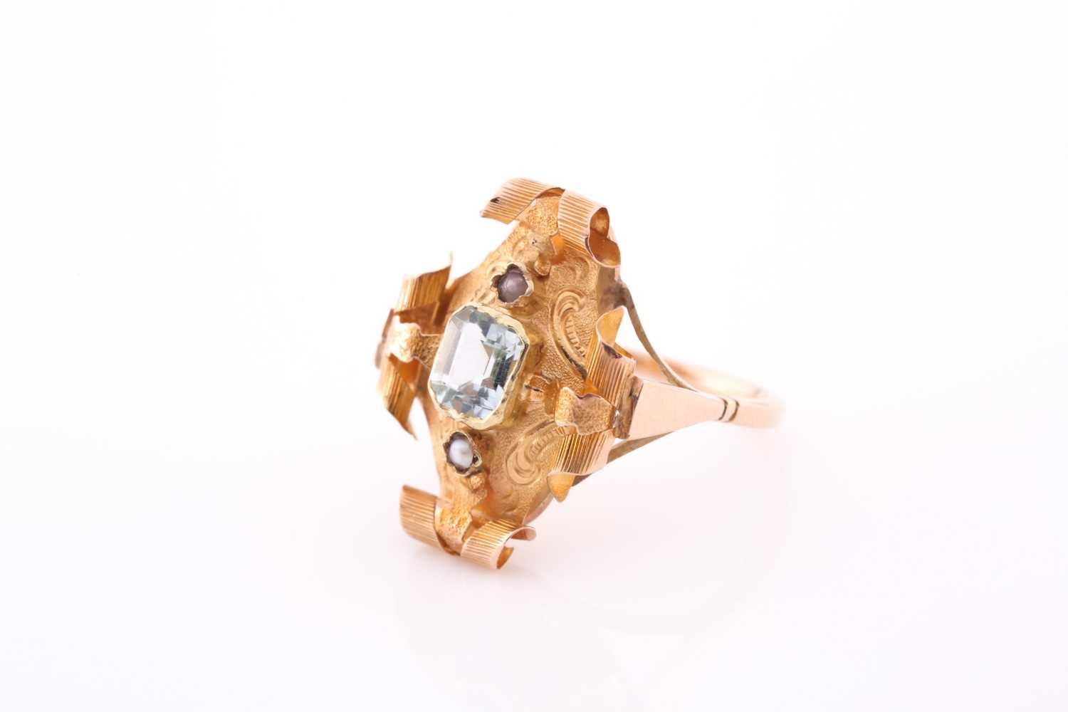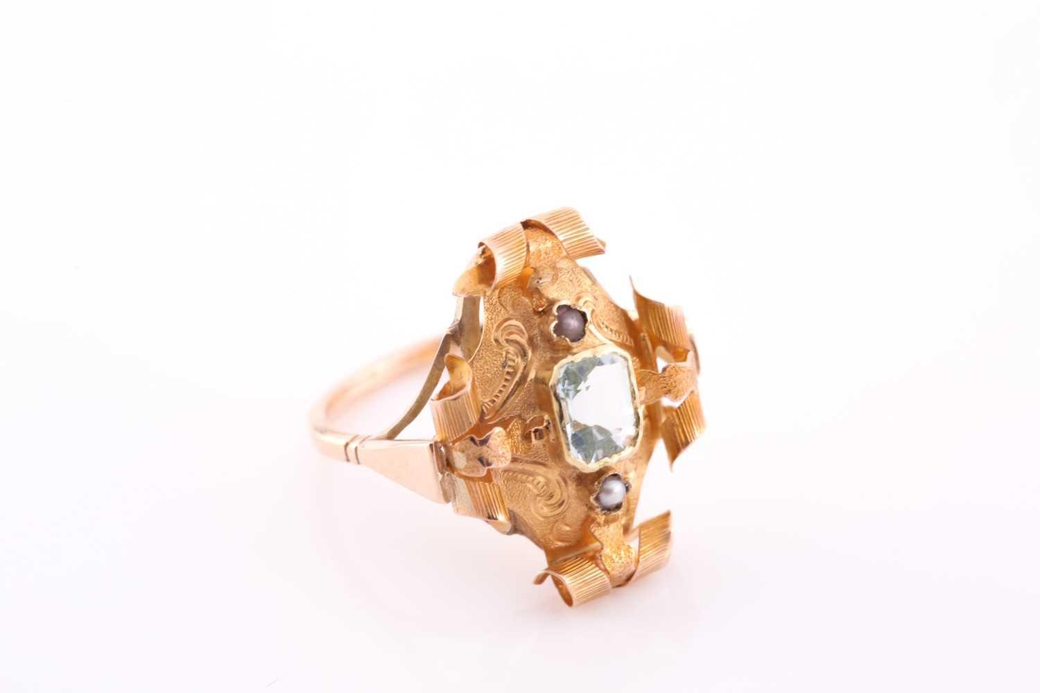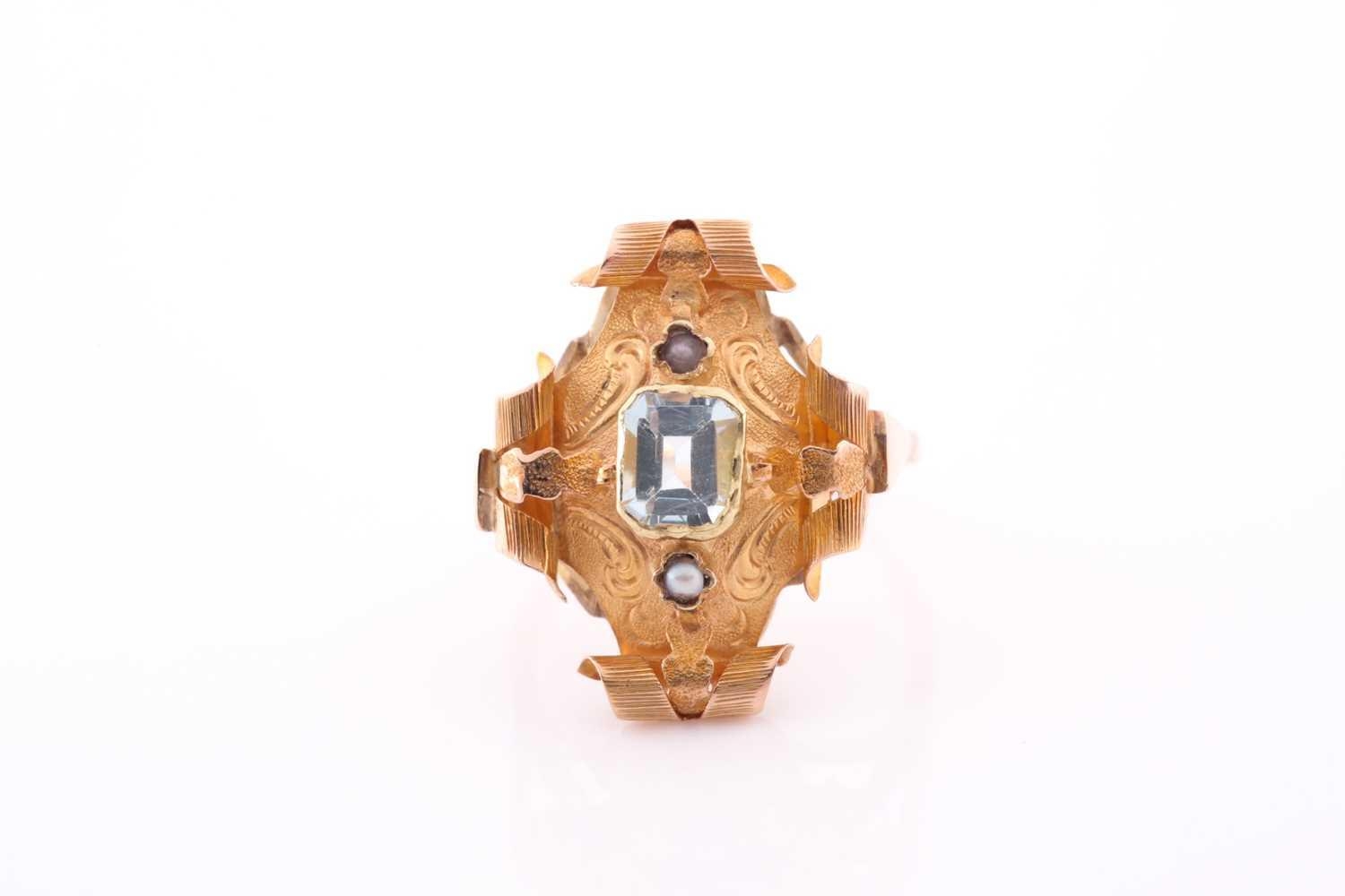A late 19th century yellow metal and aquamarine ring, the ornate rectangular mount with scrolled decoration, centred with a mixed emerald-cut aquamarine, and two small seed pearls, mount 22 x 16 mm, unmarked, size M 1/2, 3.5 grams.