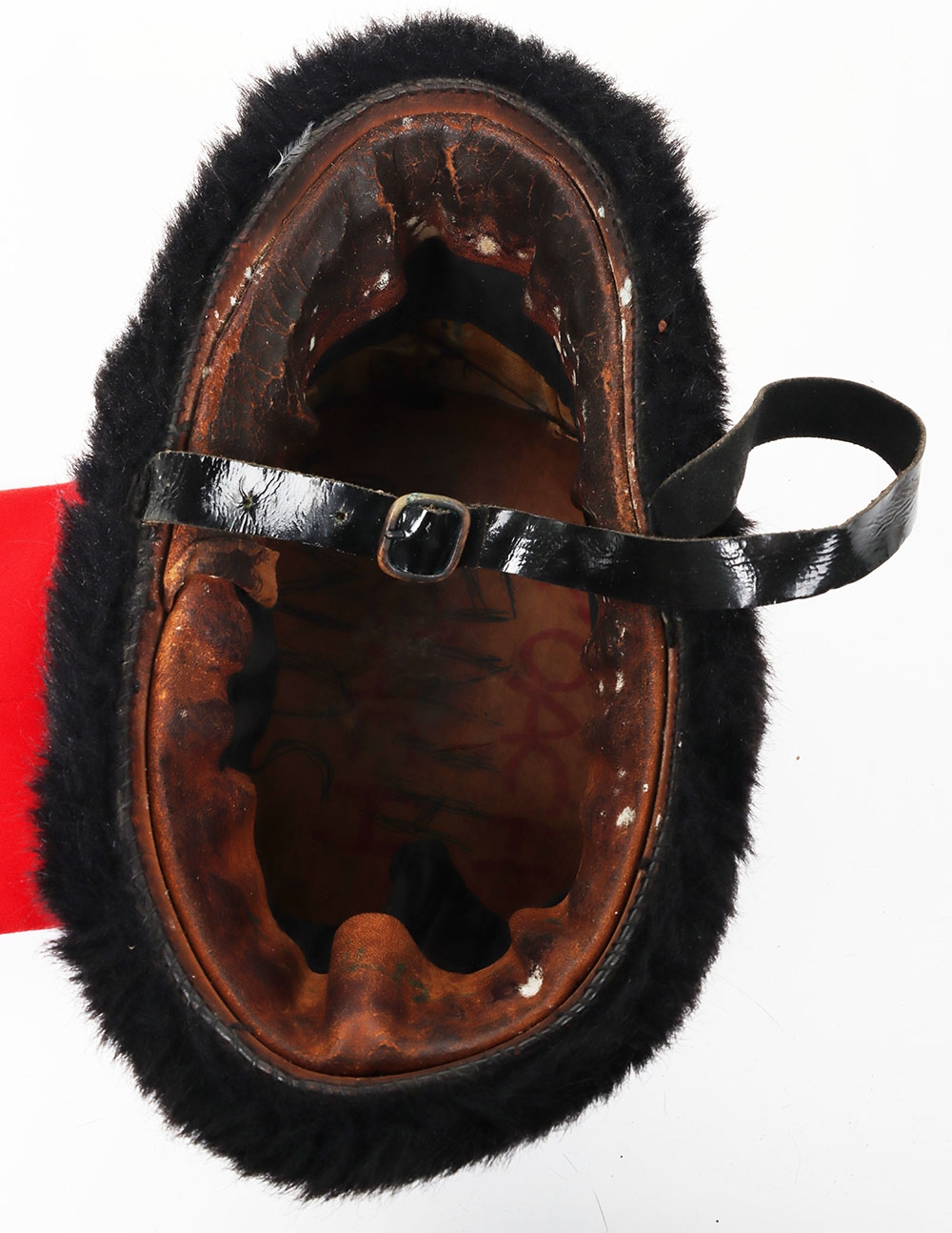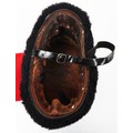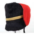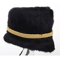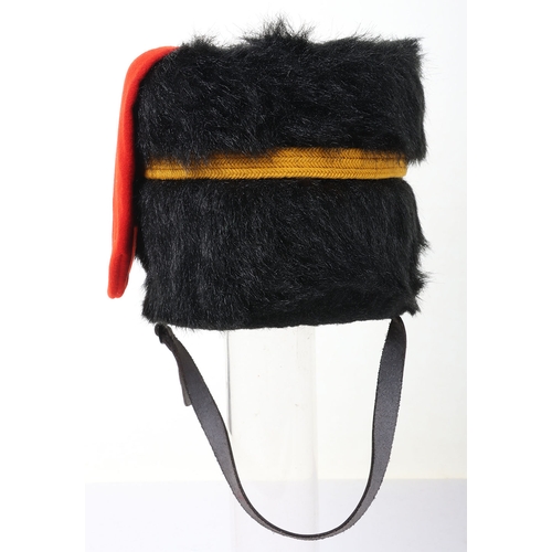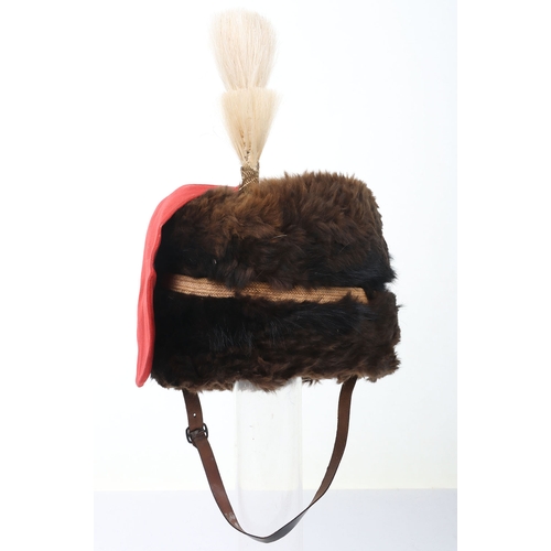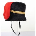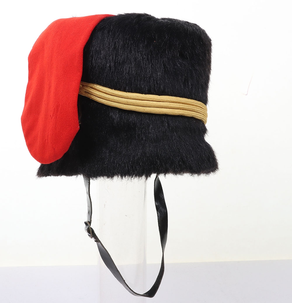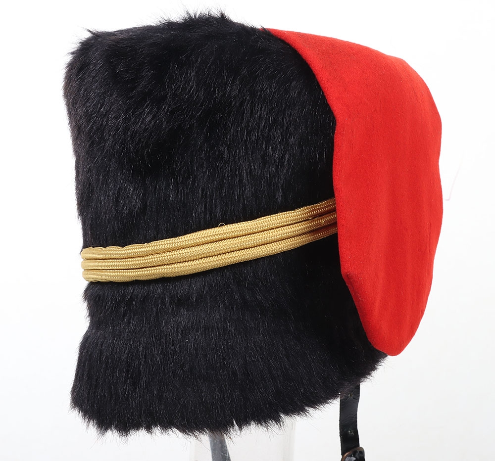 Royal Horse Artillery troopers black fur busby with scarlet bag, leather chin strap. In sound condition, now fitted with gilt cord triple cord cap lines.